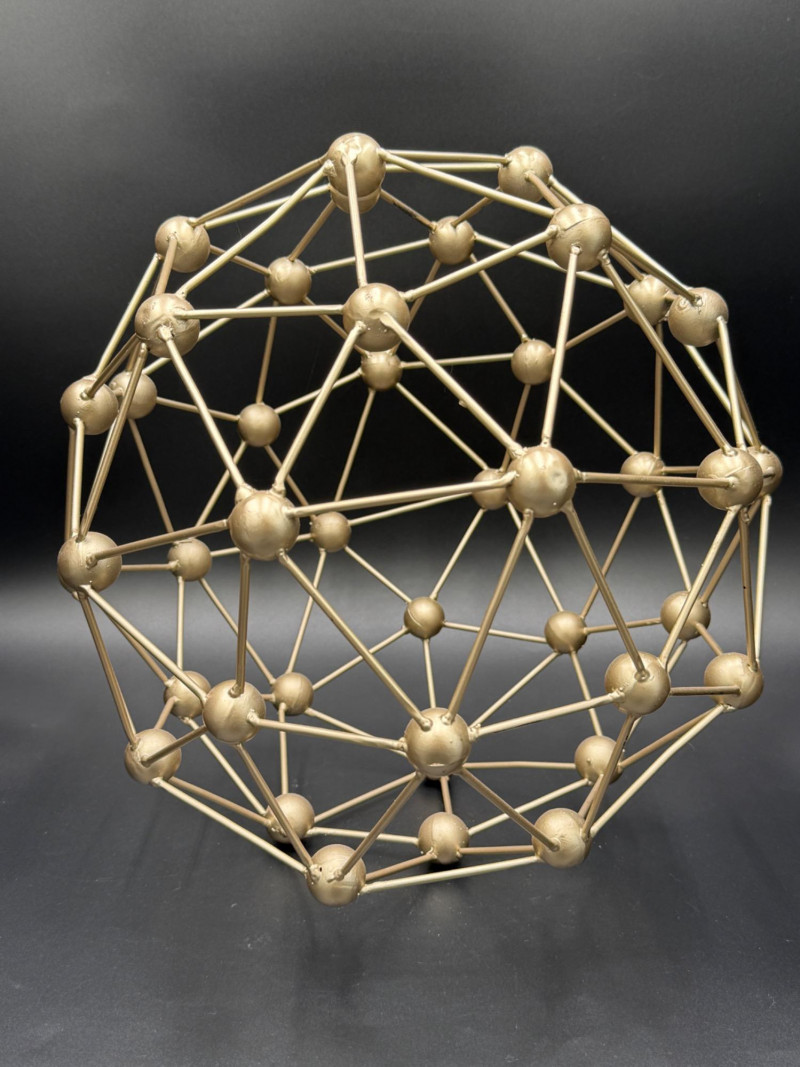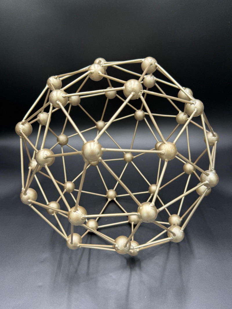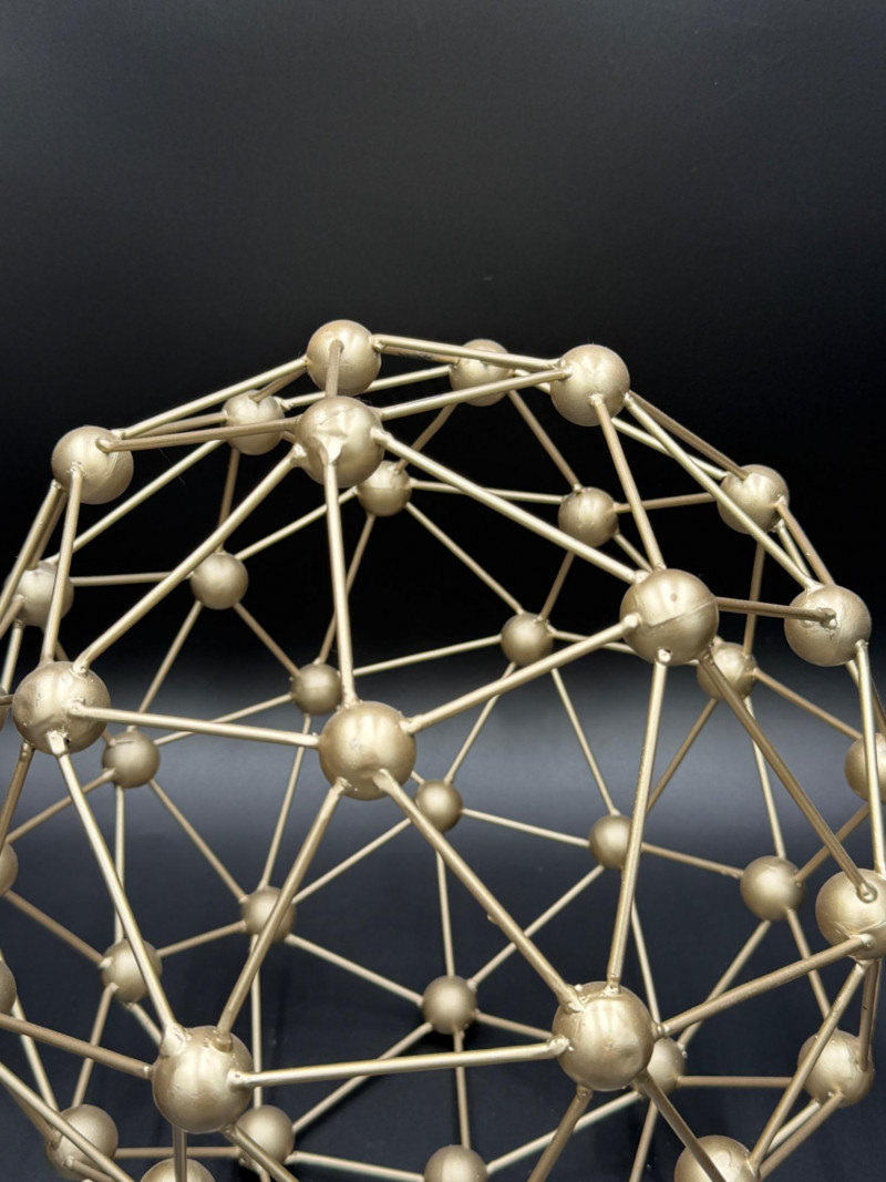 Modern Geometric Metal Sculpture – Architectural Spherical Design 13" Tall Description: Crafted in metal (exact type unknown), the warm metallic finish and precise construction evoke influences from mid-century masters like Harry Bertoia, as well as contemporary mathematical and architectural art. It’s the kind of sculpture that invites conversation and adds sophistication to modern interiors, offices, or gallery-style spaces. Highlights: Material: Metal (unknown type) Finish: Metallic / bronze-like appearance Style: Modern, geometric, architectural, sculptural art Cultural Significance: Dimensions: 12.5" W x 13" H