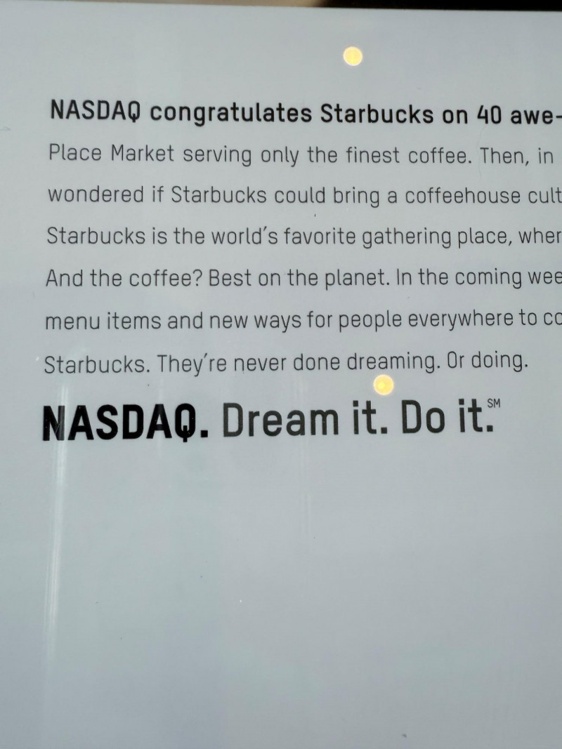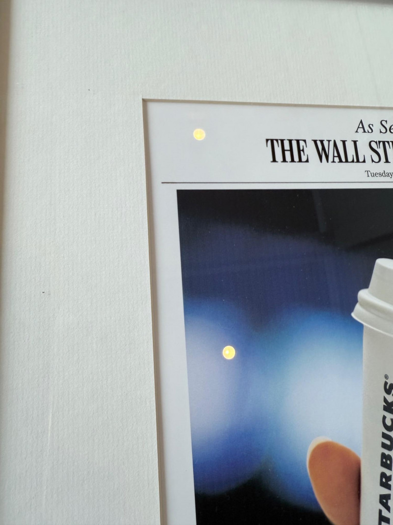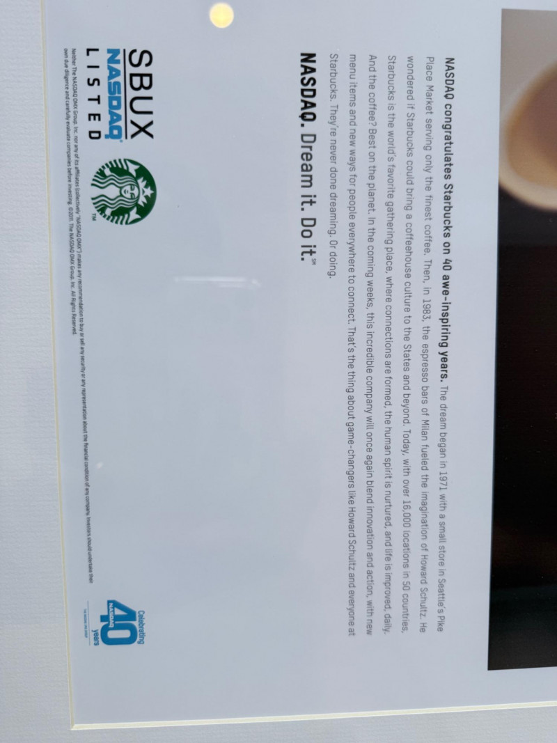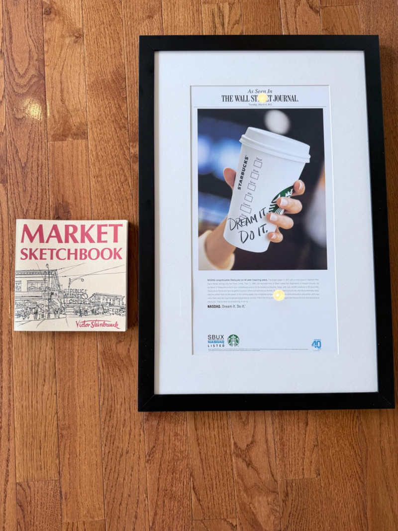 Starbucks Art and Pike Place Market Drawing Book Framed Wall Street Journal display featuring a Starbucks cup with the handwritten phrase "Dream it. Do it." The composition includes the NASDAQ logo marking 40 years and a message recognizing Starbucks' listing. Below the cup image is a NASDAQ statement alongside the Starbucks and SBX listed logos. The display is presented in a black wood frame with white mat and wire hanging hardware. Accompanying the frame is Market Sketchbook by Victor Steinbrueck, a published collection of line drawings and observations of Seattle’s Pike Place Market. The book features hand-rendered scenes of market buildings, vendors, street layouts, and the surrounding downtown area, highlighting the connection between the public market and the city. Dimensions: