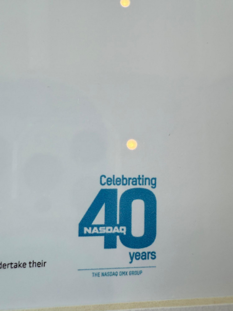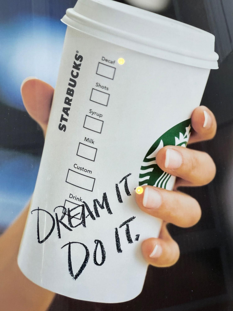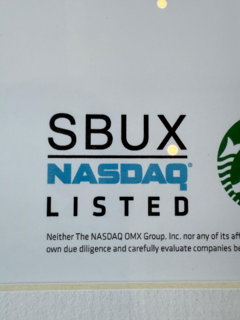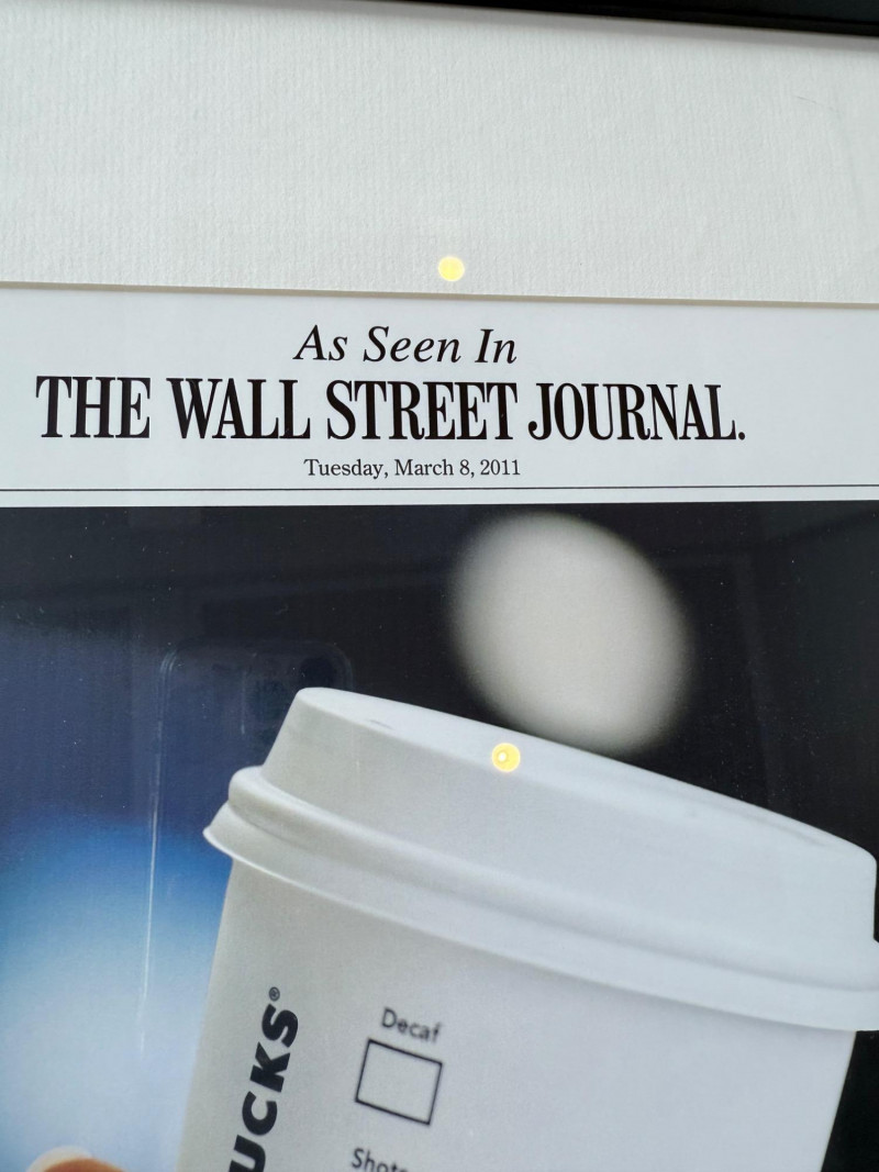Starbucks Art and Pike Place Market Drawing Book Framed Wall Street Journal display featuring a Starbucks cup with the handwritten phrase "Dream it. Do it." The composition includes the NASDAQ logo marking 40 years and a message recognizing Starbucks' listing. Below the cup image is a NASDAQ statement alongside the Starbucks and SBX listed logos. The display is presented in a black wood frame with white mat and wire hanging hardware. Accompanying the frame is Market Sketchbook by Victor Steinbrueck, a published collection of line drawings and observations of Seattle’s Pike Place Market. The book features hand-rendered scenes of market buildings, vendors, street layouts, and the surrounding downtown area, highlighting the connection between the public market and the city. Dimensions: