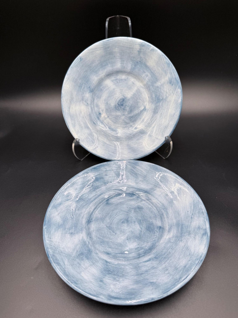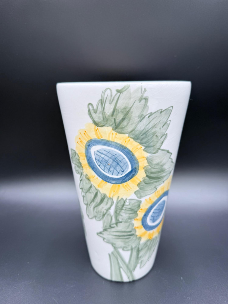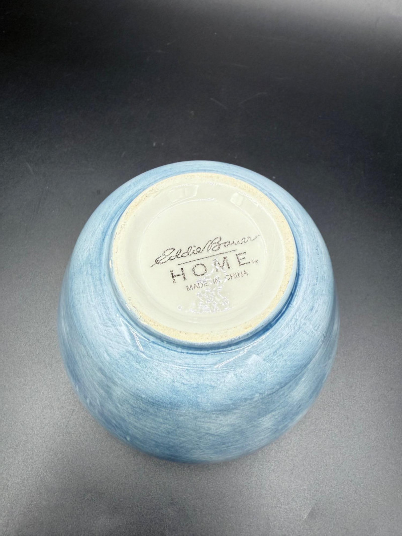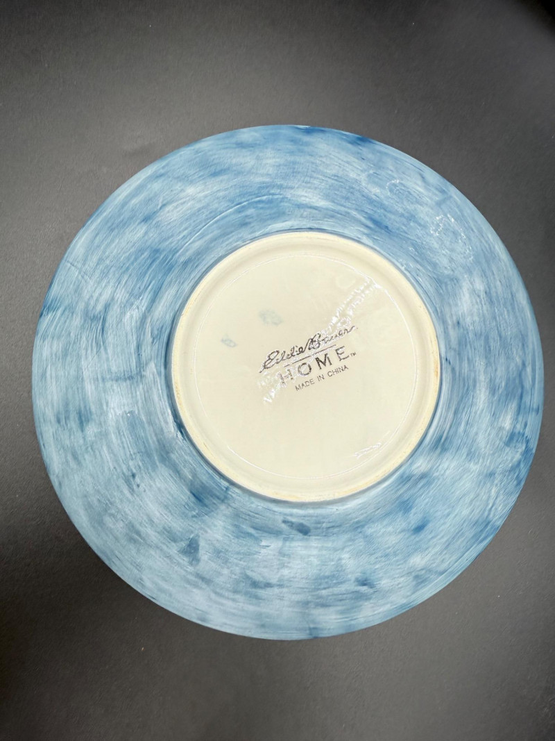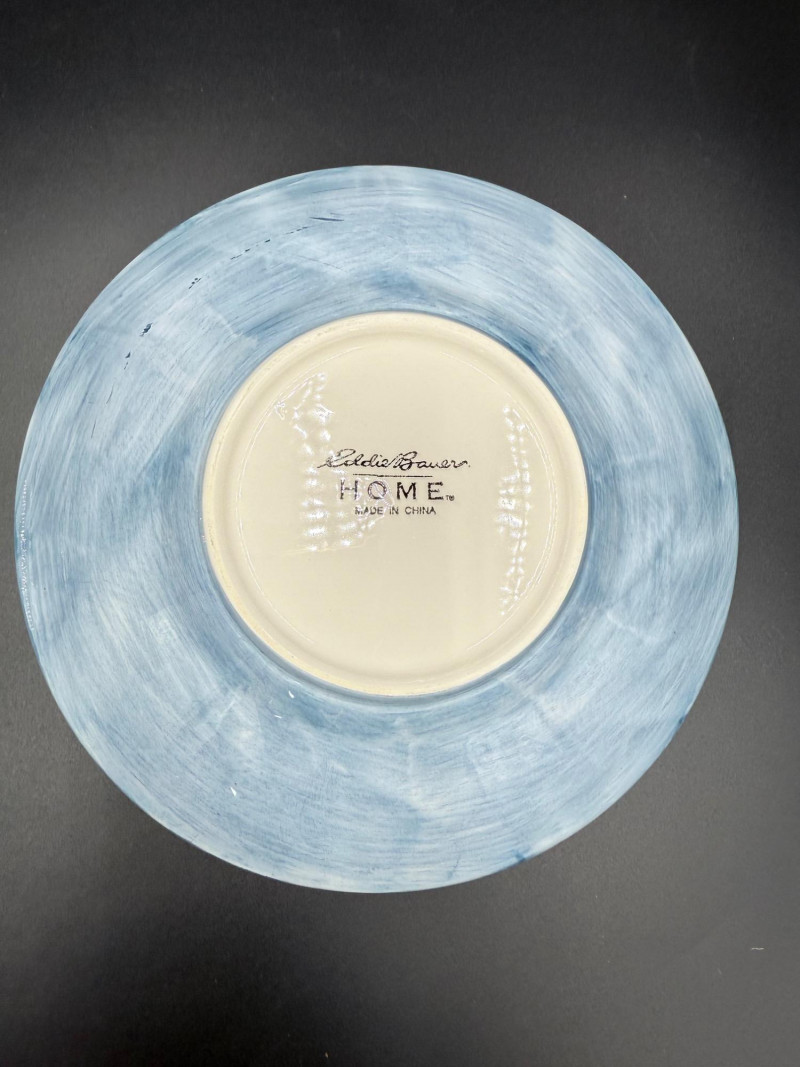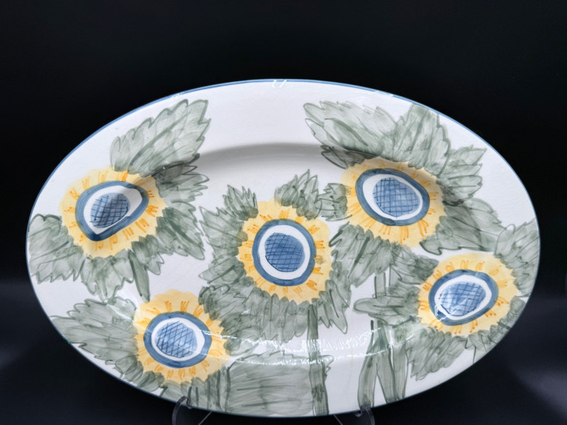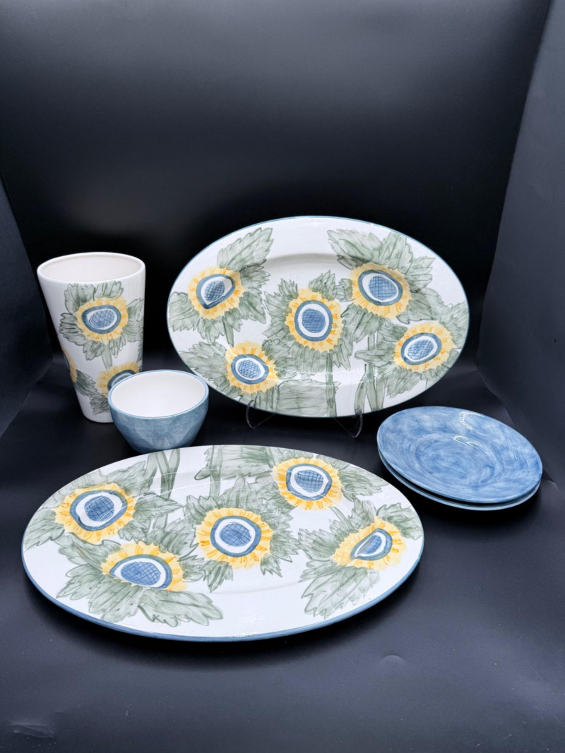 Eddie Bauer Home Ceramic Tableware Set – 6 Pieces Six-piece ceramic tableware set consisting of two oval serving platters, one vase, two round plates, and one bowl. The platters and vase display sunflower motifs composed of green leaves and concentric circular forms in yellow and blue. The round plates and bowl are finished in a blue brushed glaze with visible circular strokes. The platters have a shallow oval form with wide surfaces. The vase is tall and tapering with a flared mouth. The plates are round and flat. The bowl is small and rounded with an open top and smooth walls. All items are marked “Eddie Bauer Home – Made in China.” Dimensions: