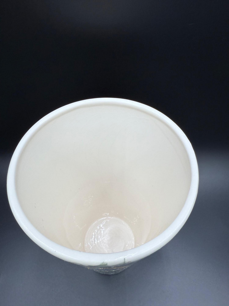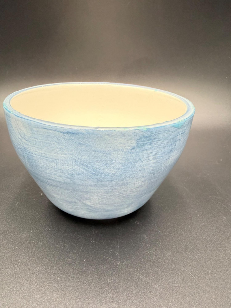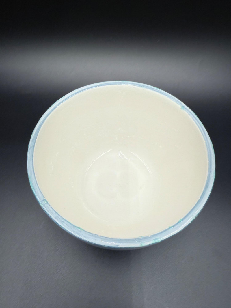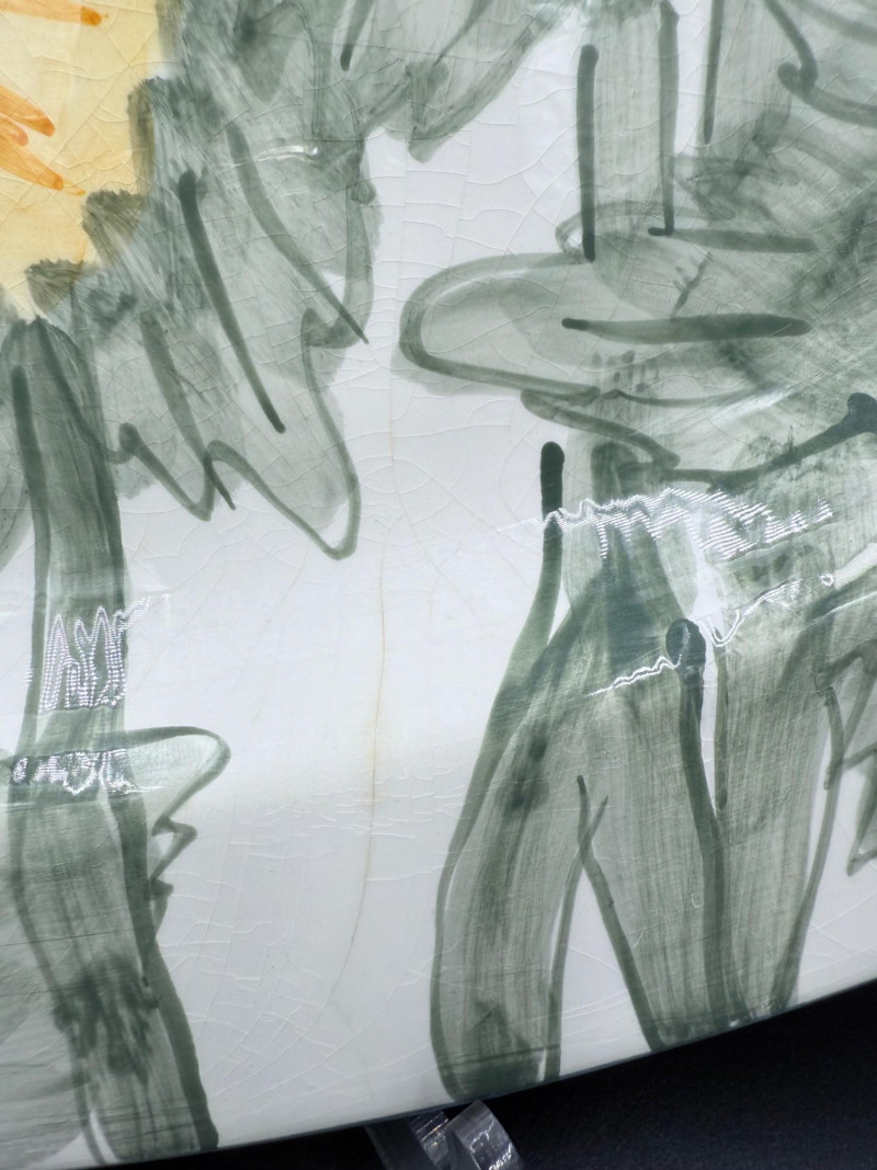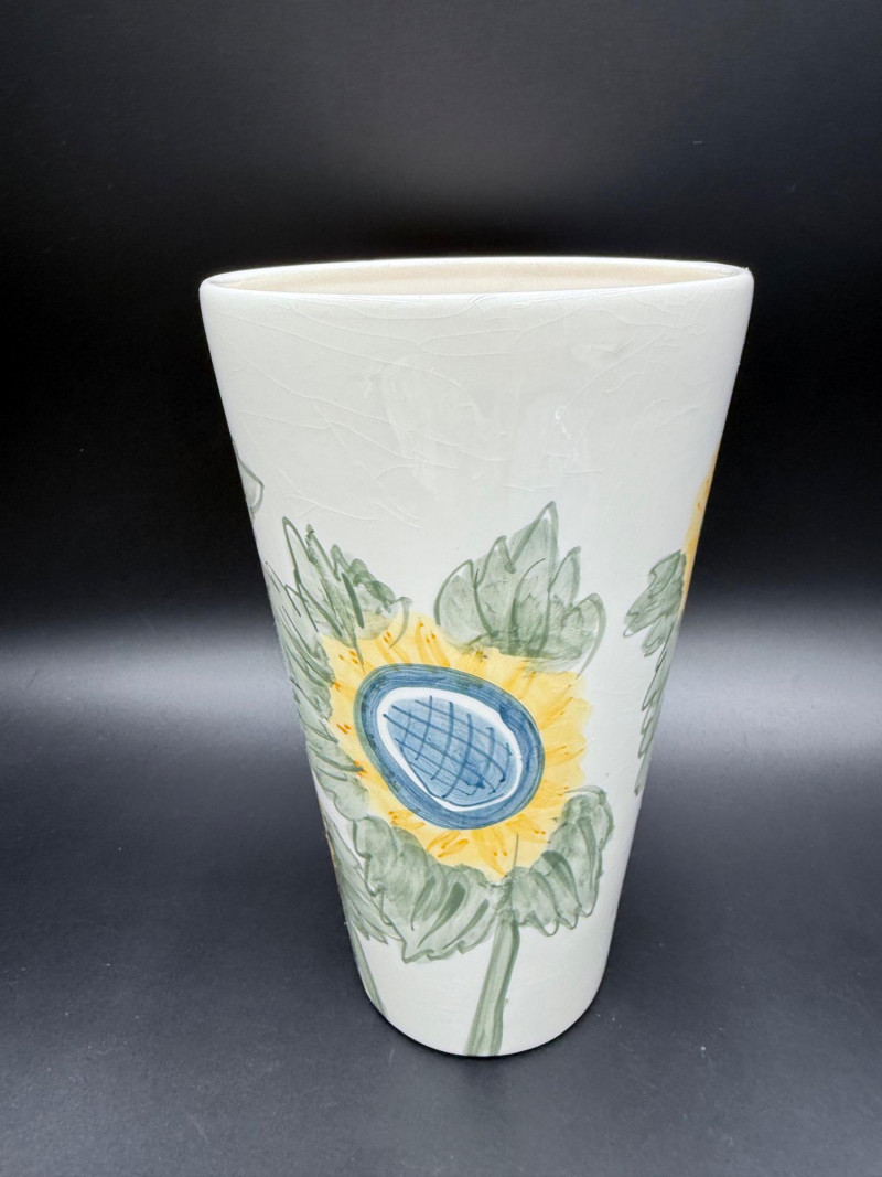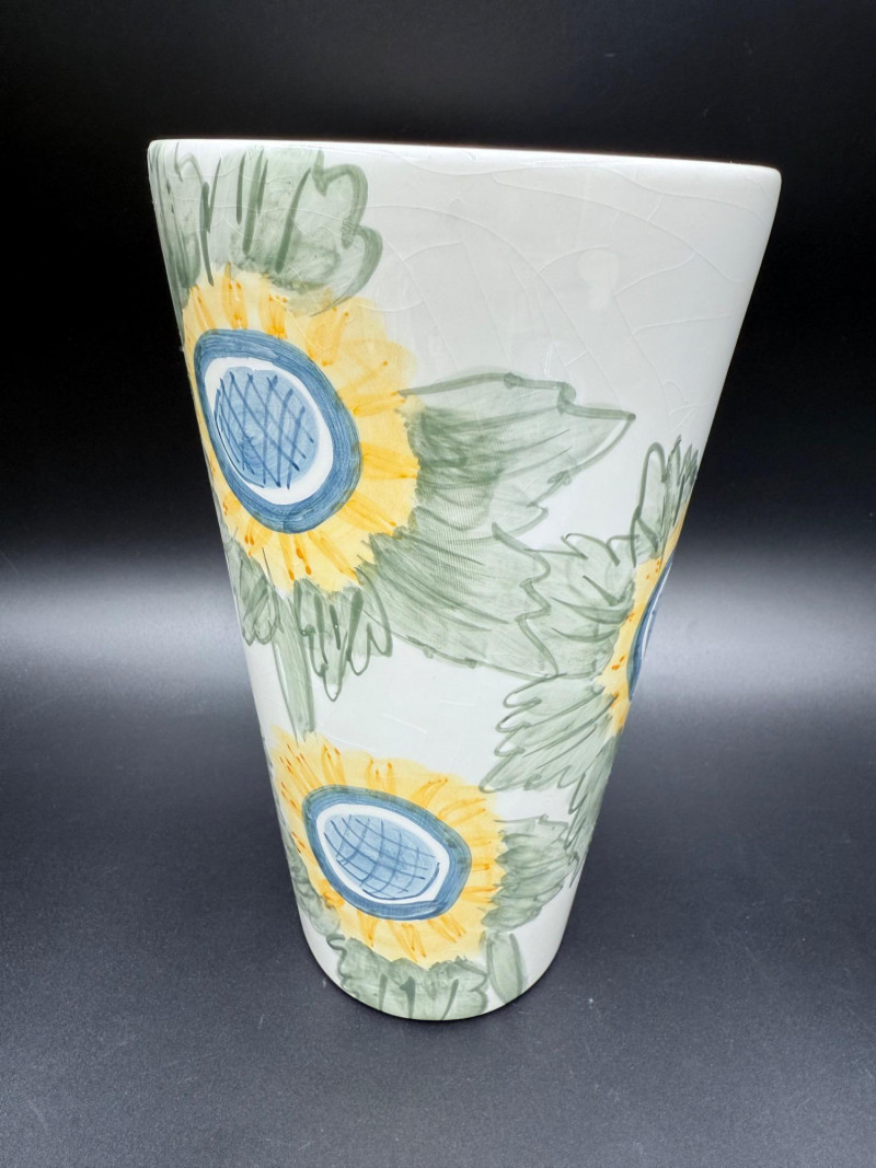 Eddie Bauer Home Ceramic Tableware Set – 6 Pieces Six-piece ceramic tableware set consisting of two oval serving platters, one vase, two round plates, and one bowl. The platters and vase display sunflower motifs composed of green leaves and concentric circular forms in yellow and blue. The round plates and bowl are finished in a blue brushed glaze with visible circular strokes. The platters have a shallow oval form with wide surfaces. The vase is tall and tapering with a flared mouth. The plates are round and flat. The bowl is small and rounded with an open top and smooth walls. All items are marked “Eddie Bauer Home – Made in China.” Dimensions: