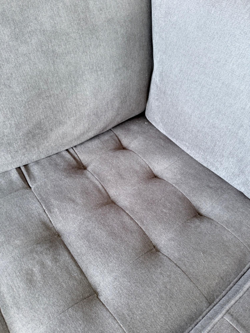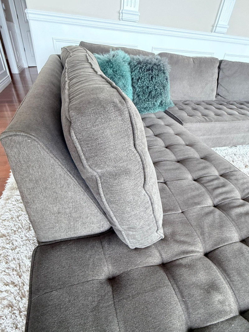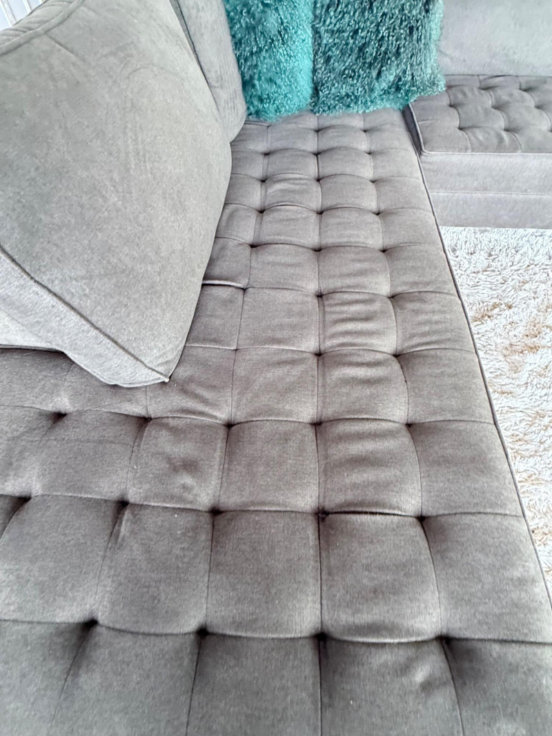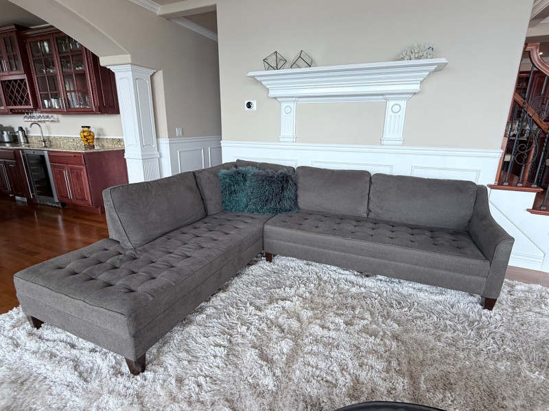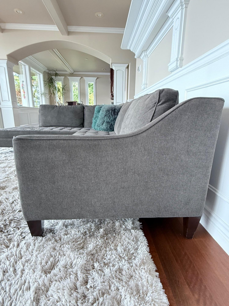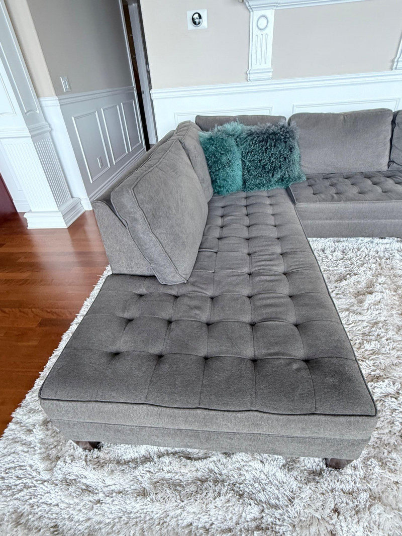 Haverty’s Gray L-Shaped Sectional Sofa Two-piece sectional likely from Haverty’s, but not confirmed, featuring gray fabric upholstery with tufted seat cushions and loose back pillows. The left-facing section includes an extended chaise. The frame is supported by tapered wooden legs and includes a metal connector underneath for securing both sections. Includes two teal accent pillows. Dimensions: Width (Back): 105" Length (Left Side): 90" Height: 30" Width (Front Left): 37" Depth: 29" Seat Height 16" Leg Material: Wood
