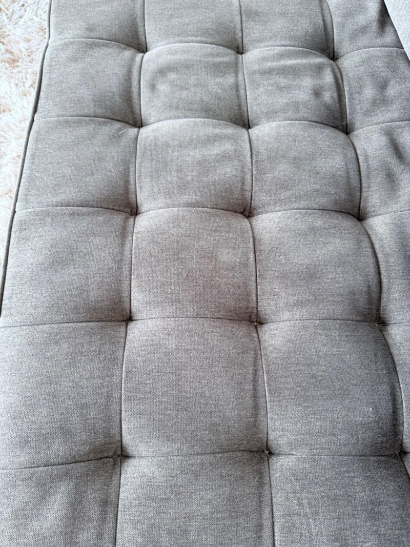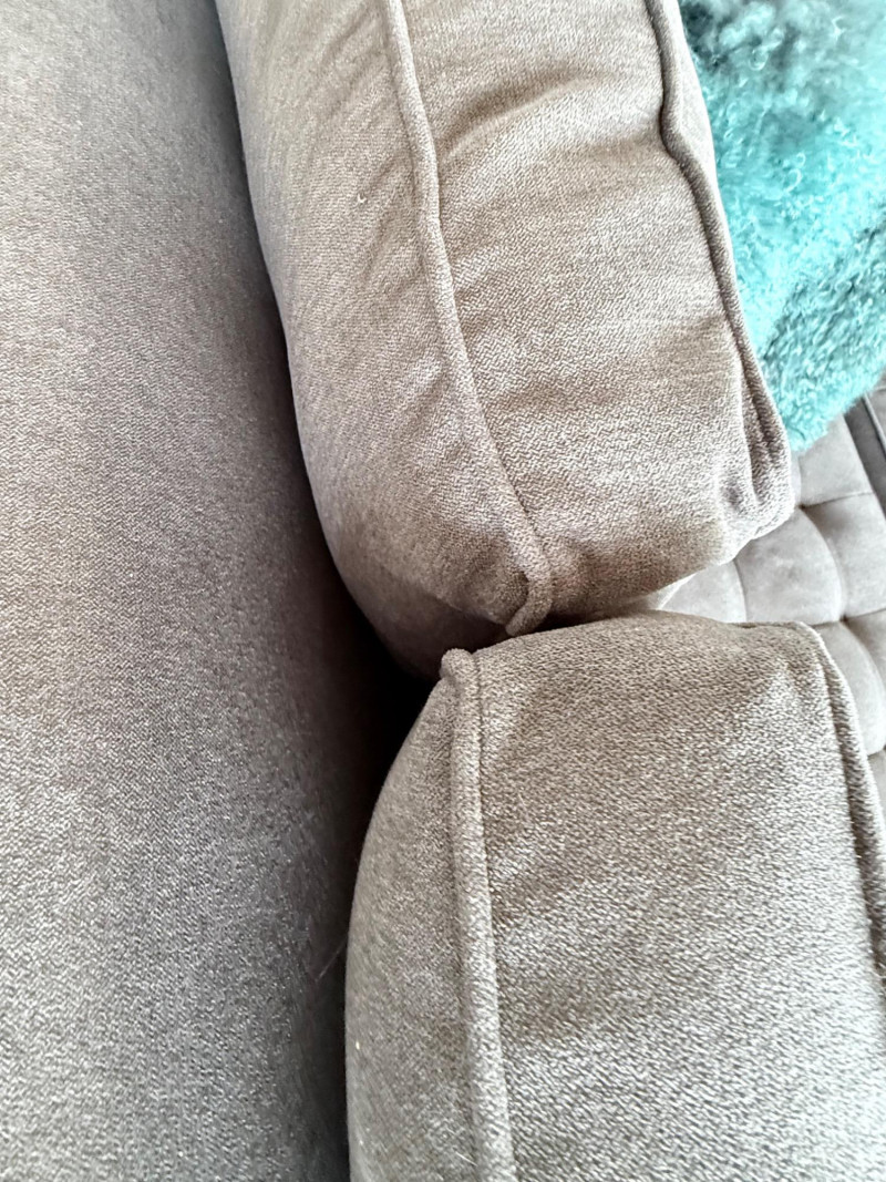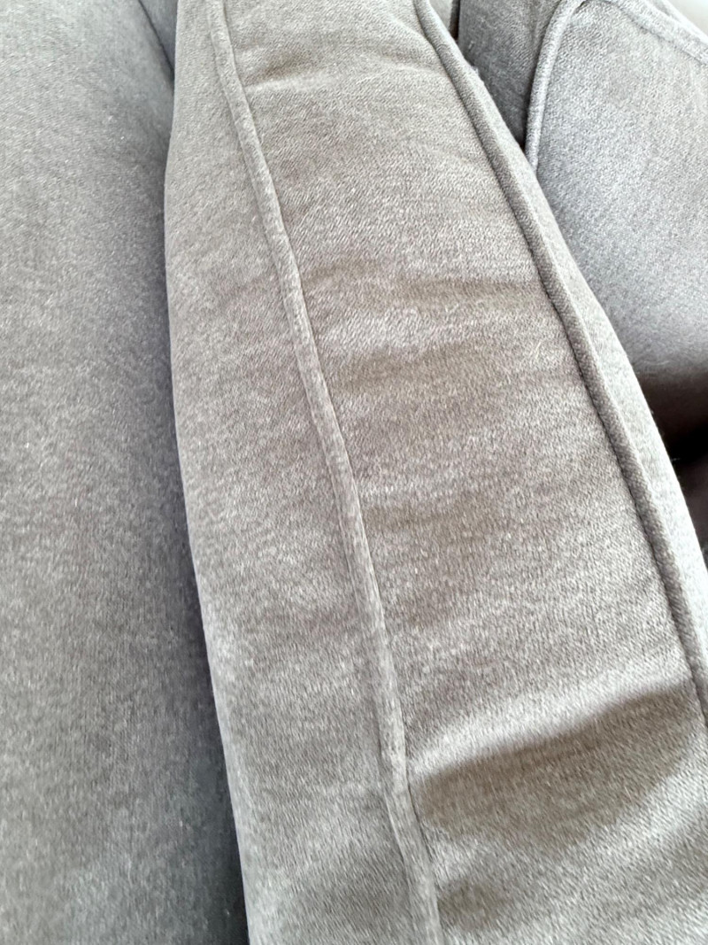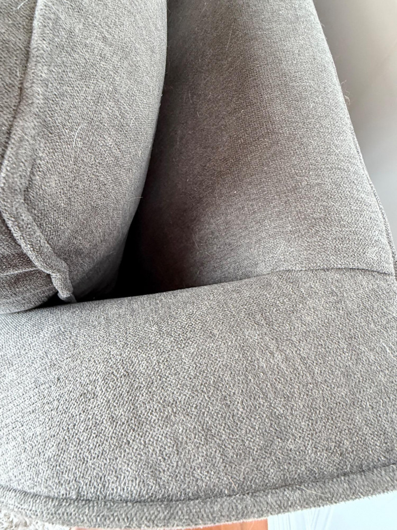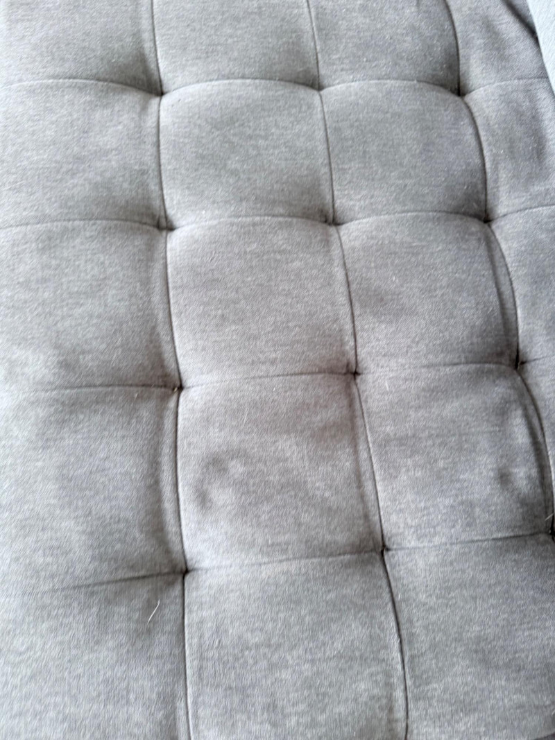 Haverty’s Gray L-Shaped Sectional Sofa Two-piece sectional likely from Haverty’s, but not confirmed, featuring gray fabric upholstery with tufted seat cushions and loose back pillows. The left-facing section includes an extended chaise. The frame is supported by tapered wooden legs and includes a metal connector underneath for securing both sections. Includes two teal accent pillows. Dimensions: Width (Back): 105" Length (Left Side): 90" Height: 30" Width (Front Left): 37" Depth: 29" Seat Height 16" Leg Material: Wood
