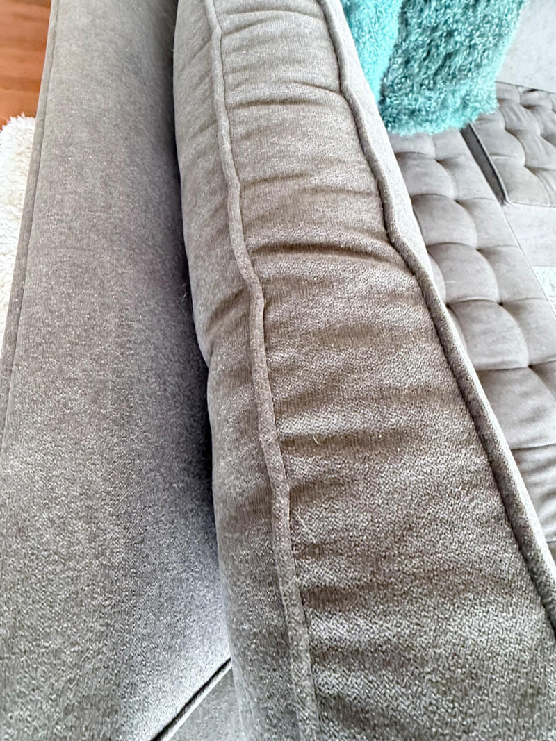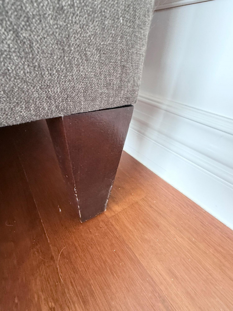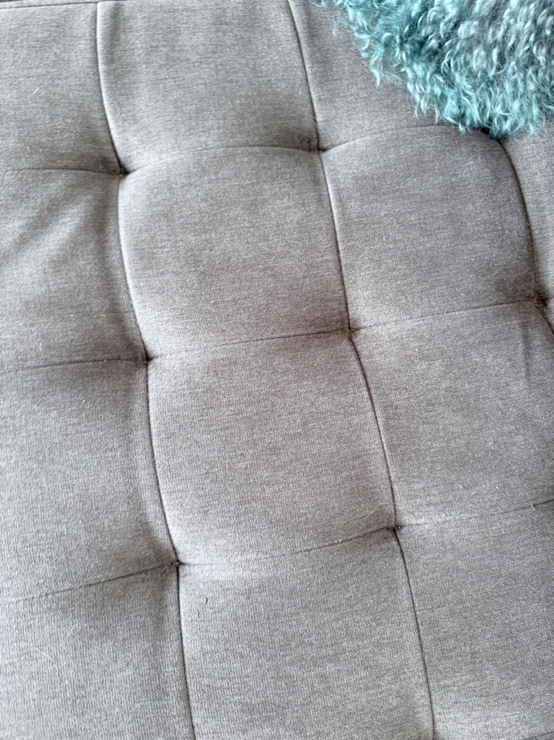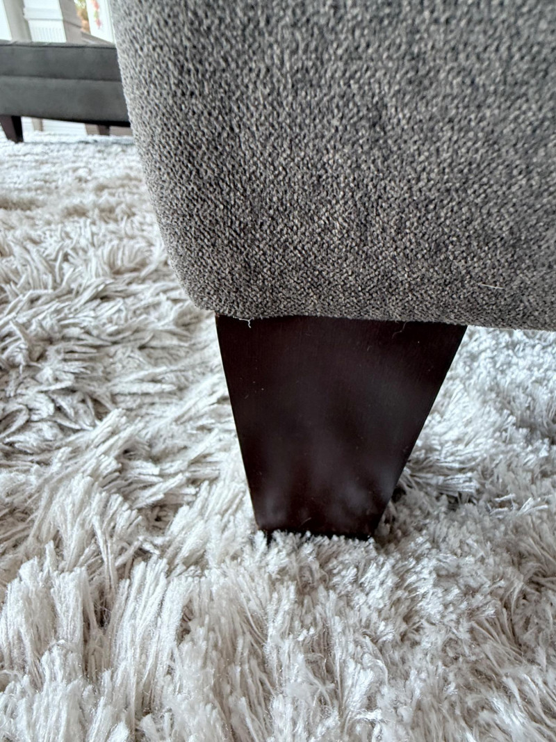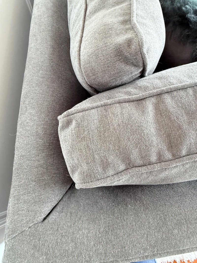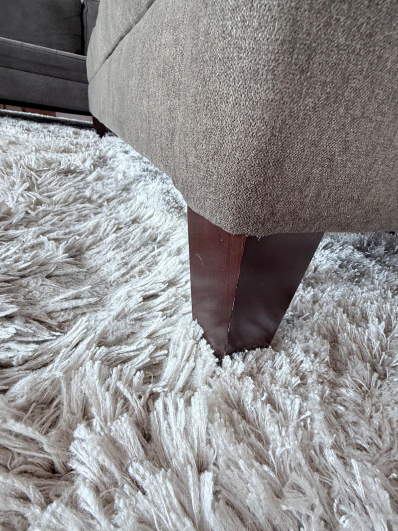 Haverty’s Gray L-Shaped Sectional Sofa Two-piece sectional likely from Haverty’s, but not confirmed, featuring gray fabric upholstery with tufted seat cushions and loose back pillows. The left-facing section includes an extended chaise. The frame is supported by tapered wooden legs and includes a metal connector underneath for securing both sections. Includes two teal accent pillows. Dimensions: Width (Back): 105" Length (Left Side): 90" Height: 30" Width (Front Left): 37" Depth: 29" Seat Height 16" Leg Material: Wood