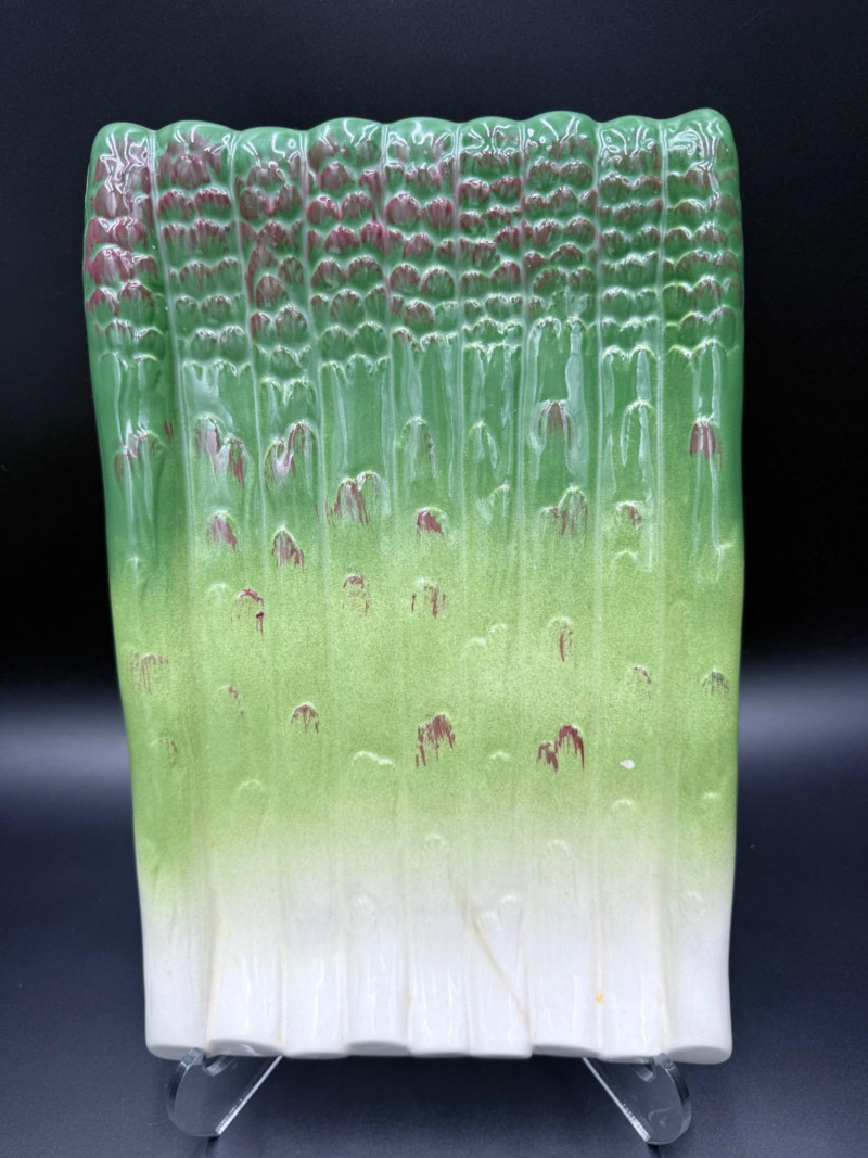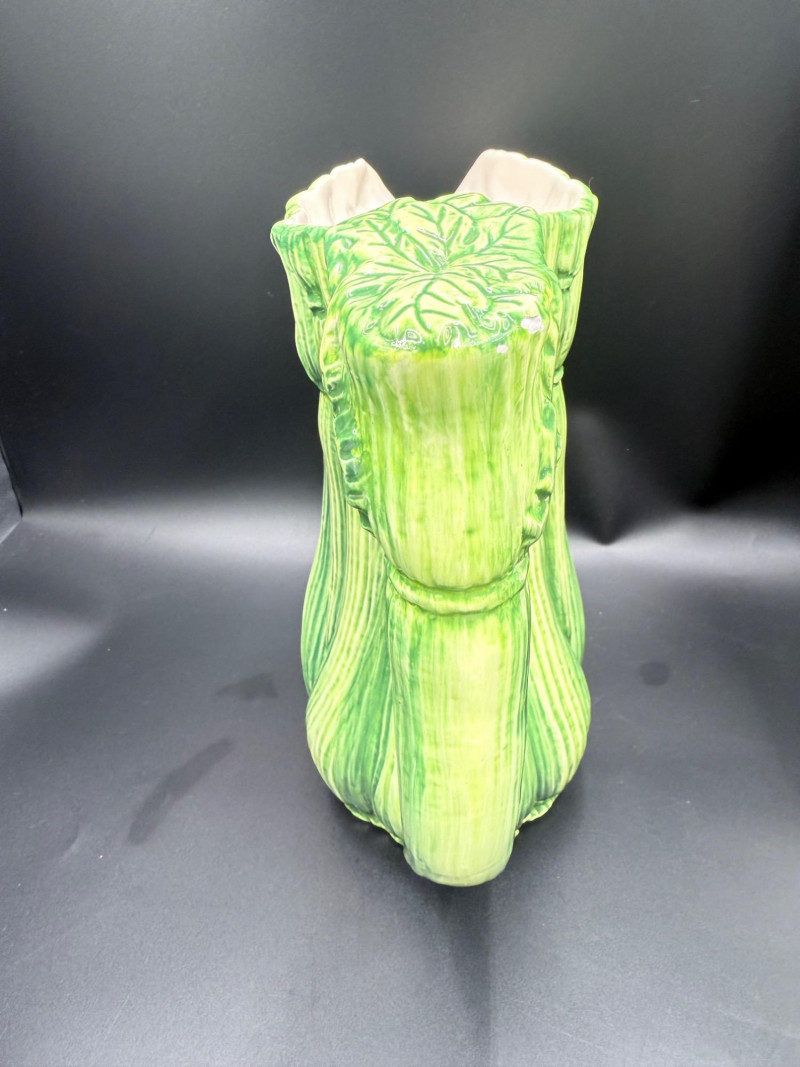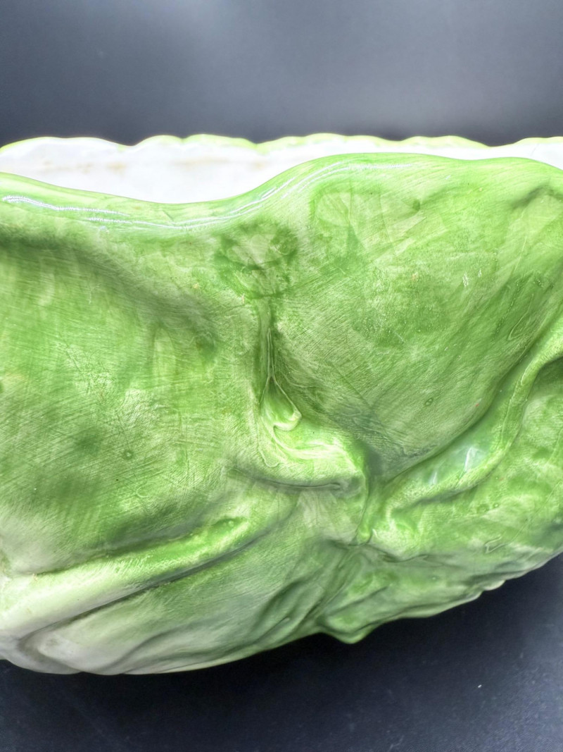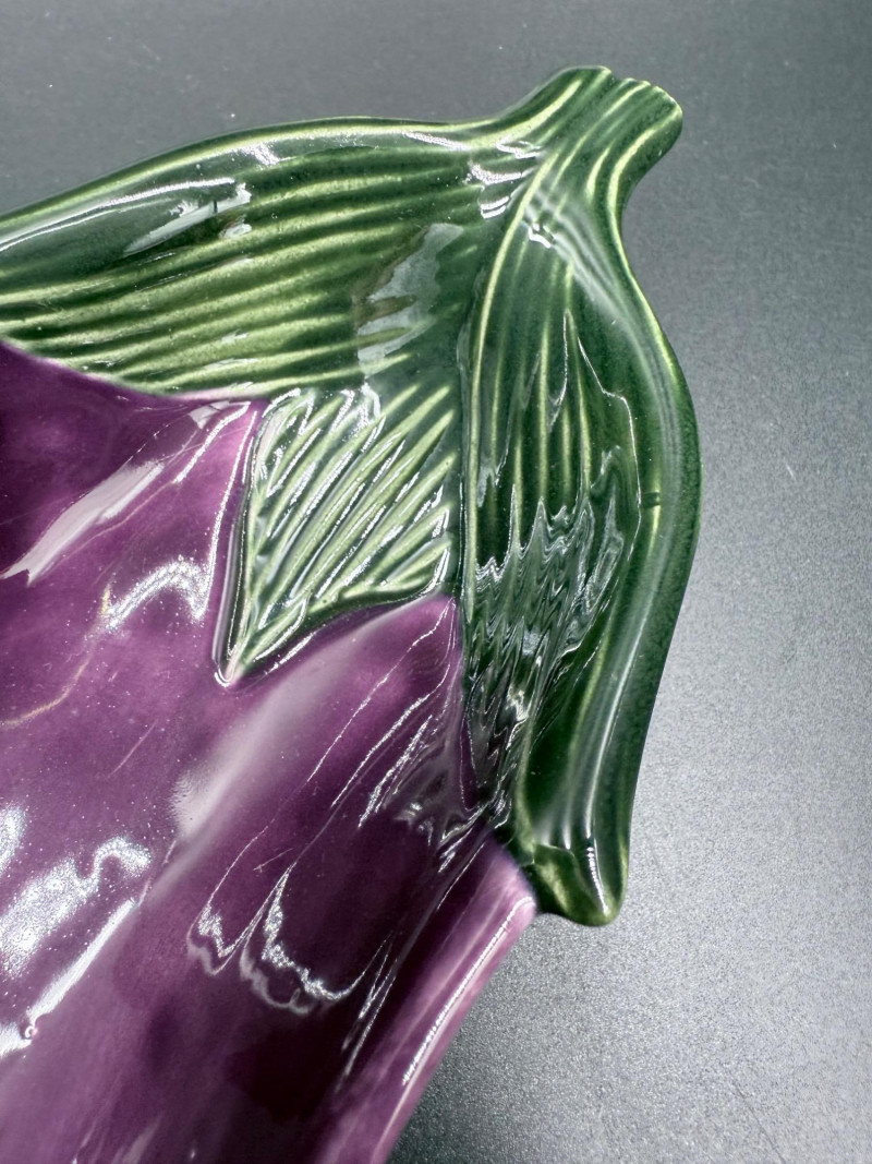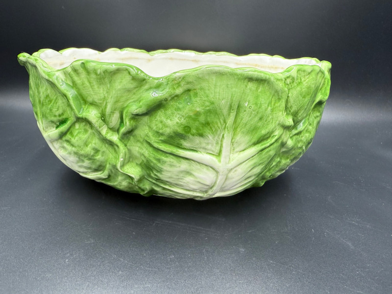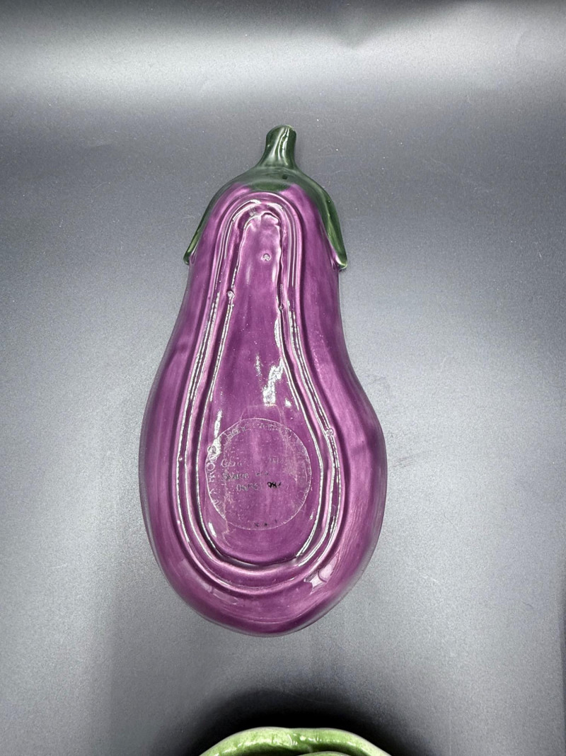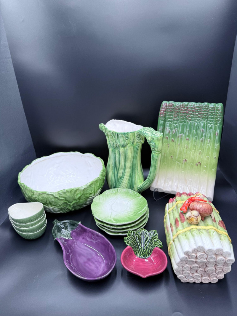 Vegetable Dish and Serveware Collection Dish and serveware collection shaped and finished to resemble vegetables including cabbage, lettuce, asparagus, beet, avocado, and eggplant. Forms include bowls, plates, dishes, a pitcher, and a lidded container, each molded with surface detailing and finished in colors reflecting the represented vegetables. Several items are marked with origin stamps including Portugal and Seattle, WA. Dimensions: Cabbage Bowl: 12" D x 5" H Celery Pitcher: 11" L x 5" W x 11" H Beet Dish: 6.5" x 4.5" Eggplant Dish: 10" x 5" Asparagus Plate: 12.5" L x 9" W Asparagus Dish: 8" L x 6" W x 7" H Asparagus Tray: 10" x 5" Lettuce Plates: 7" D Avocado Bowls: 5.5" x 3.5"