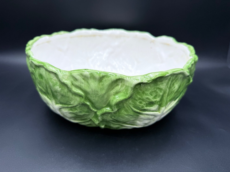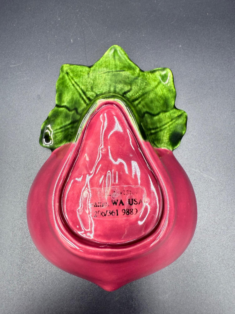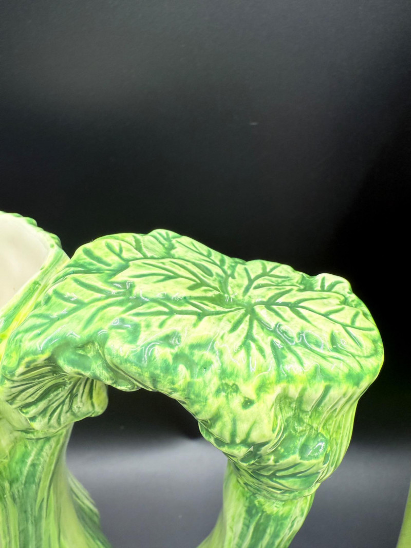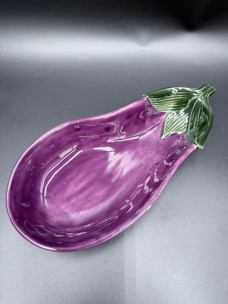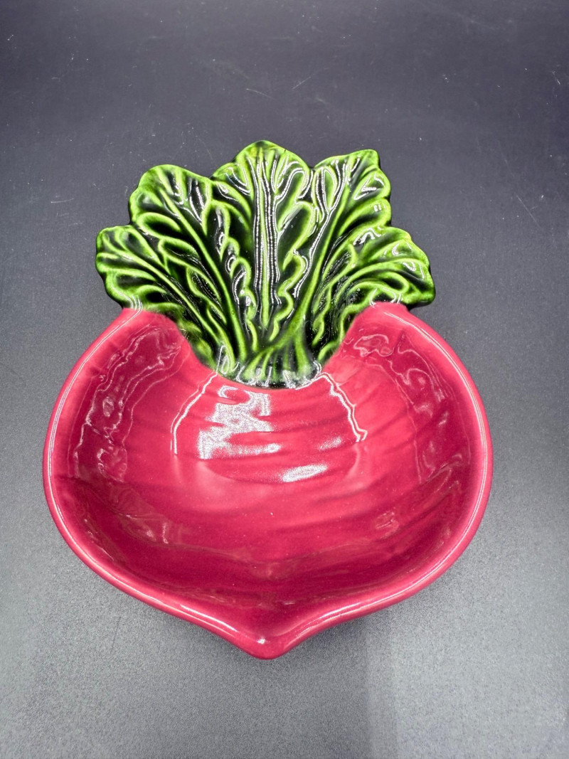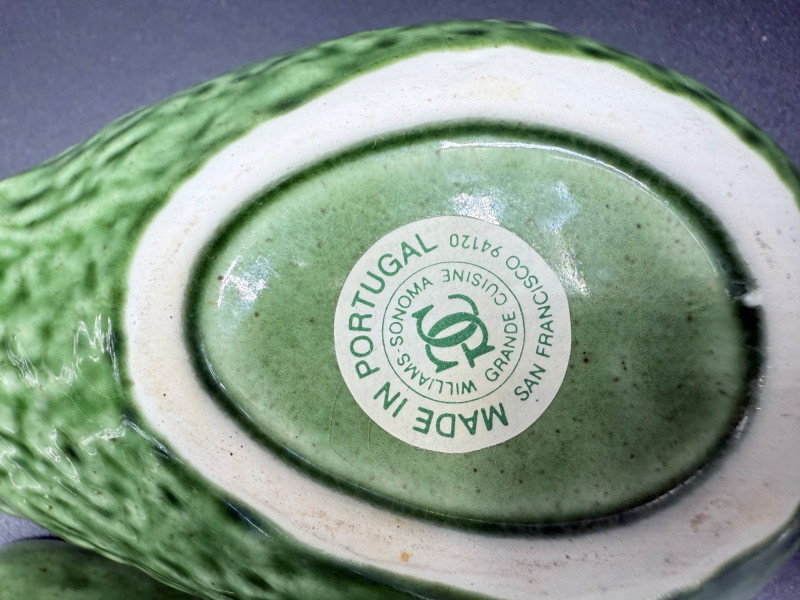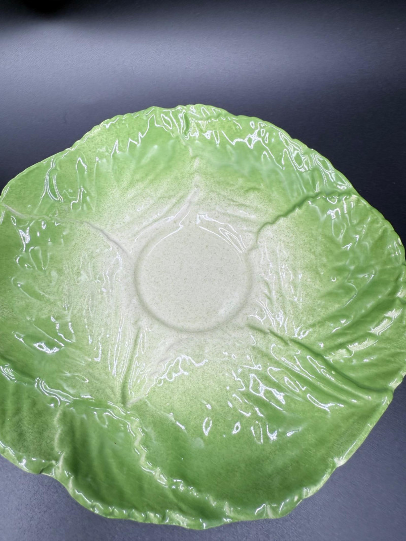 Vegetable Dish and Serveware Collection Dish and serveware collection shaped and finished to resemble vegetables including cabbage, lettuce, asparagus, beet, avocado, and eggplant. Forms include bowls, plates, dishes, a pitcher, and a lidded container, each molded with surface detailing and finished in colors reflecting the represented vegetables. Several items are marked with origin stamps including Portugal and Seattle, WA. Dimensions: Cabbage Bowl: 12" D x 5" H Celery Pitcher: 11" L x 5" W x 11" H Beet Dish: 6.5" x 4.5" Eggplant Dish: 10" x 5" Asparagus Plate: 12.5" L x 9" W Asparagus Dish: 8" L x 6" W x 7" H Asparagus Tray: 10" x 5" Lettuce Plates: 7" D Avocado Bowls: 5.5" x 3.5"
