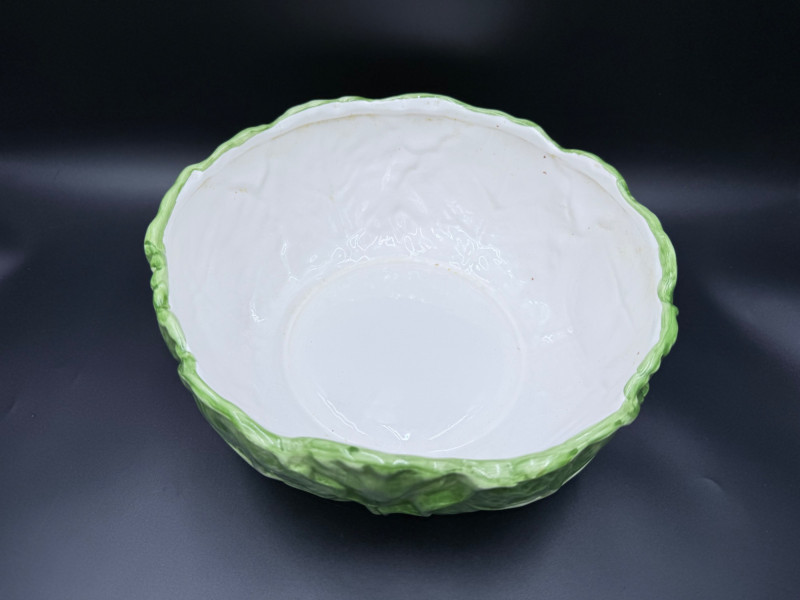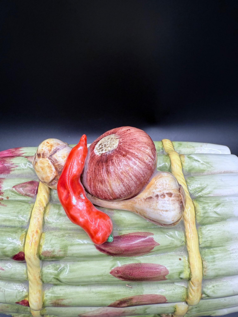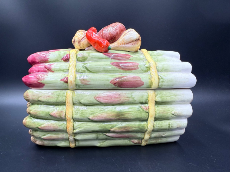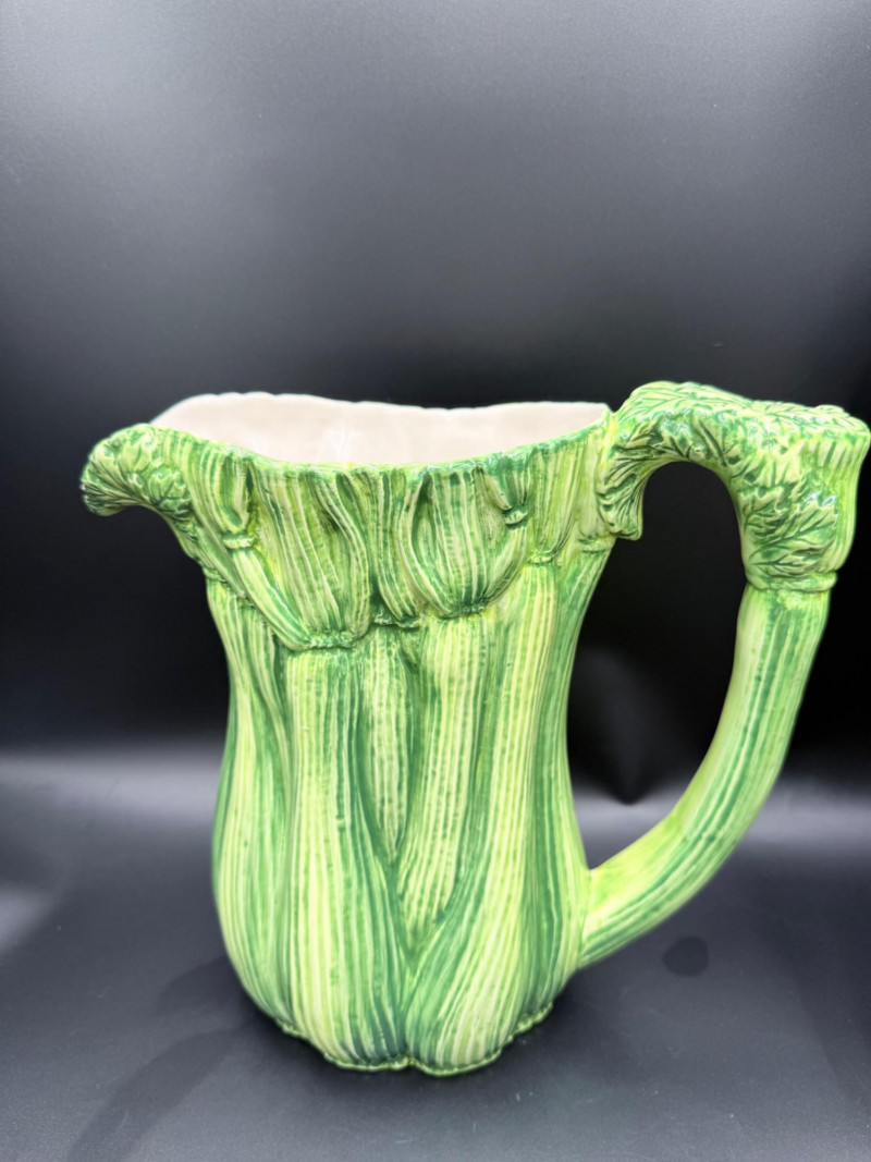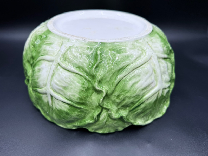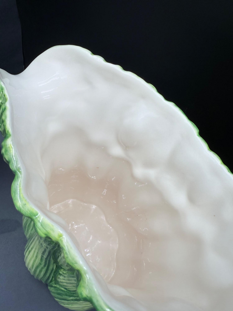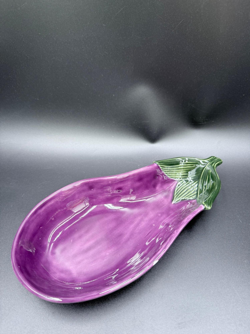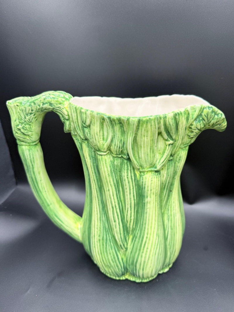 Vegetable Dish and Serveware Collection Dish and serveware collection shaped and finished to resemble vegetables including cabbage, lettuce, asparagus, beet, avocado, and eggplant. Forms include bowls, plates, dishes, a pitcher, and a lidded container, each molded with surface detailing and finished in colors reflecting the represented vegetables. Several items are marked with origin stamps including Portugal and Seattle, WA. Dimensions: Cabbage Bowl: 12" D x 5" H Celery Pitcher: 11" L x 5" W x 11" H Beet Dish: 6.5" x 4.5" Eggplant Dish: 10" x 5" Asparagus Plate: 12.5" L x 9" W Asparagus Dish: 8" L x 6" W x 7" H Asparagus Tray: 10" x 5" Lettuce Plates: 7" D Avocado Bowls: 5.5" x 3.5"