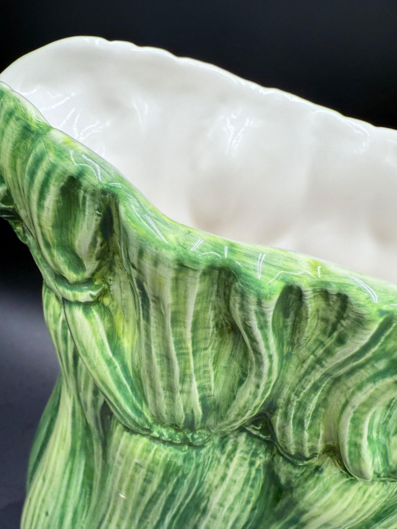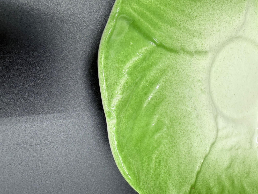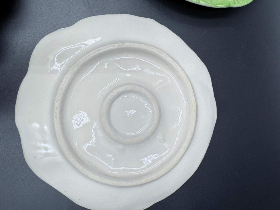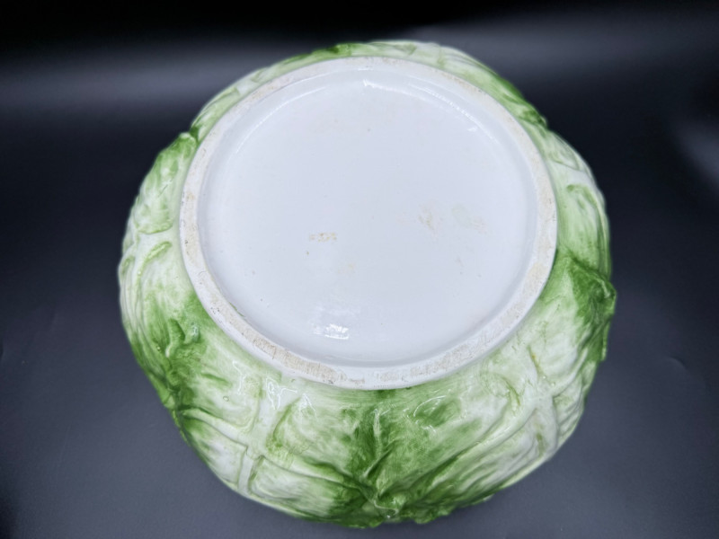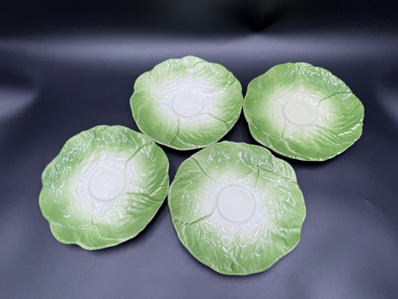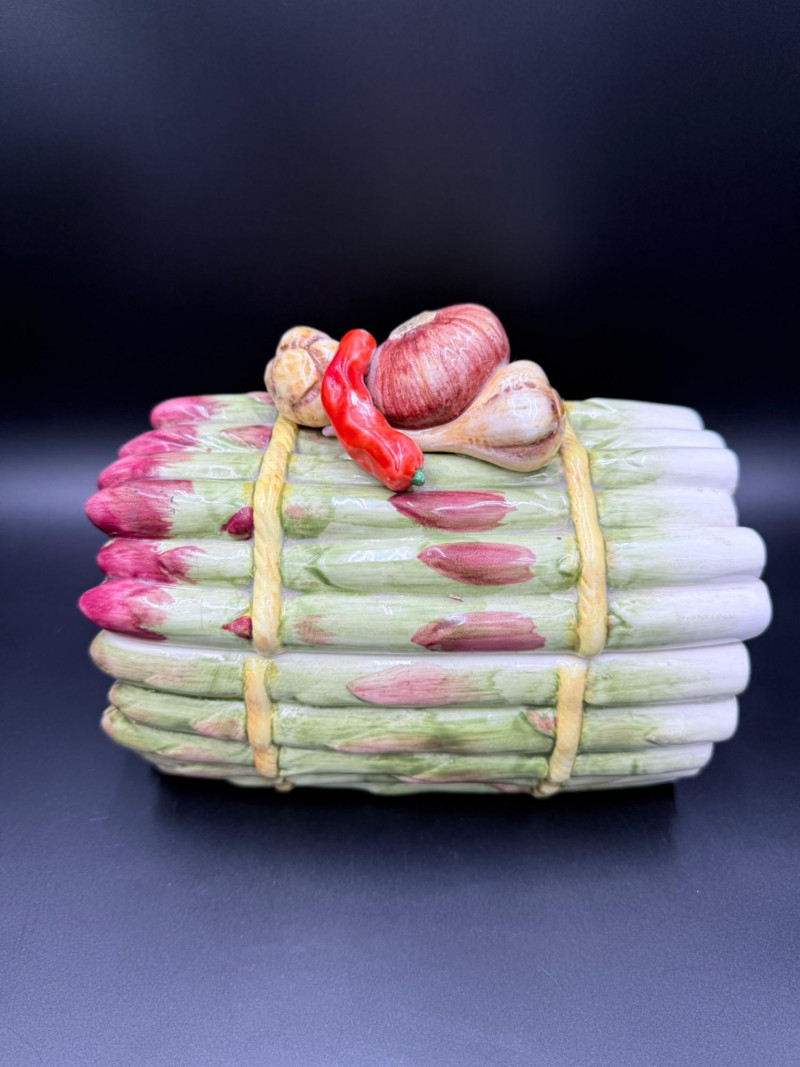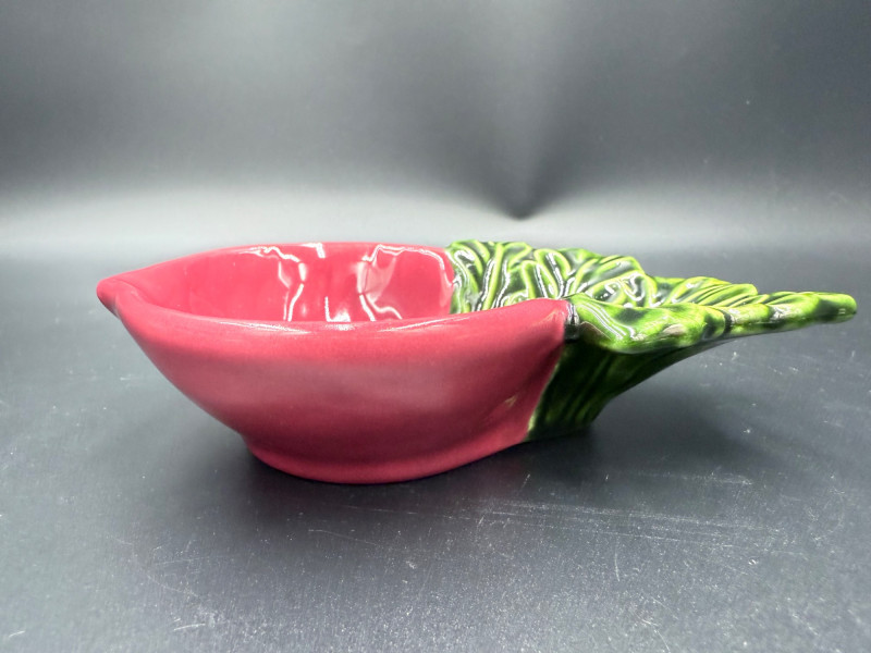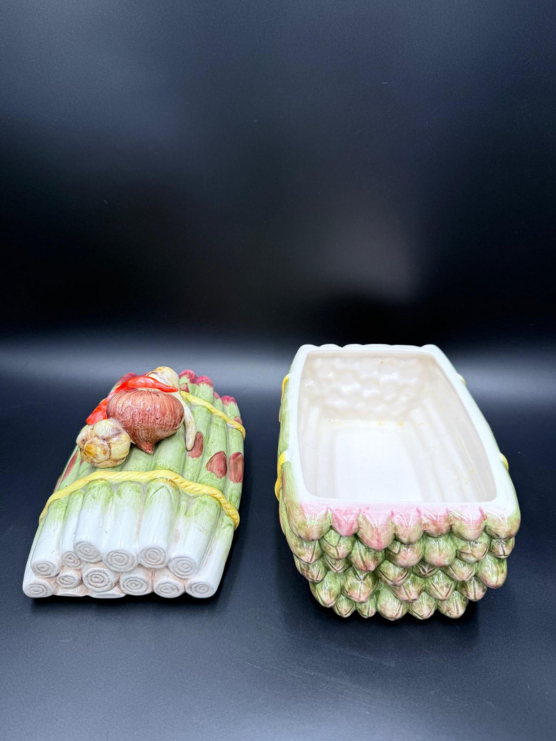Vegetable Dish and Serveware Collection Dish and serveware collection shaped and finished to resemble vegetables including cabbage, lettuce, asparagus, beet, avocado, and eggplant. Forms include bowls, plates, dishes, a pitcher, and a lidded container, each molded with surface detailing and finished in colors reflecting the represented vegetables. Several items are marked with origin stamps including Portugal and Seattle, WA. Dimensions: Cabbage Bowl: 12" D x 5" H Celery Pitcher: 11" L x 5" W x 11" H Beet Dish: 6.5" x 4.5" Eggplant Dish: 10" x 5" Asparagus Plate: 12.5" L x 9" W Asparagus Dish: 8" L x 6" W x 7" H Asparagus Tray: 10" x 5" Lettuce Plates: 7" D Avocado Bowls: 5.5" x 3.5"