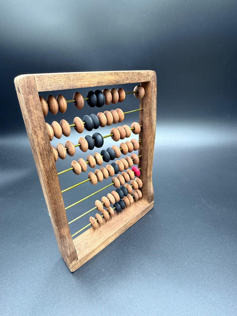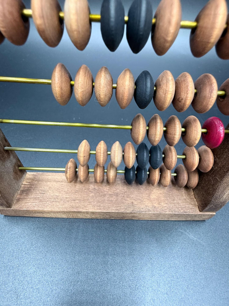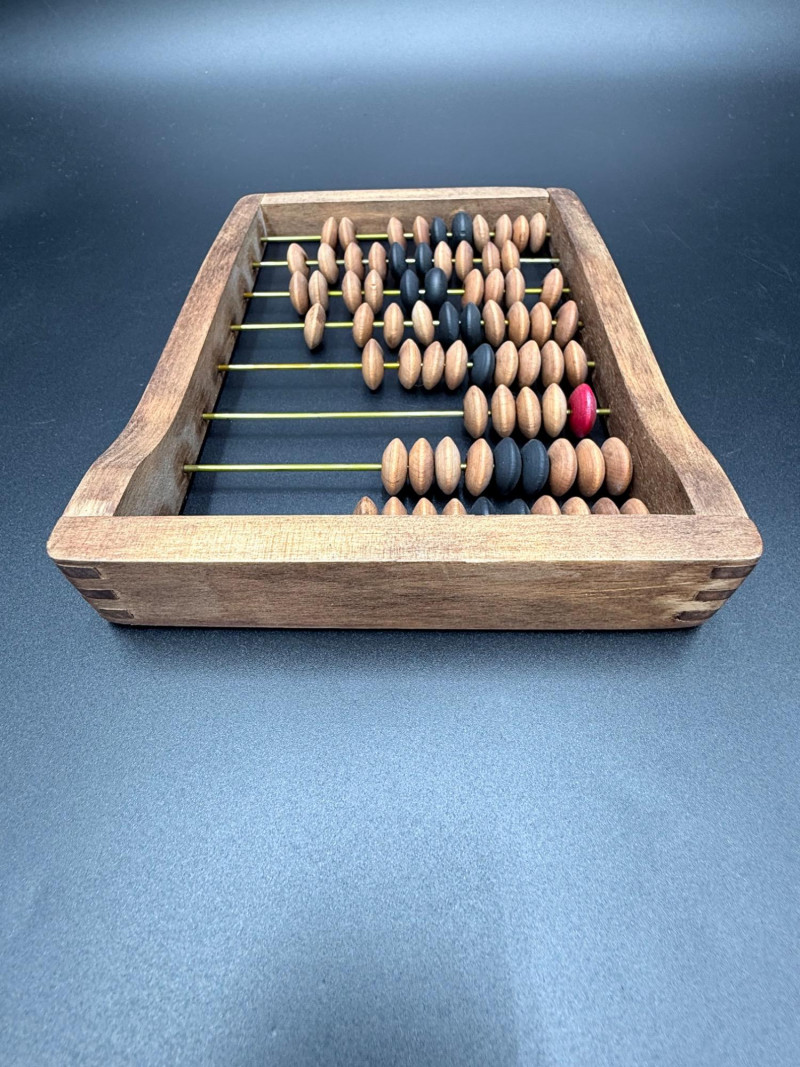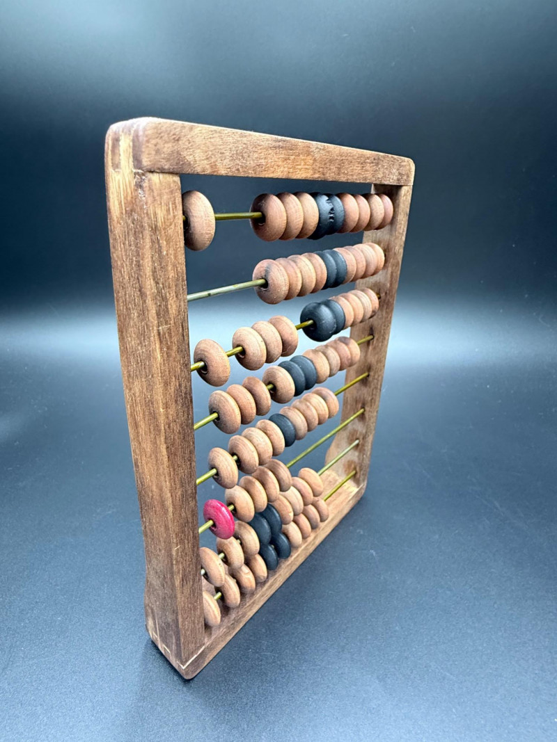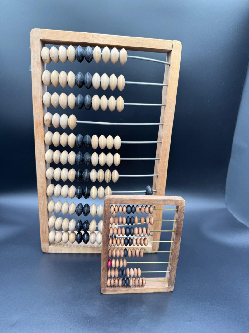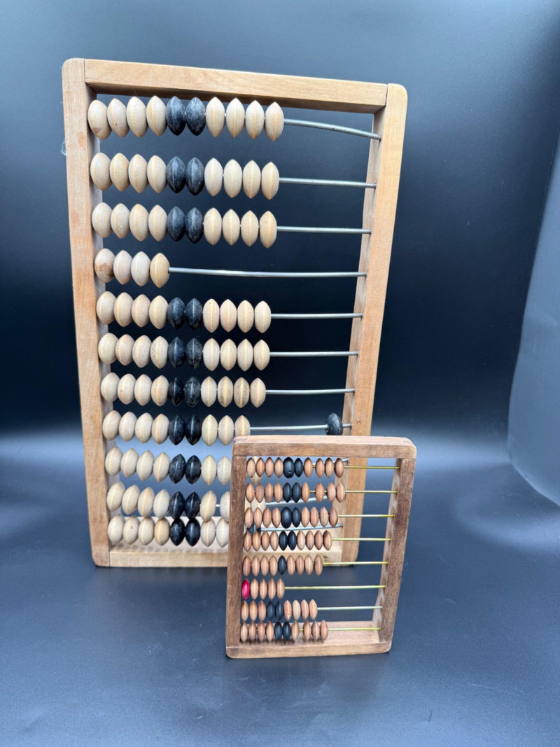 Two Vintage Wooden Abacus Calculators Two vintage wooden abacus calculators with rectangular frames and horizontal rods holding rounded counting beads. The smaller piece includes natural, dark, and one red bead on brass rods. The larger features alternating light and dark beads on silver-toned rods. Both are constructed with joined wooden frames and exposed corner joints. Dimensions: Small: 5.5" W x 7.5" H Large: 11" W x 18" H