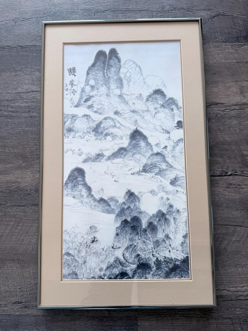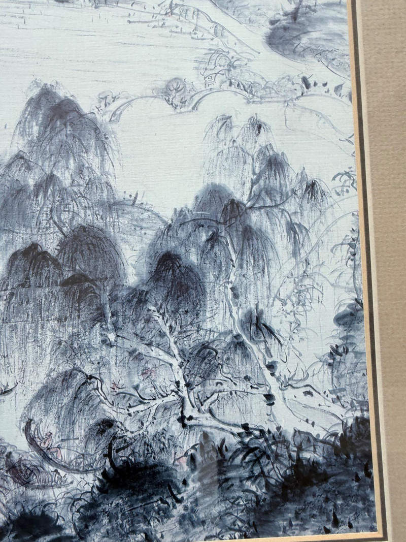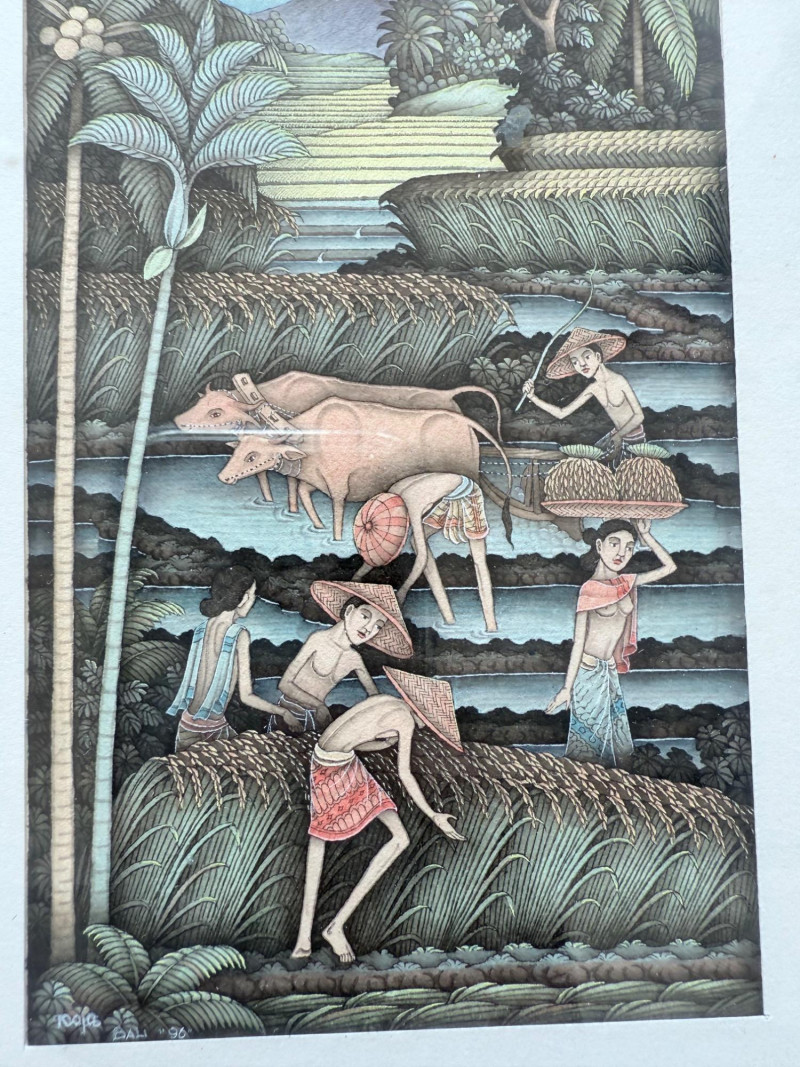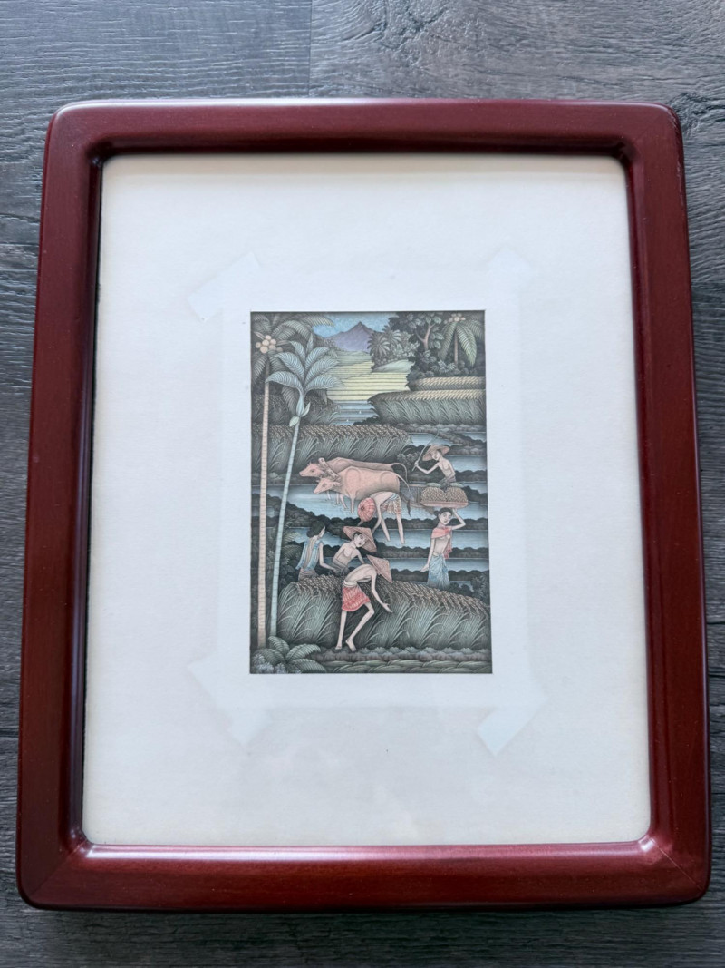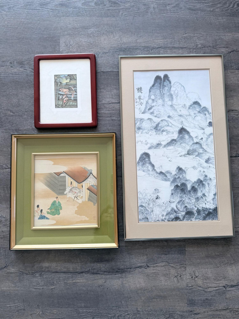 Three Artworks: Landscape, Village Scene and Court Illustration A set of three framed works featuring varied subjects and regional styles. The first depicts a monochrome landscape with mountain formations, rivers, and trees rendered in ink on paper. A vertical inscription and red seal are visible in the upper corner. The artwork is matted and presented in a metal frame. The second shows a rural farming scene with figures harvesting rice in terraced fields. Water buffalo, palm trees, and layered vegetation appear throughout the composition. The painting is mounted on white backing and set in a red-painted wood frame. The frame is labeled as manufactured by Intercraft Industries in Thailand. The third features a courtly scene with multiple figures dressed in traditional robes positioned around an architectural gate. The composition includes stylized rooflines, cloud bands, and a red seal in the lower corner. The piece is framed with a green mat and set in a wood frame with a gold inner border. Set Includes: