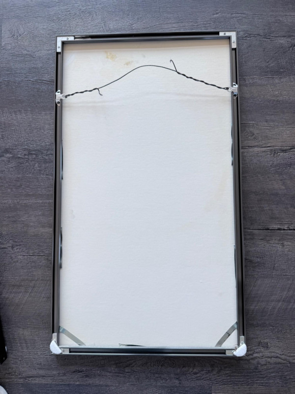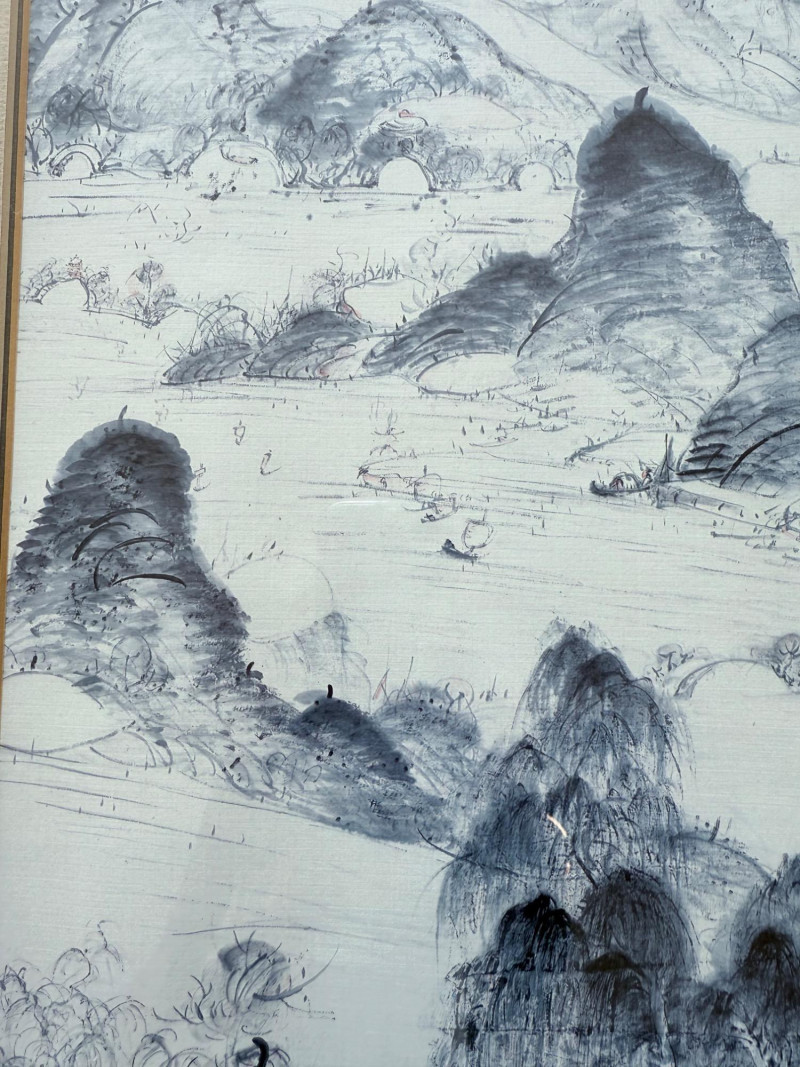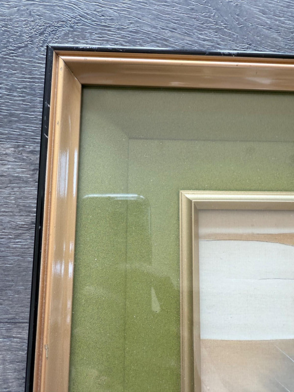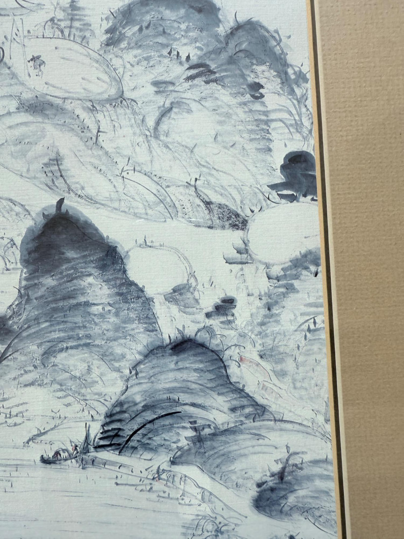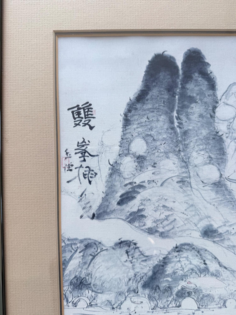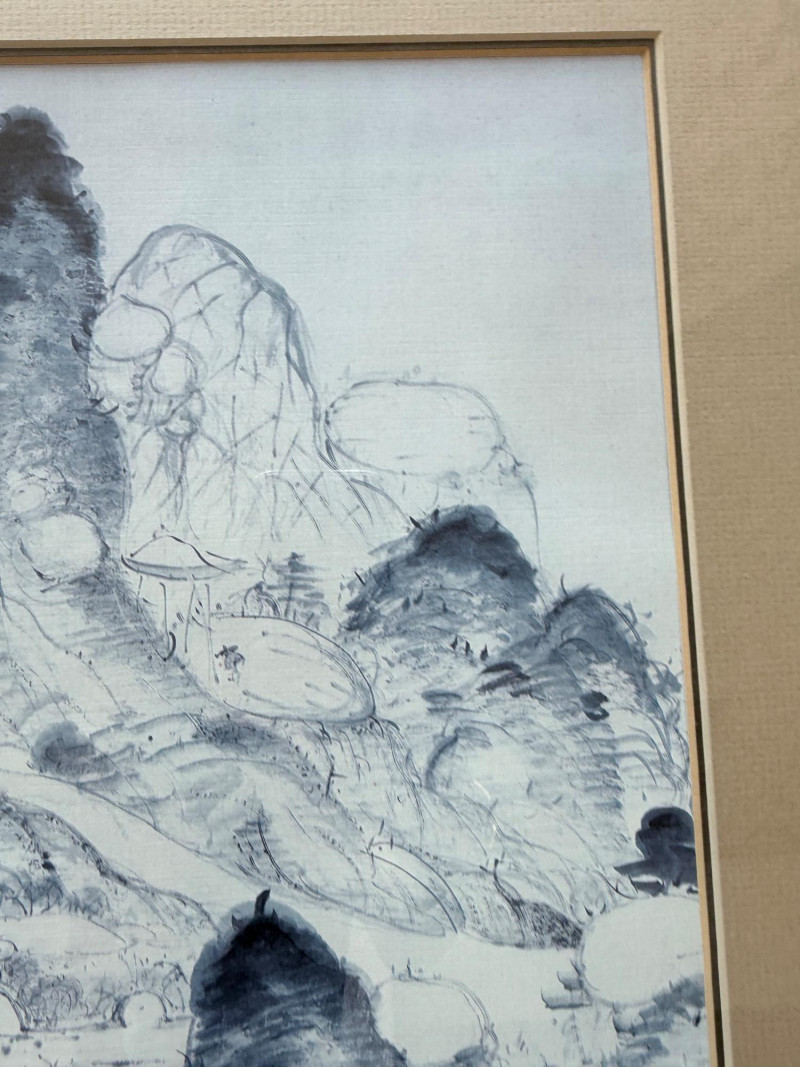 Three Artworks: Landscape, Village Scene and Court Illustration A set of three framed works featuring varied subjects and regional styles. The first depicts a monochrome landscape with mountain formations, rivers, and trees rendered in ink on paper. A vertical inscription and red seal are visible in the upper corner. The artwork is matted and presented in a metal frame. The second shows a rural farming scene with figures harvesting rice in terraced fields. Water buffalo, palm trees, and layered vegetation appear throughout the composition. The painting is mounted on white backing and set in a red-painted wood frame. The frame is labeled as manufactured by Intercraft Industries in Thailand. The third features a courtly scene with multiple figures dressed in traditional robes positioned around an architectural gate. The composition includes stylized rooflines, cloud bands, and a red seal in the lower corner. The piece is framed with a green mat and set in a wood frame with a gold inner border. Set Includes: