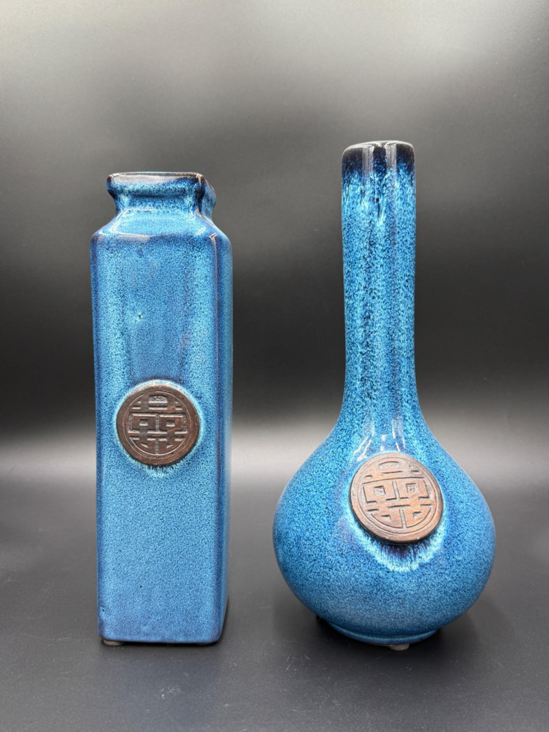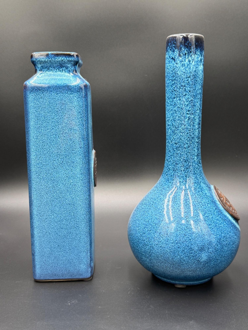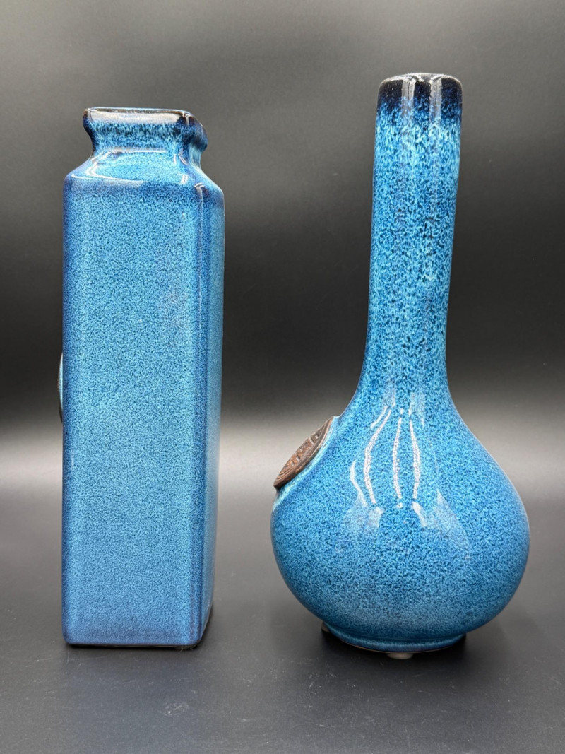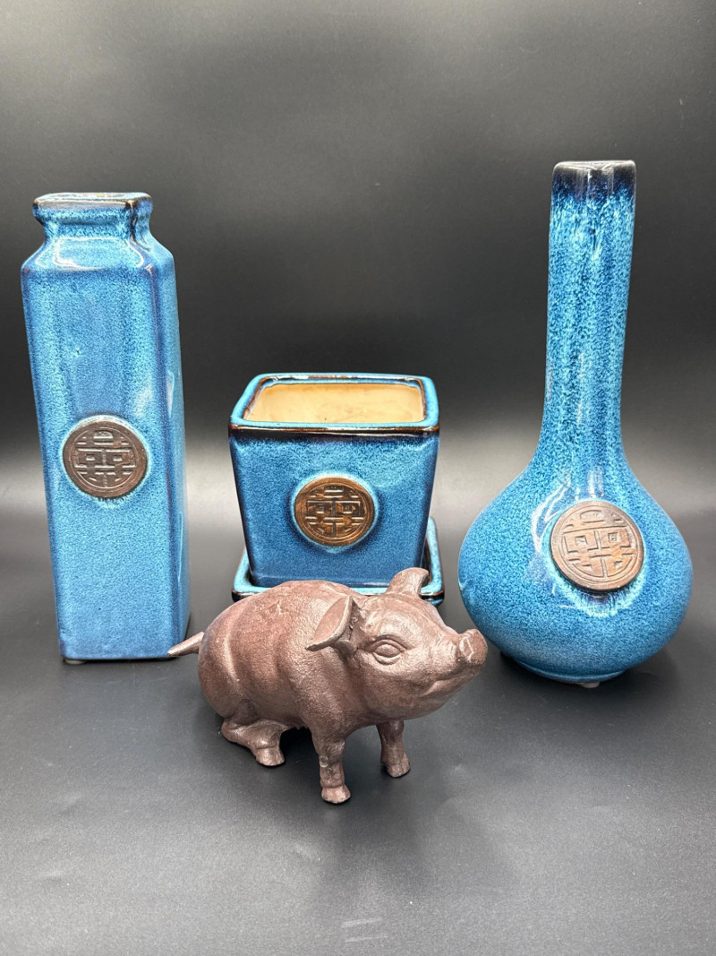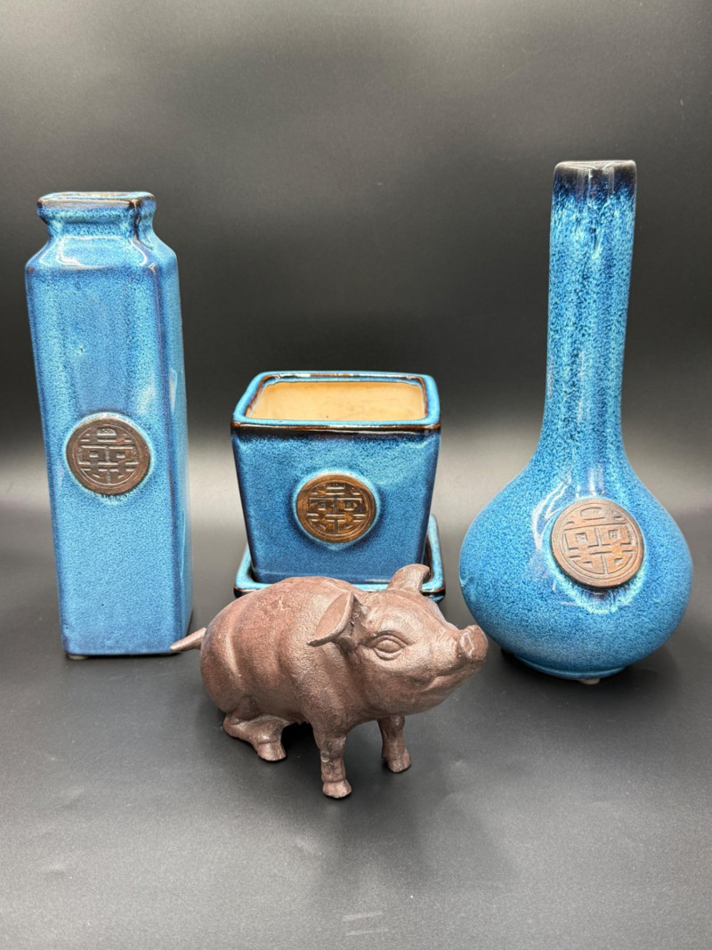 Cobalt Blue Glazed Ceramic Vessel Trio with Metal Pig Figurine Set of three glazed ceramic vessels with raised circular medallions, finished in a likely cobalt blue tone. The group includes a tall rectangular bottle vase, a rounded vase with narrow neck, and a square planter with fitted tray. Accompanied by a metal pig figurine in a forward stance, possibly cast iron. Dimensions: Ceramic vessels: 6" to 13" H Pig: 4.5" H x 8" L