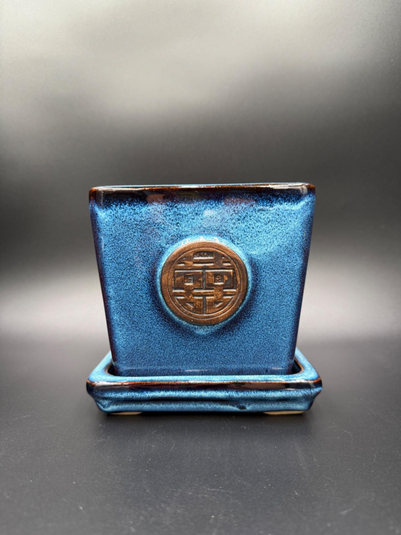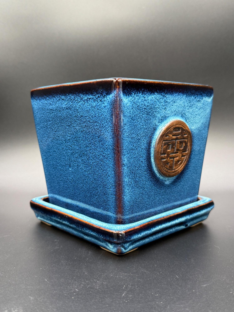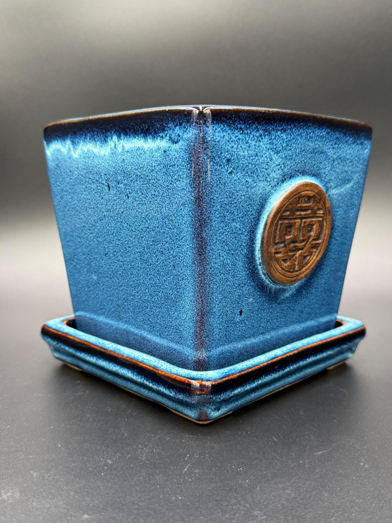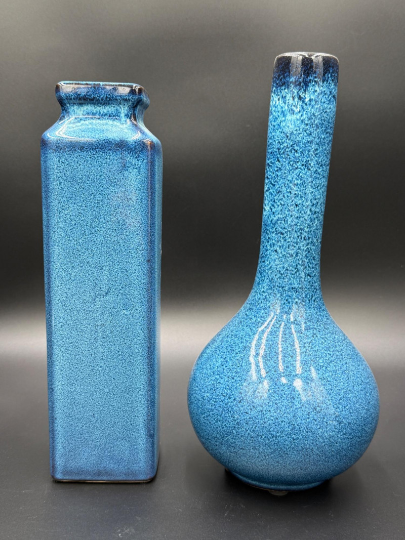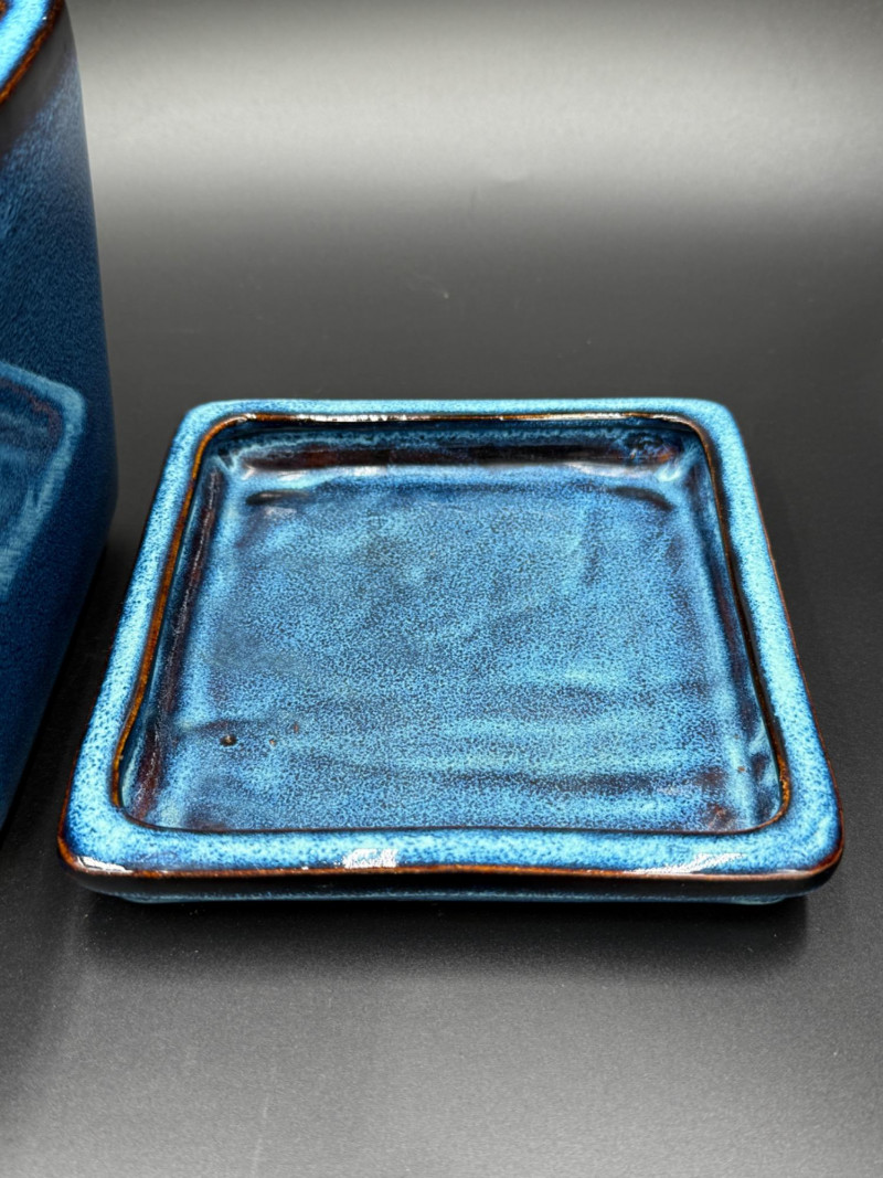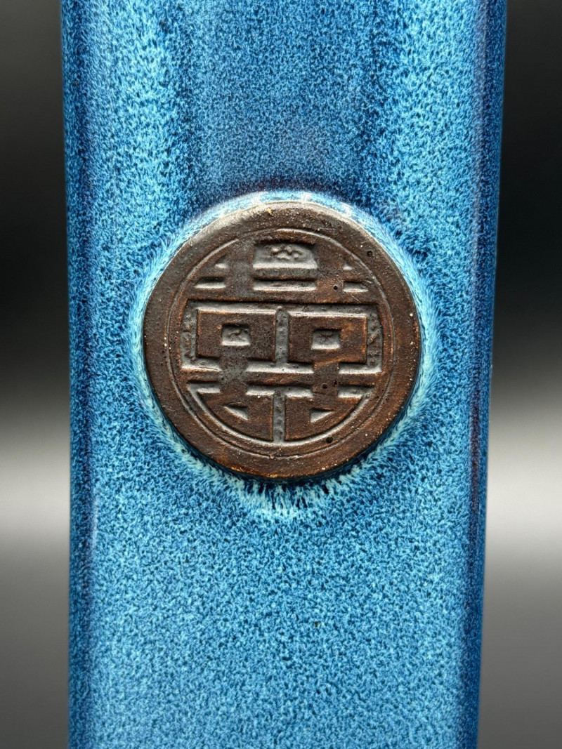 Cobalt Blue Glazed Ceramic Vessel Trio with Metal Pig Figurine Set of three glazed ceramic vessels with raised circular medallions, finished in a likely cobalt blue tone. The group includes a tall rectangular bottle vase, a rounded vase with narrow neck, and a square planter with fitted tray. Accompanied by a metal pig figurine in a forward stance, possibly cast iron. Dimensions: Ceramic vessels: 6" to 13" H Pig: 4.5" H x 8" L