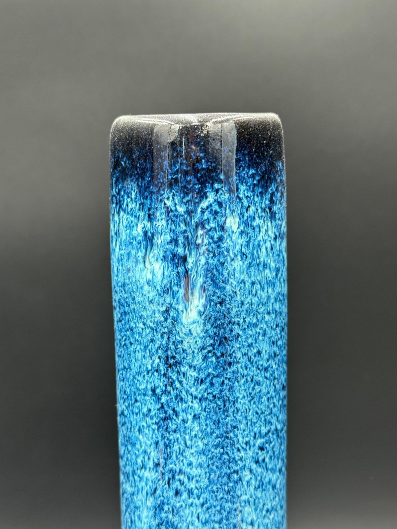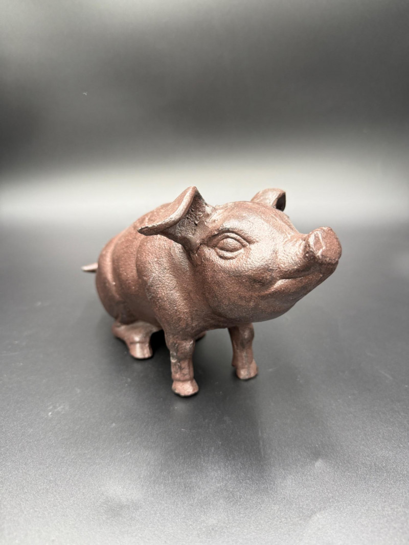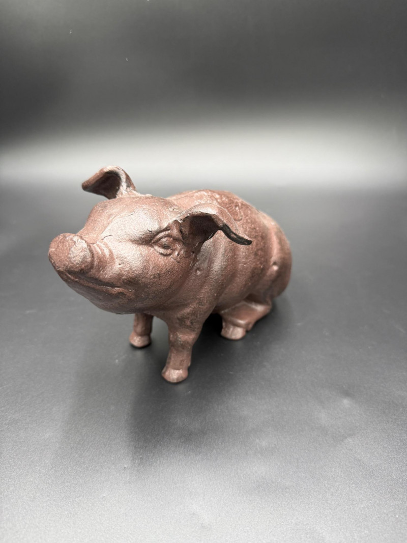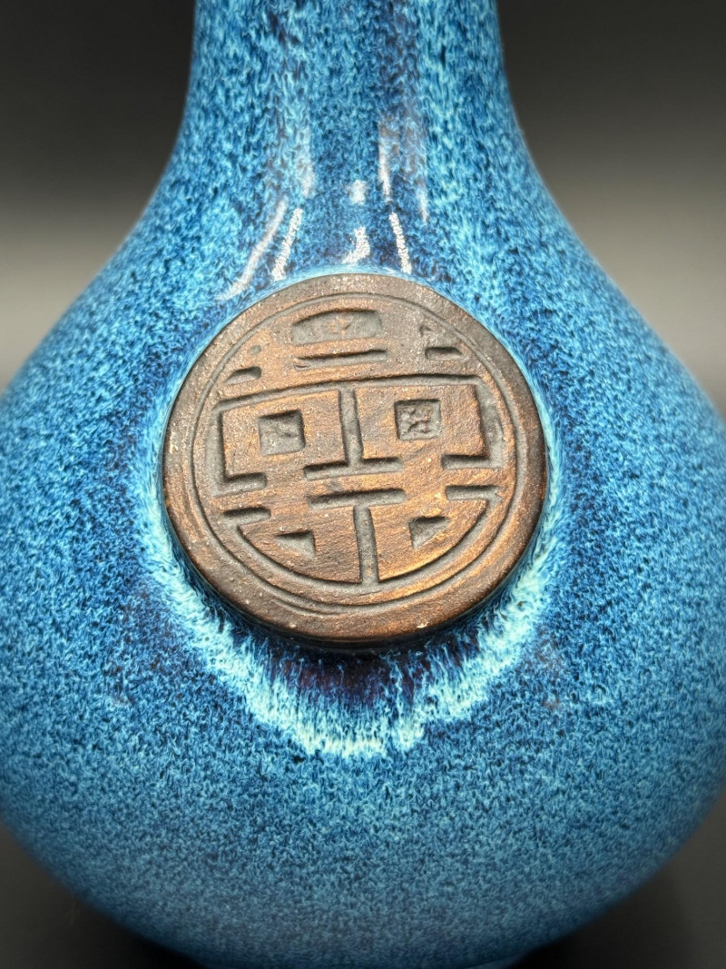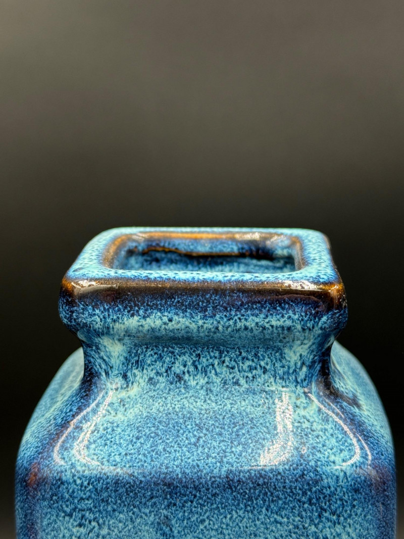 Cobalt Blue Glazed Ceramic Vessel Trio with Metal Pig Figurine Set of three glazed ceramic vessels with raised circular medallions, finished in a likely cobalt blue tone. The group includes a tall rectangular bottle vase, a rounded vase with narrow neck, and a square planter with fitted tray. Accompanied by a metal pig figurine in a forward stance, possibly cast iron. Dimensions: Ceramic vessels: 6" to 13" H Pig: 4.5" H x 8" L