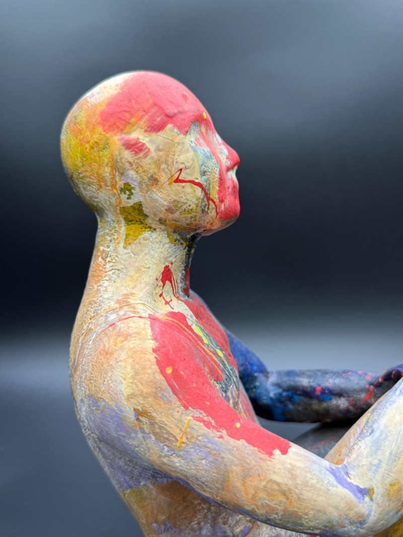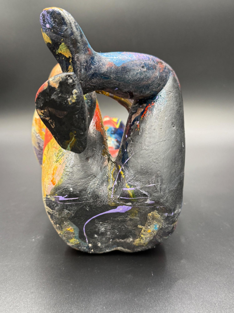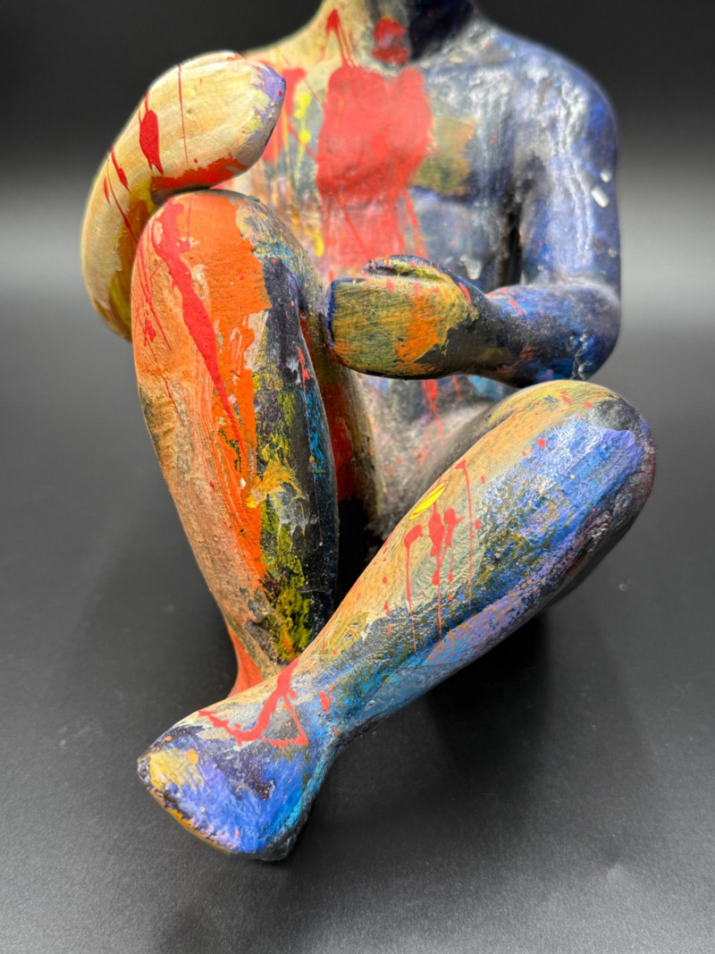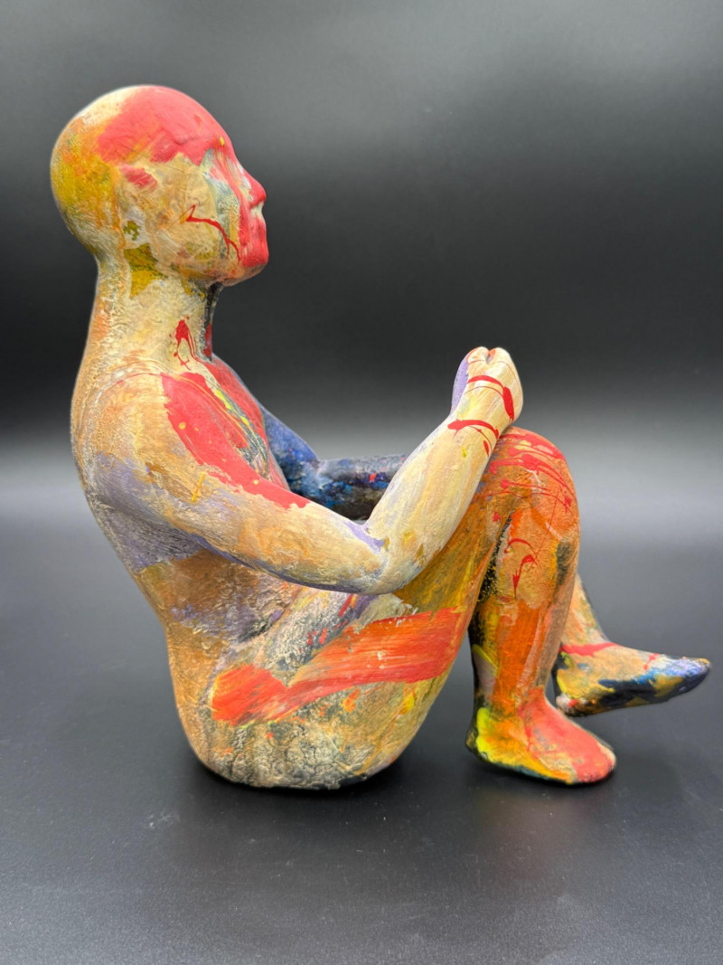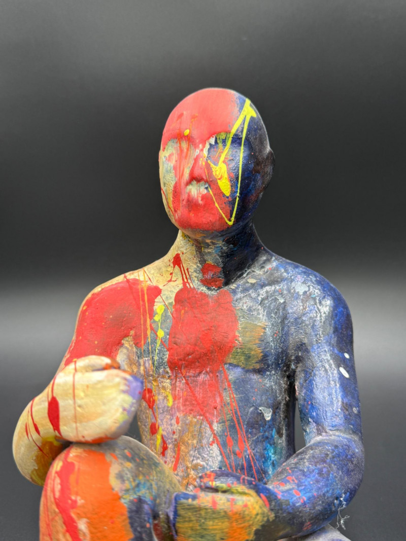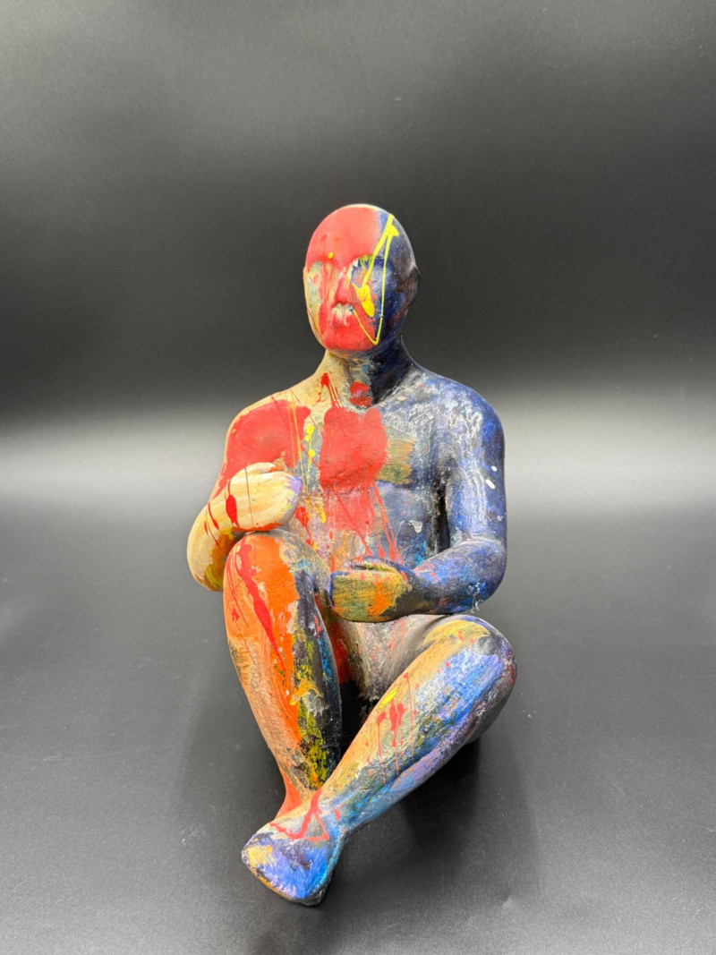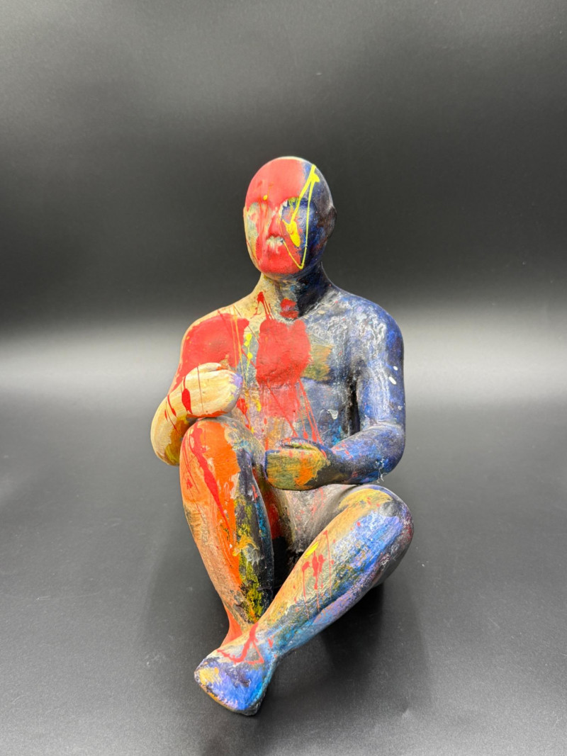 Painted Seated Male Figure Sculpture – 10" Tall Solid figure of a seated man with arms resting over raised knees and head angled forward. The surface is layered with strokes, splatters, and drips in varied pigments. The contours of the face and body are partially obscured by overlapping color. The piece is formed in a single structure with no separate base, allowing it to sit directly on a flat surface. Possibly ceramic. There is another one similar to this on lot 5. Dimensions: 10" H x 6" W x 9" D