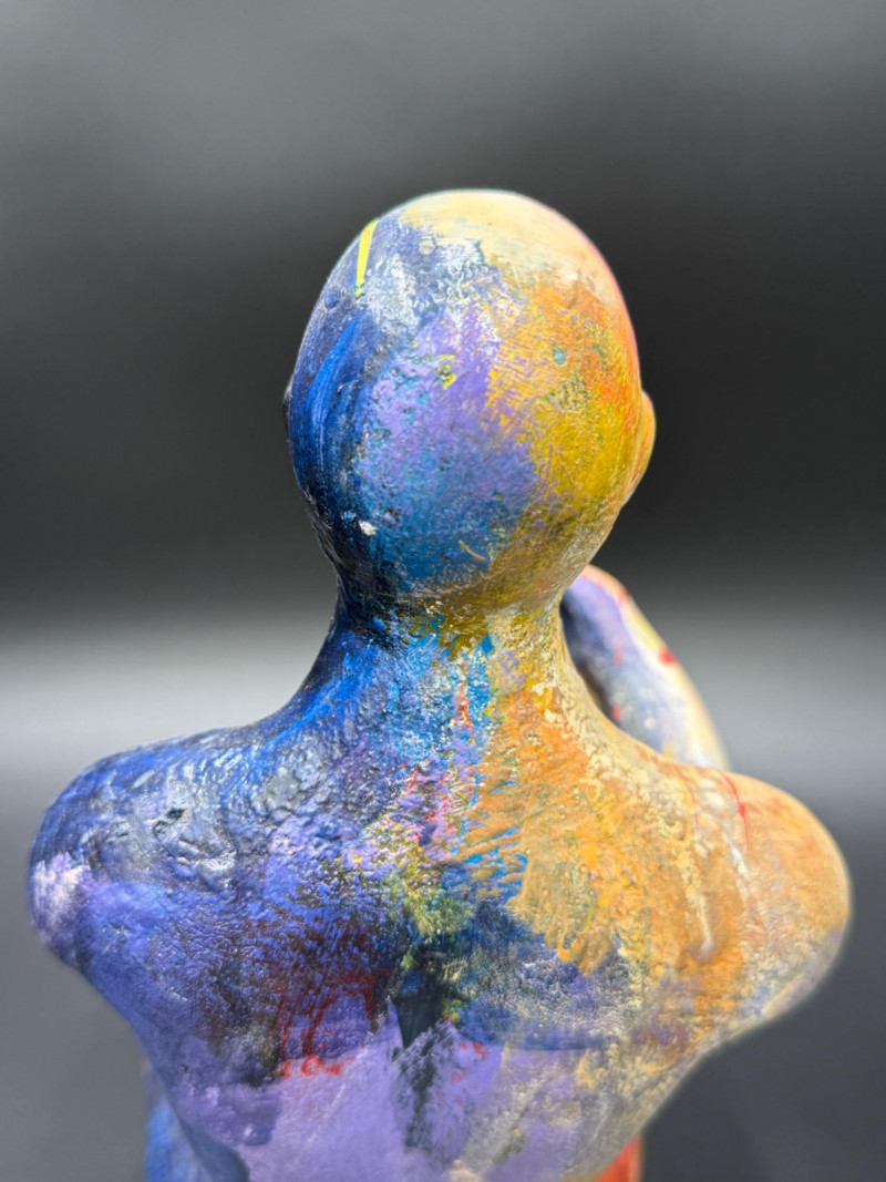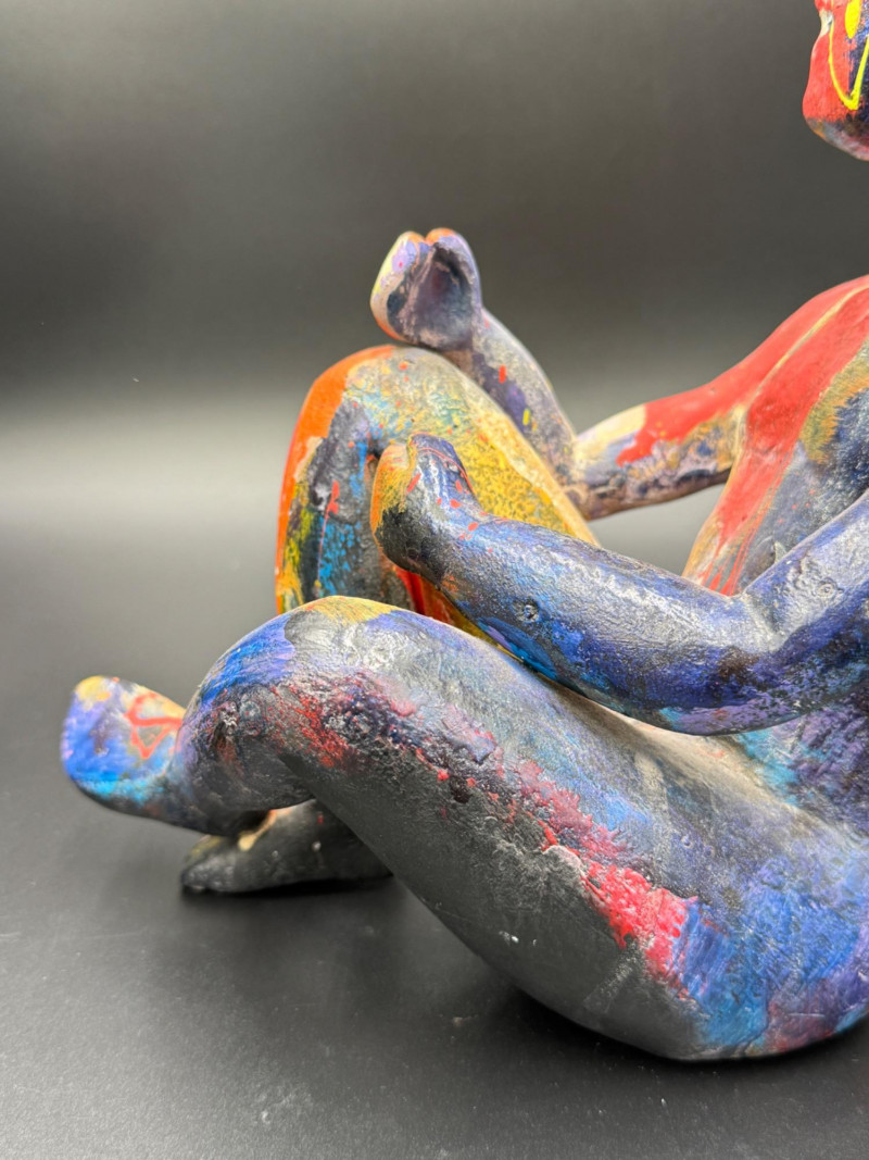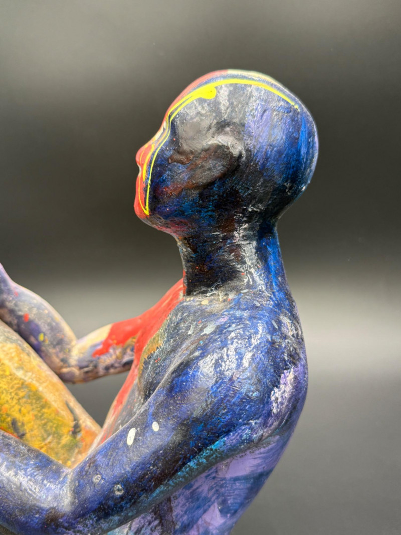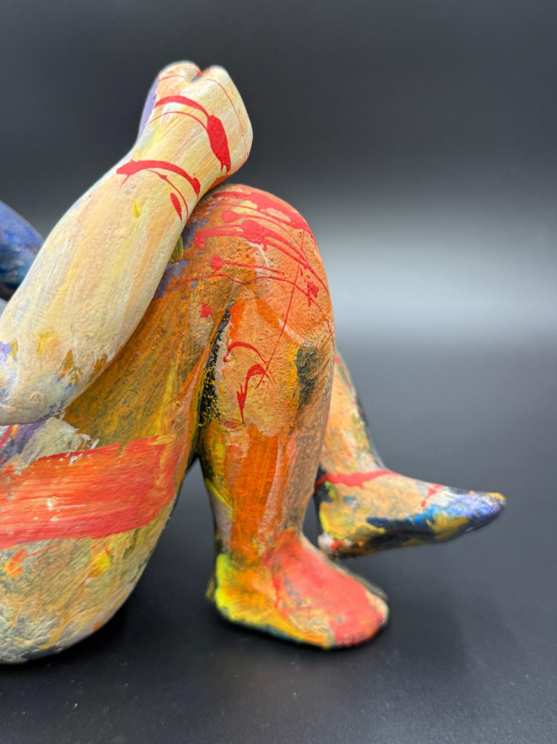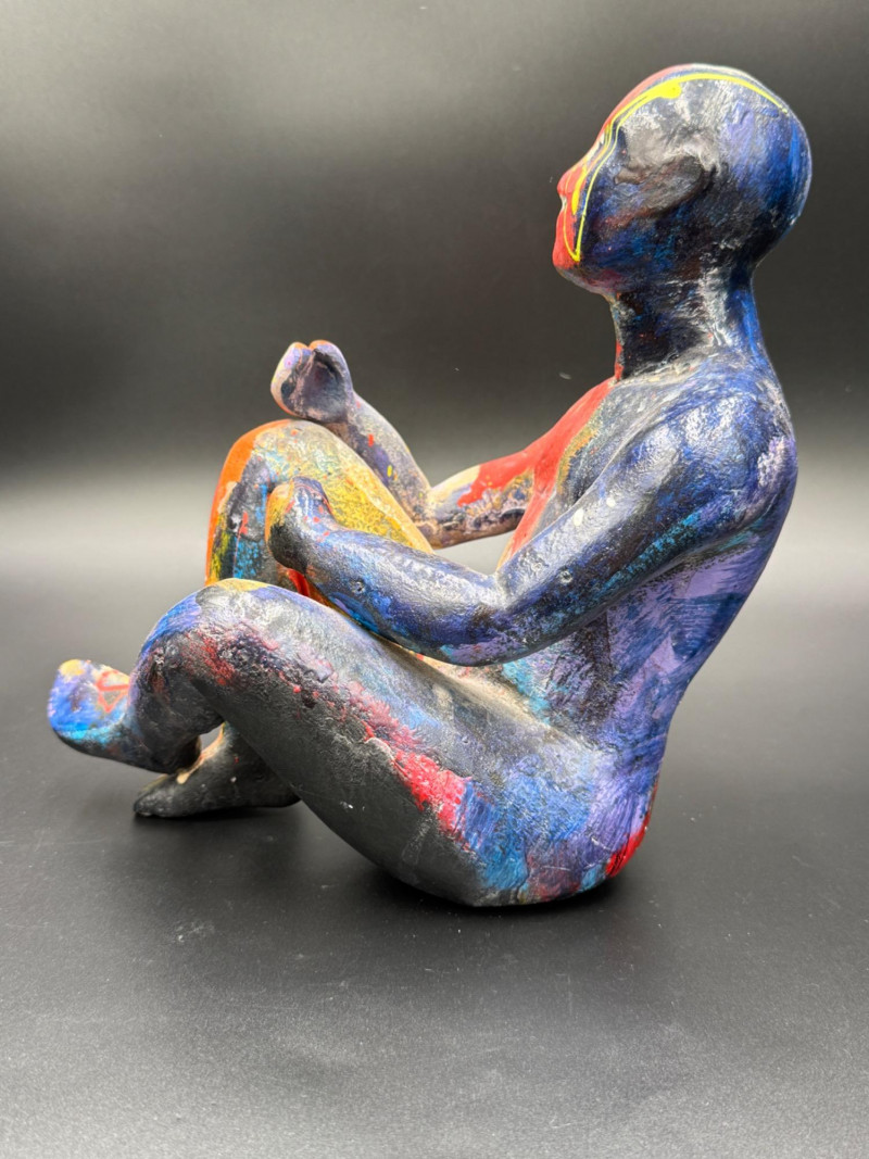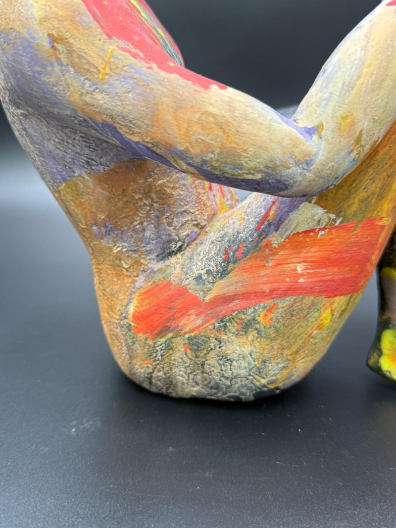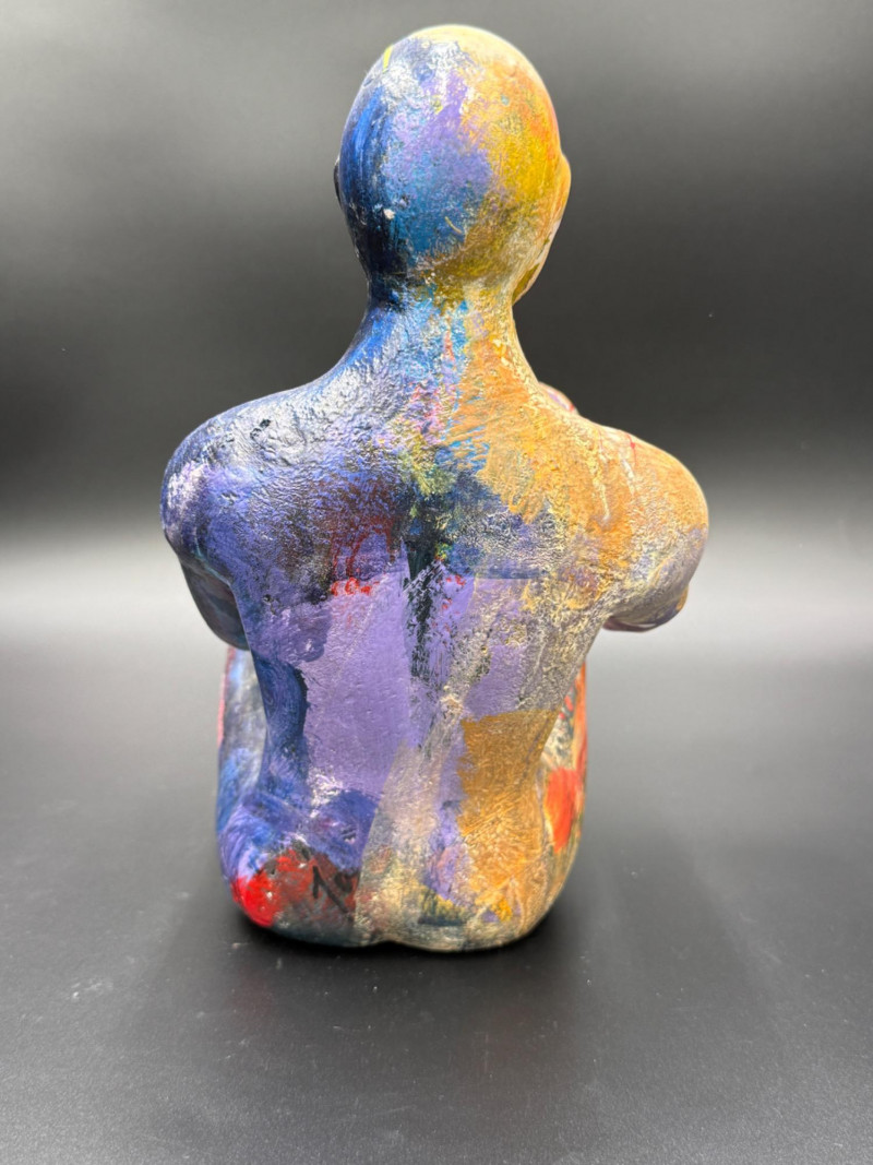 Painted Seated Male Figure Sculpture – 10" Tall Solid figure of a seated man with arms resting over raised knees and head angled forward. The surface is layered with strokes, splatters, and drips in varied pigments. The contours of the face and body are partially obscured by overlapping color. The piece is formed in a single structure with no separate base, allowing it to sit directly on a flat surface. Possibly ceramic. There is another one similar to this on lot 5. Dimensions: 10" H x 6" W x 9" D