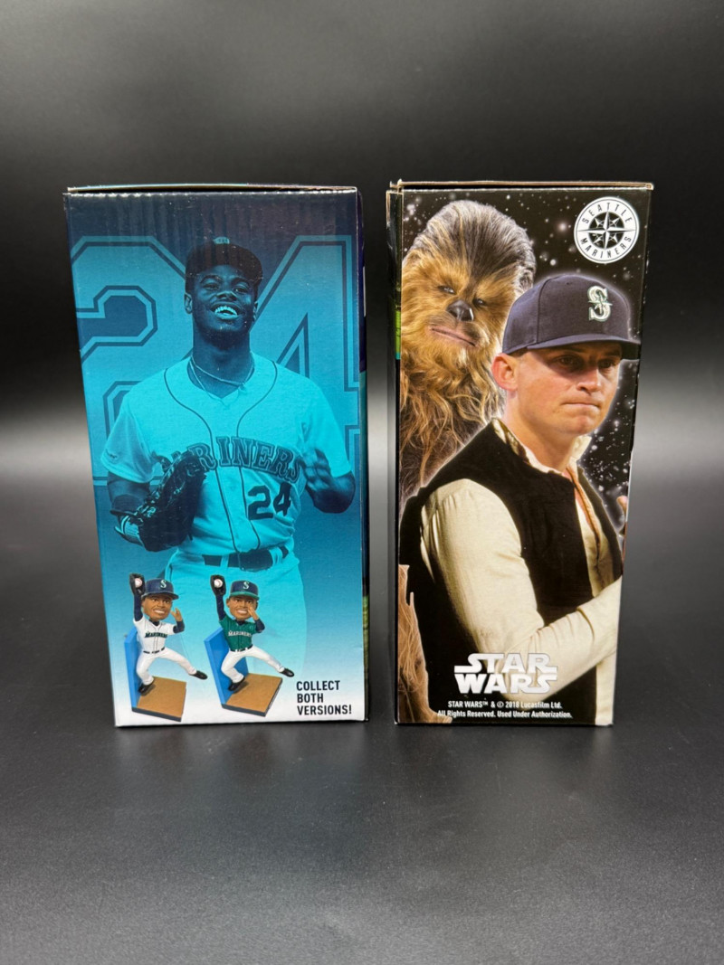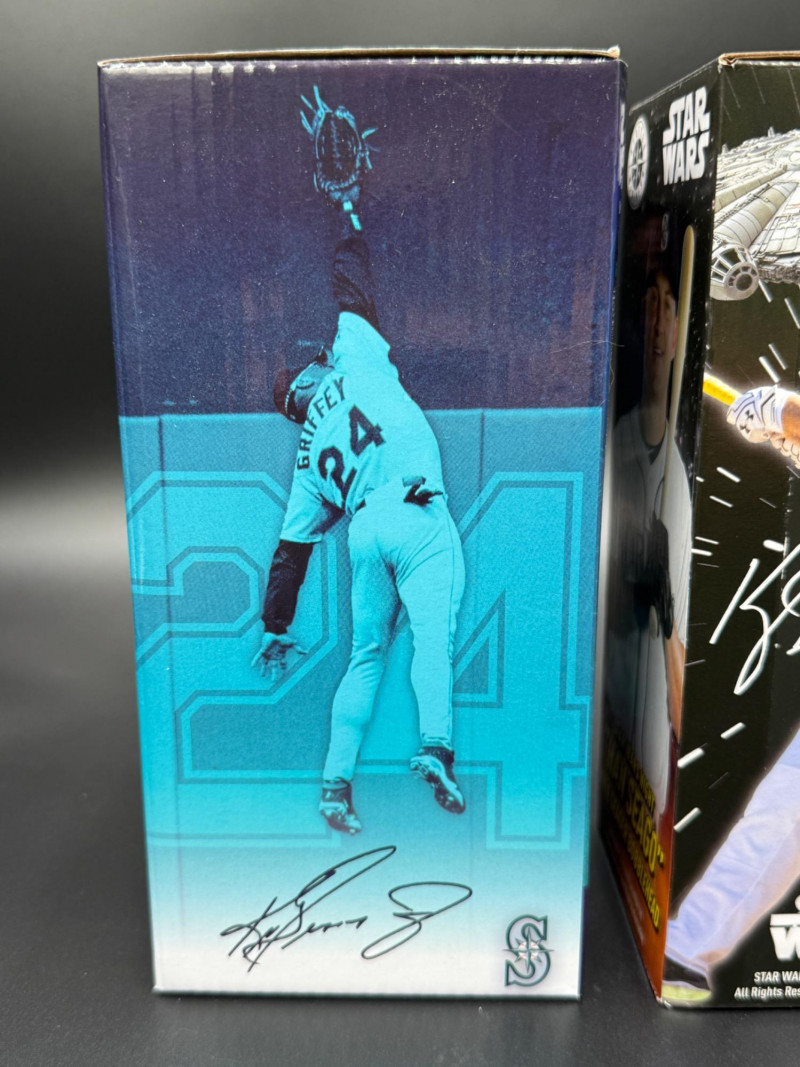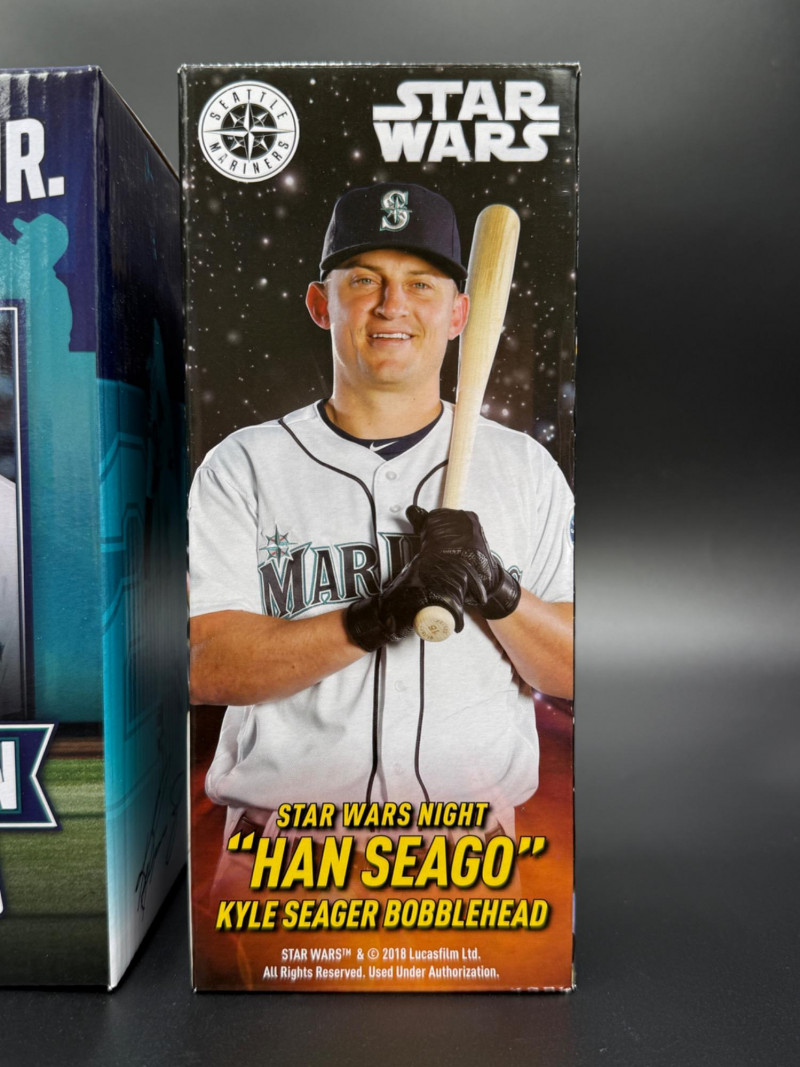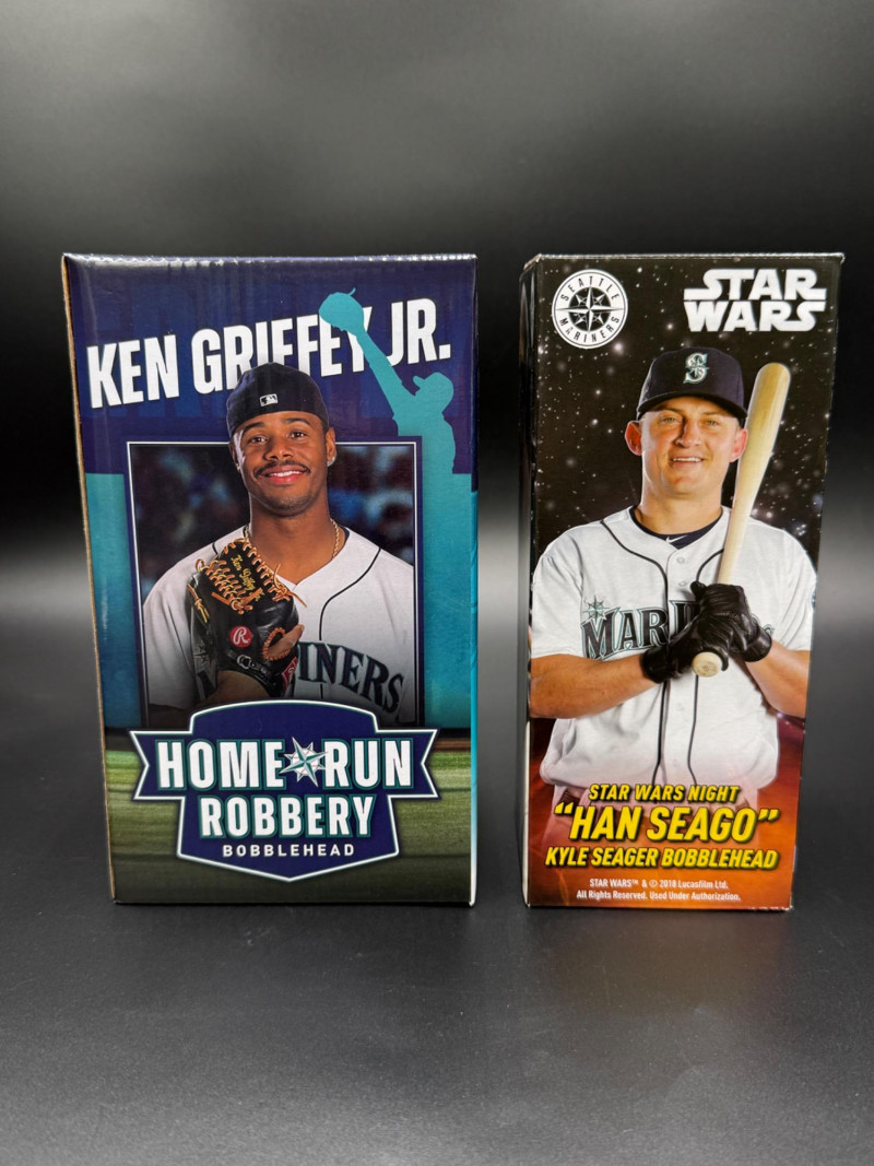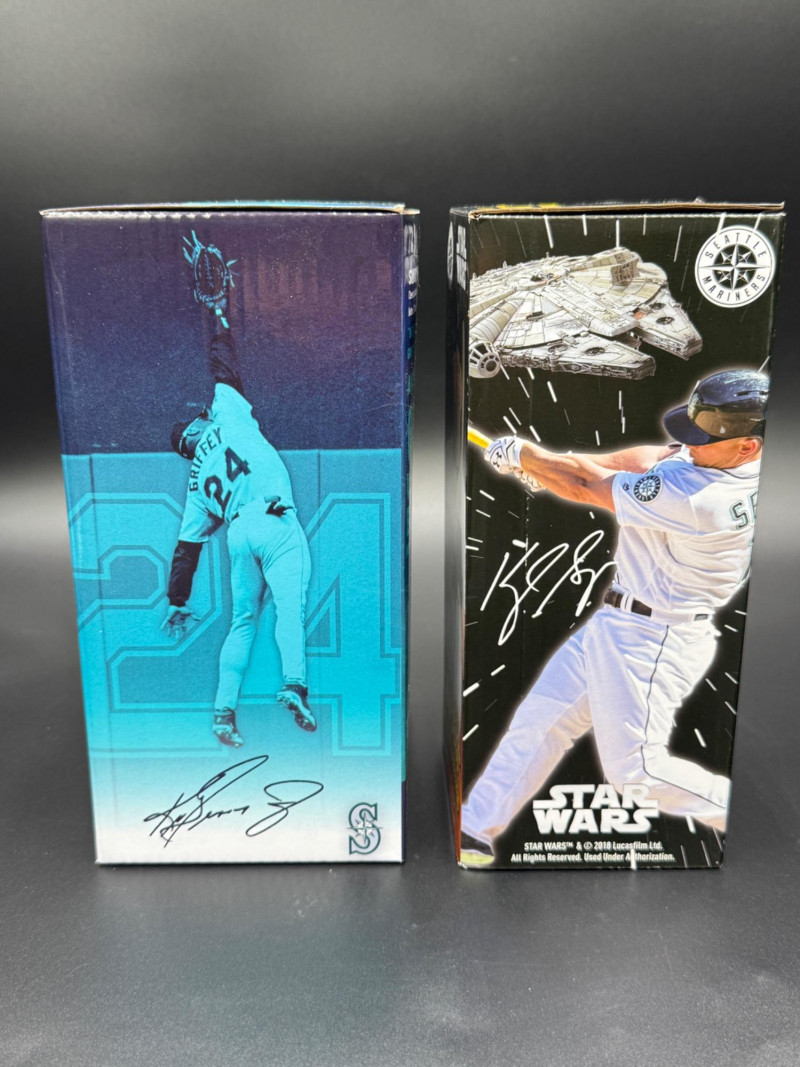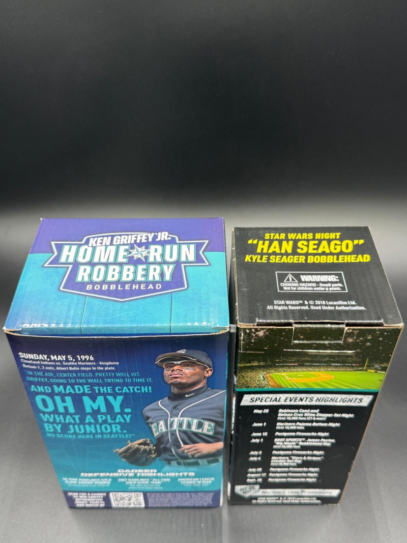 Ken Griffey Jr. & Kyle Seager Mariners Bobblehead Pair – Unopened Two Seattle Mariners bobbleheads in original unopened packaging. One features Ken Griffey Jr. commemorating a home run-saving catch, while the other depicts Kyle Seager as “Han Seago” from the team’s Star Wars Night promotion. Each box includes themed artwork and event-specific details. Box Dimensions (approx.): Ken Griffey Jr.: 5" x 7" x 8.5" Kyle Seager: 3.5" x 3.5" x 8.5" Team: Seattle Mariners