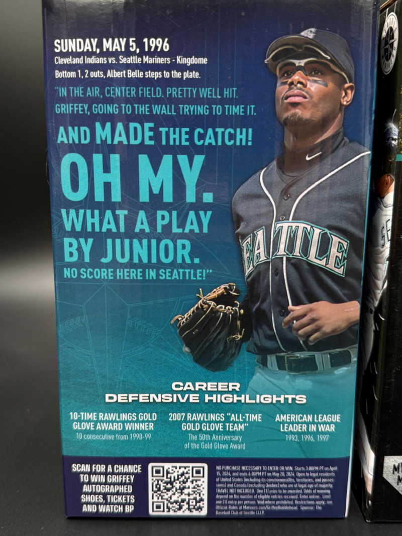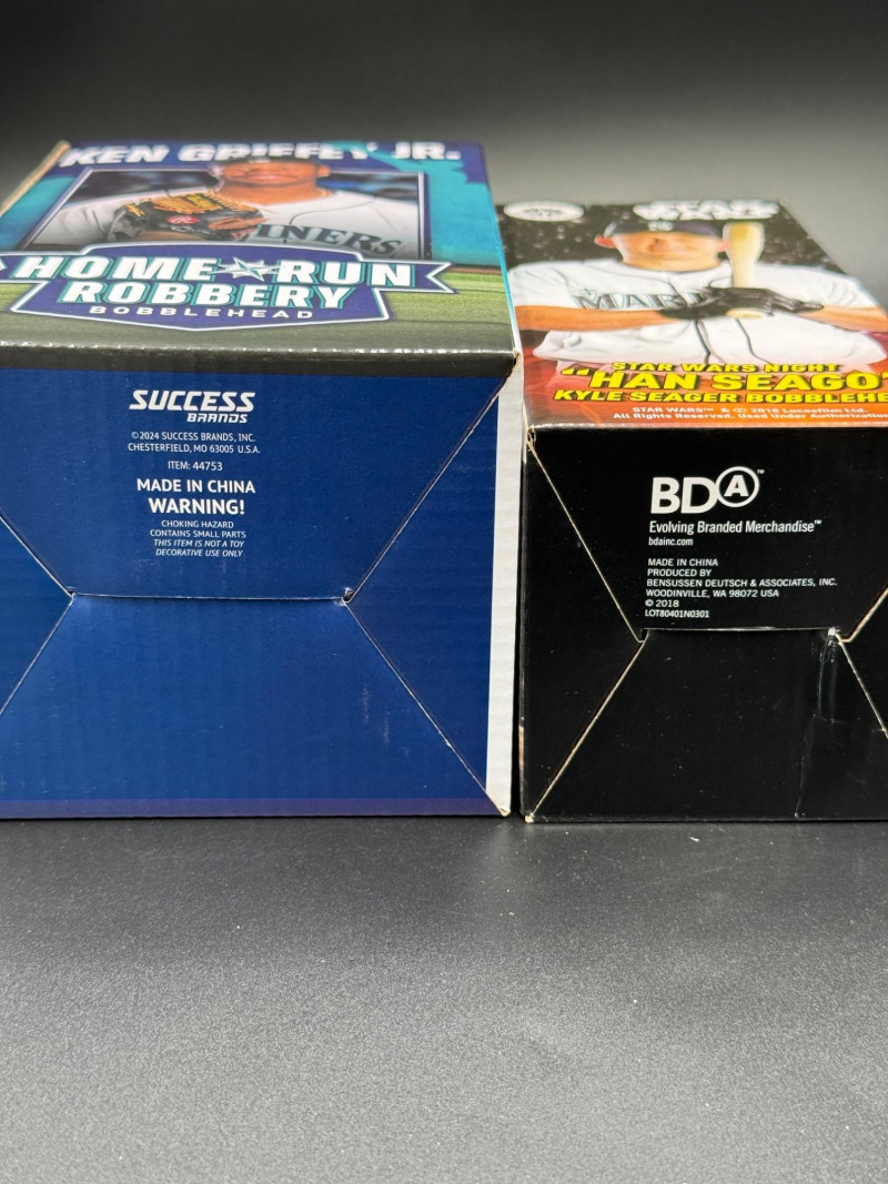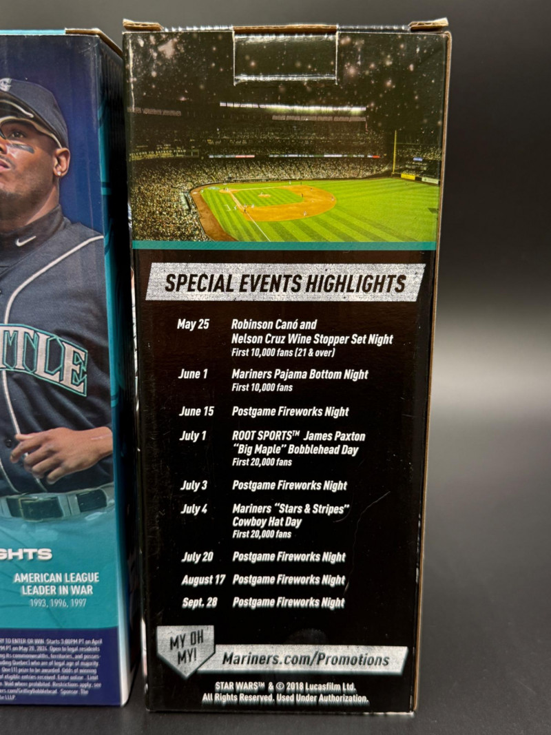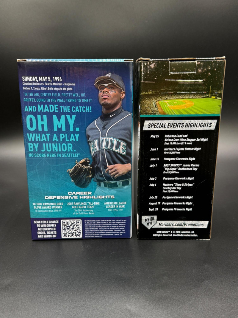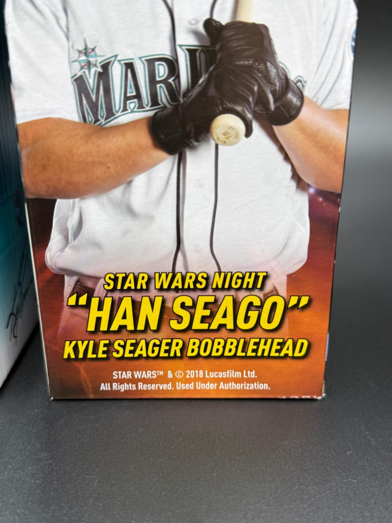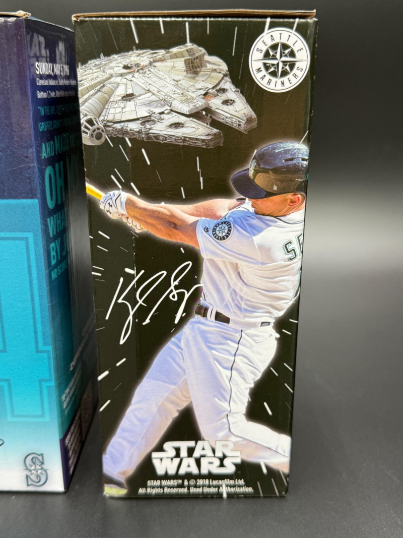 Ken Griffey Jr. & Kyle Seager Mariners Bobblehead Pair – Unopened Two Seattle Mariners bobbleheads in original unopened packaging. One features Ken Griffey Jr. commemorating a home run-saving catch, while the other depicts Kyle Seager as “Han Seago” from the team’s Star Wars Night promotion. Each box includes themed artwork and event-specific details. Box Dimensions (approx.): Ken Griffey Jr.: 5" x 7" x 8.5" Kyle Seager: 3.5" x 3.5" x 8.5" Team: Seattle Mariners