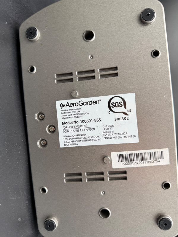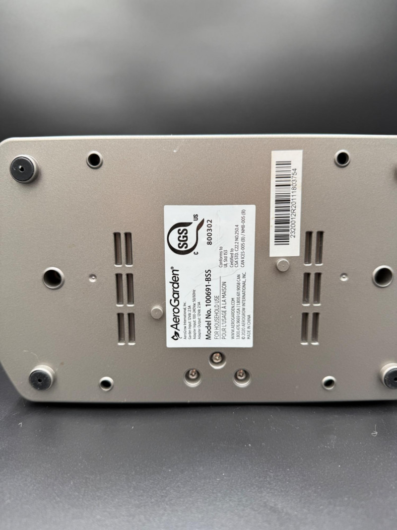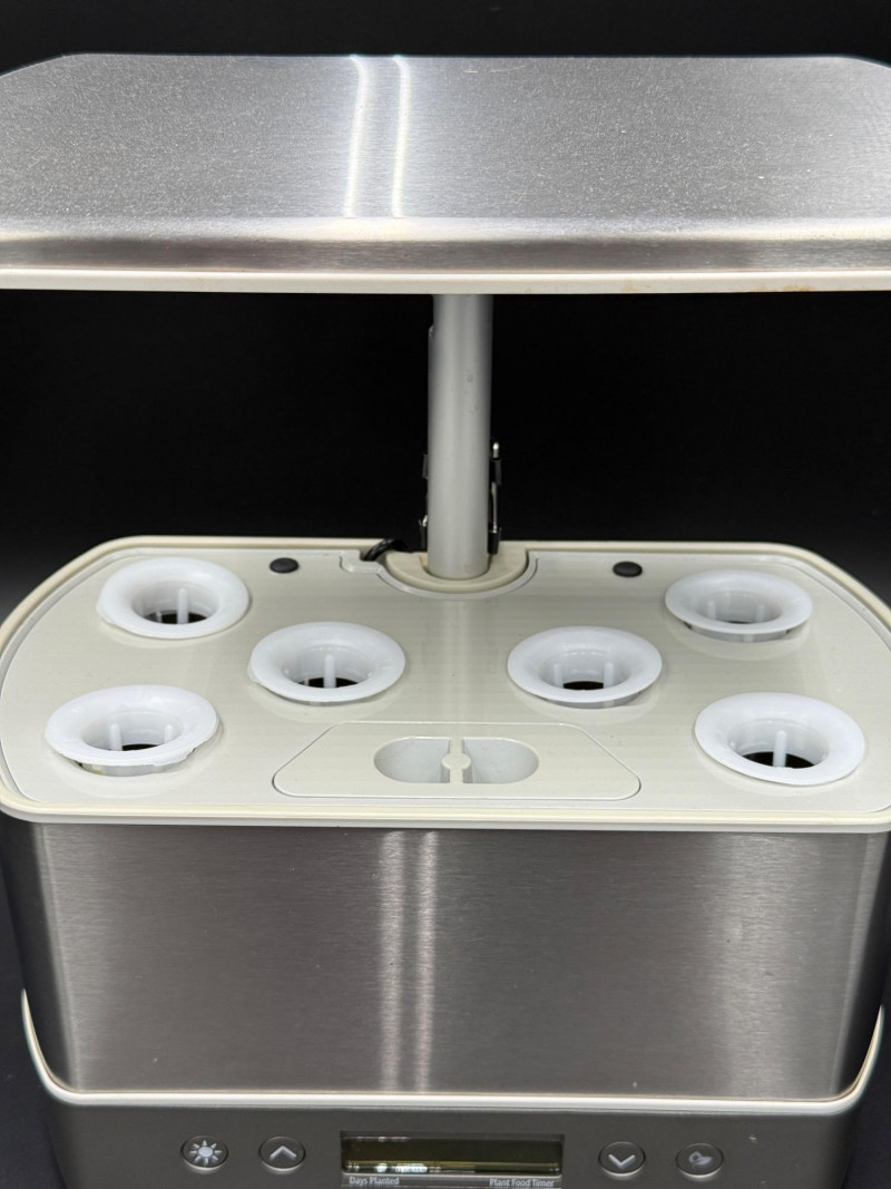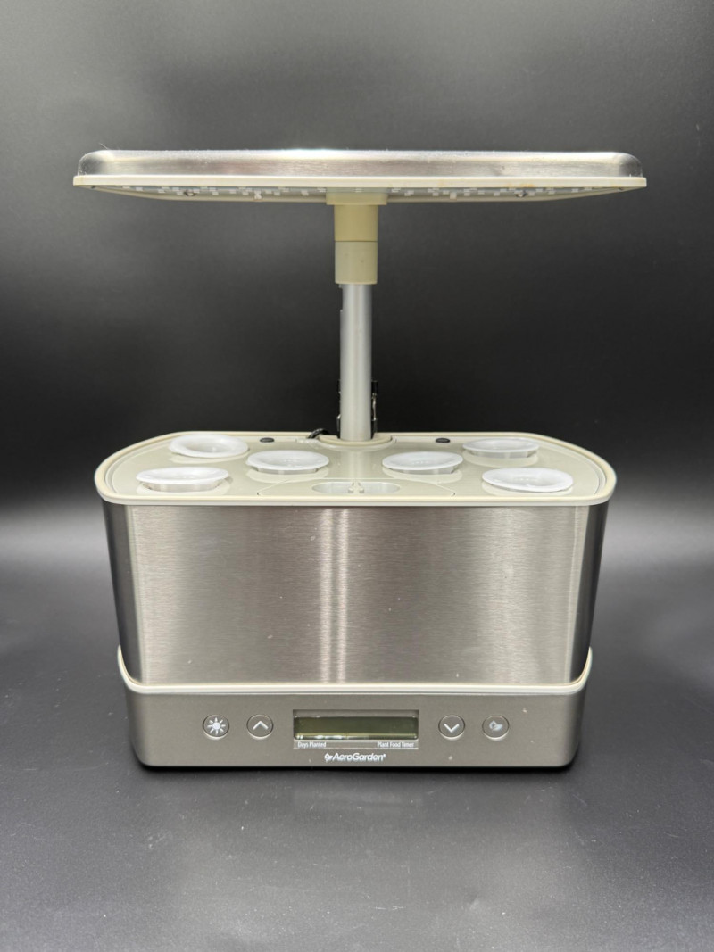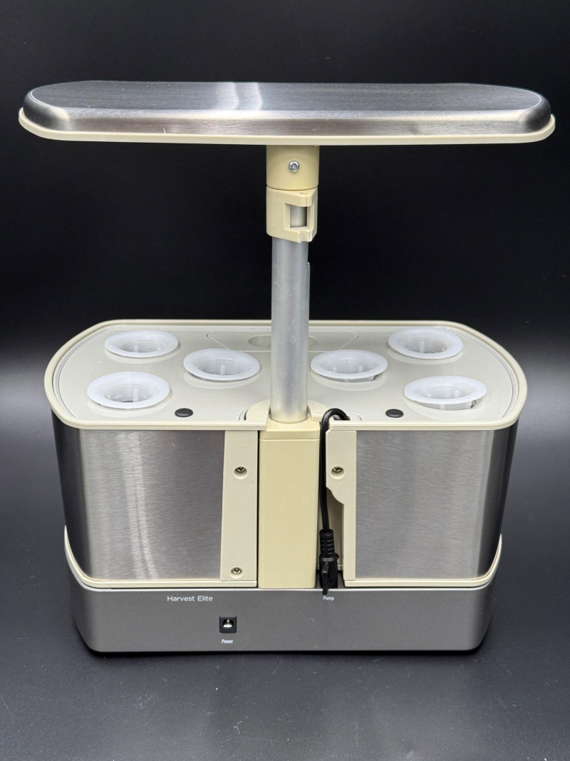 AeroGarden Harvest Elite with Yoocaa Seed Pod Kit Indoor hydroponic garden system with six planting ports and an overhead LED grow light panel. The light arm adjusts vertically, and the brushed metal base houses a digital control interface labeled “AeroGarden Harvest Elite.” Rear ports provide access for power and pump connections. The unit is marked Model No. 100691-BSS with a 12V 2.5A power specification. A sealed Yoocaa Seed Pod Kit is included, containing nutrients and seed baskets. Dimensions (approx.): Power cord and seeds included.