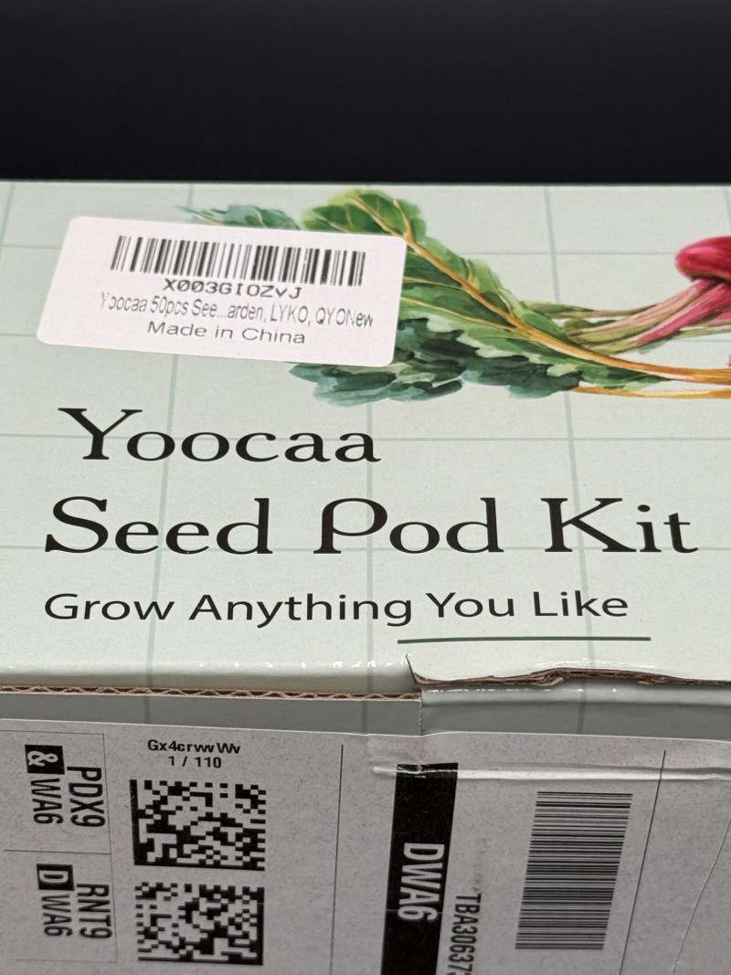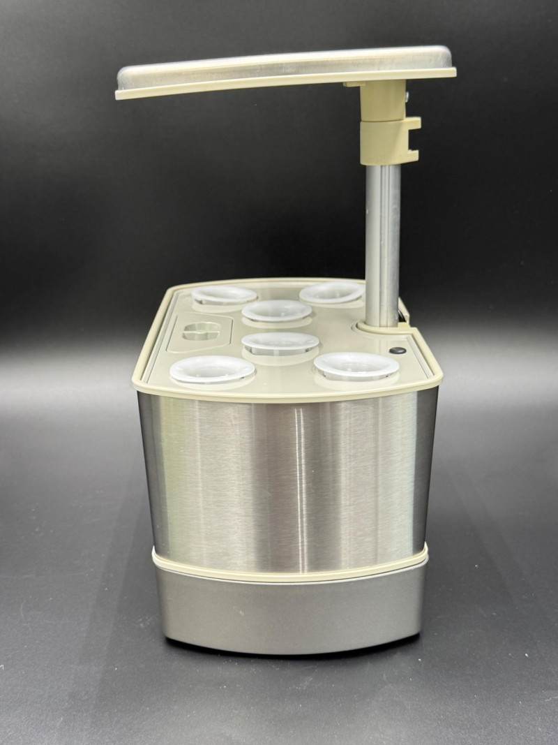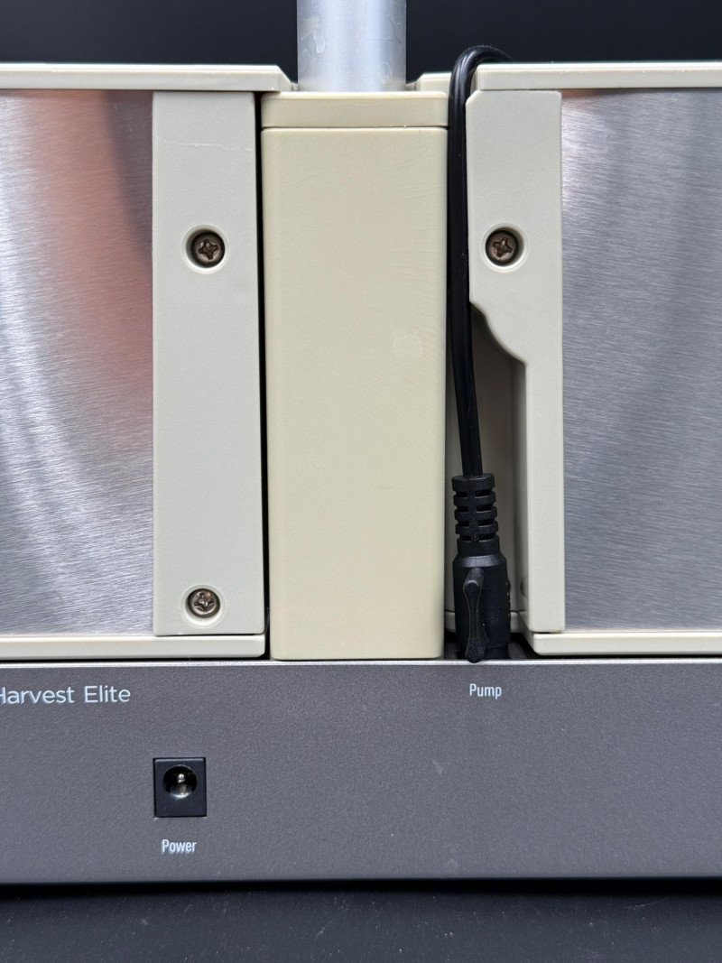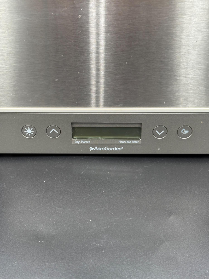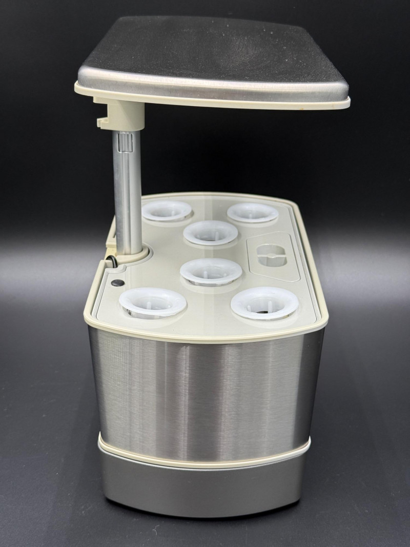 AeroGarden Harvest Elite with Yoocaa Seed Pod Kit Indoor hydroponic garden system with six planting ports and an overhead LED grow light panel. The light arm adjusts vertically, and the brushed metal base houses a digital control interface labeled “AeroGarden Harvest Elite.” Rear ports provide access for power and pump connections. The unit is marked Model No. 100691-BSS with a 12V 2.5A power specification. A sealed Yoocaa Seed Pod Kit is included, containing nutrients and seed baskets. Dimensions (approx.): Power cord and seeds included.