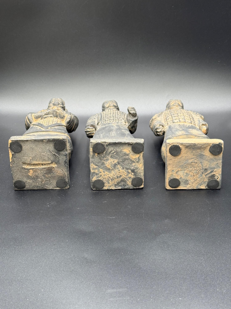 Terracotta Warrior Figurine Trio – 11" Tall Set of three sculptural figures inspired by the Terracotta Army, each rendered in resin with detailed surface textures replicating traditional armor and attire. The trio includes variations in pose and headdress, standing on square plinth bases with protective felt pads underneath. The finish mimics aged stone with traces of earth-toned residue. Dimensions: