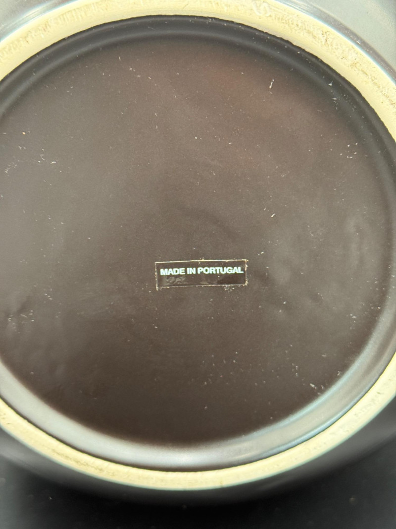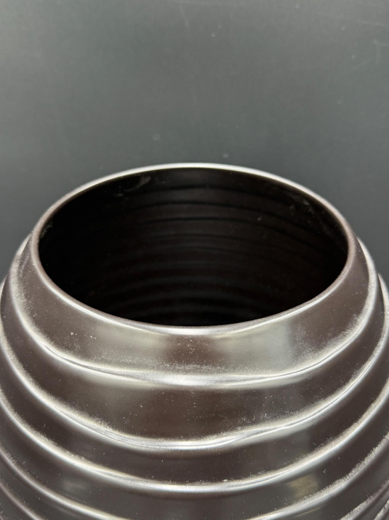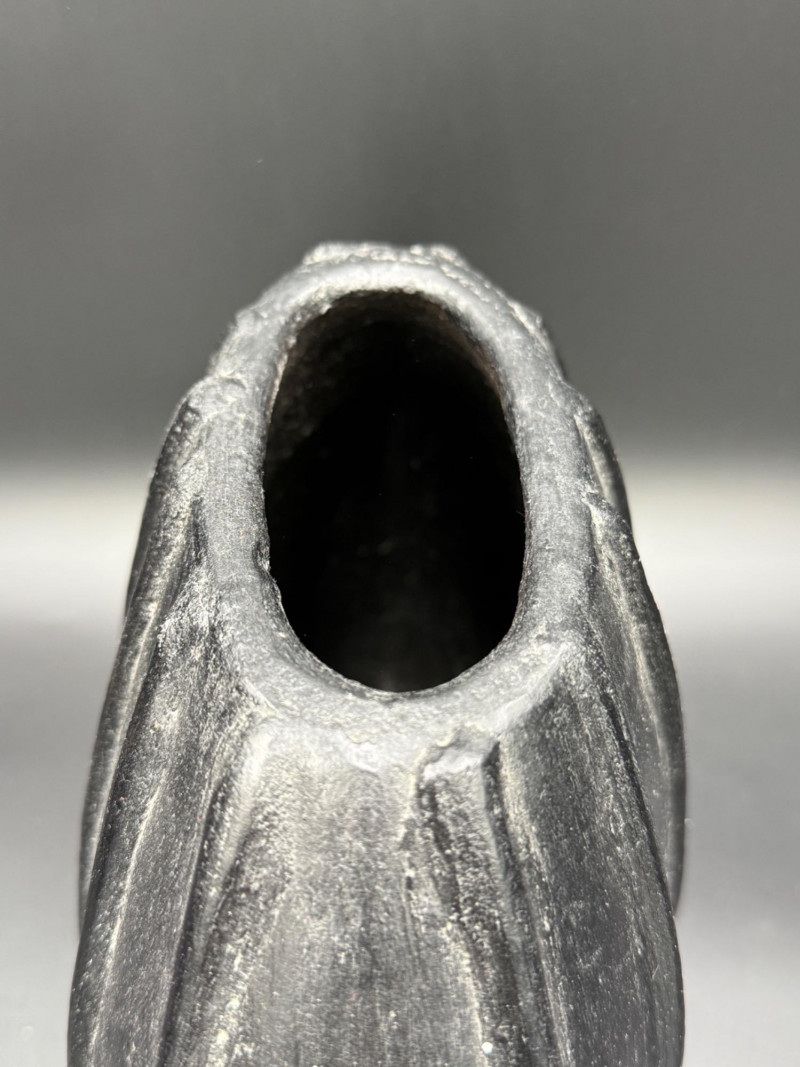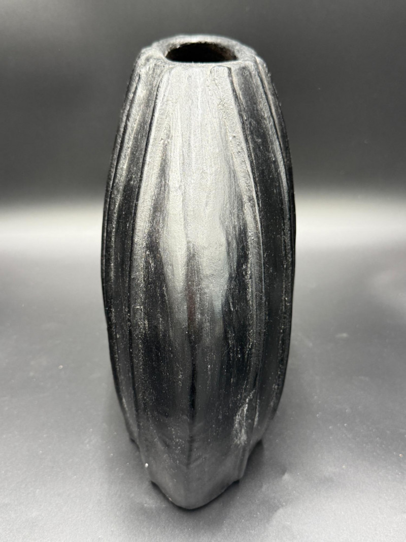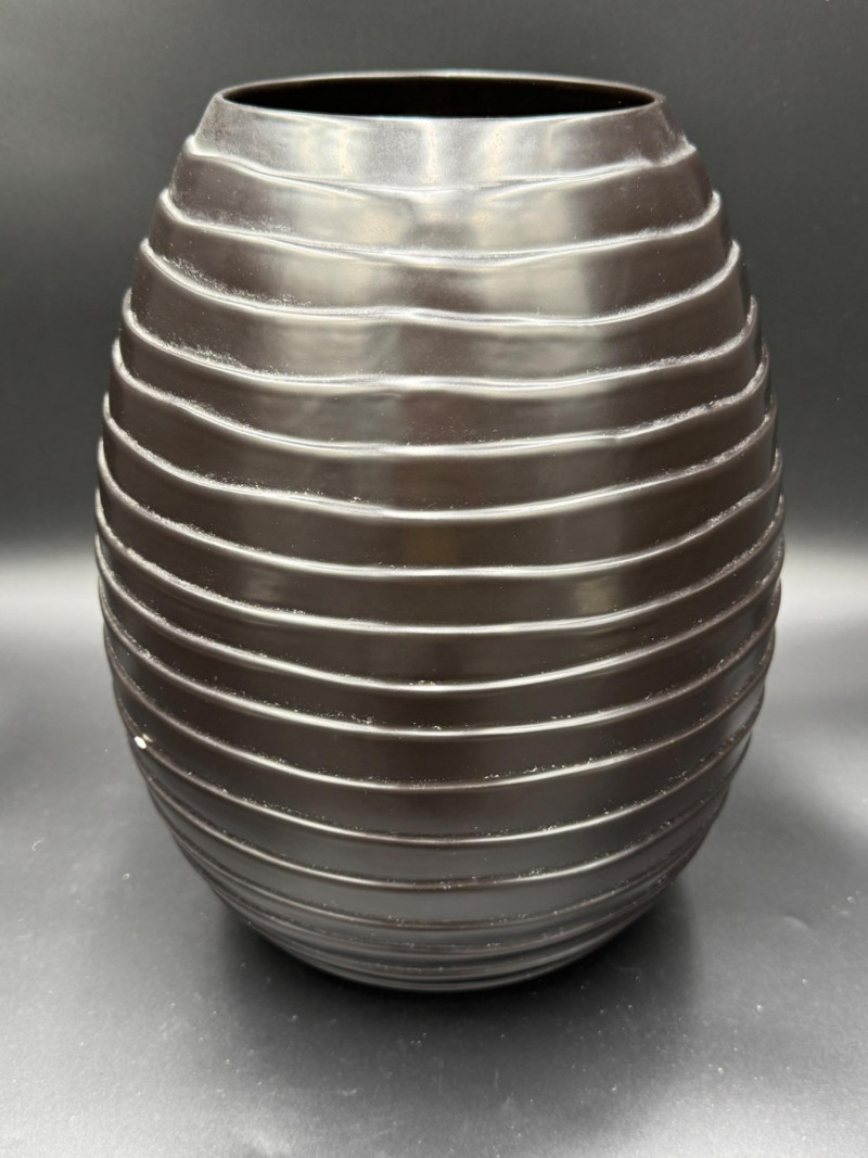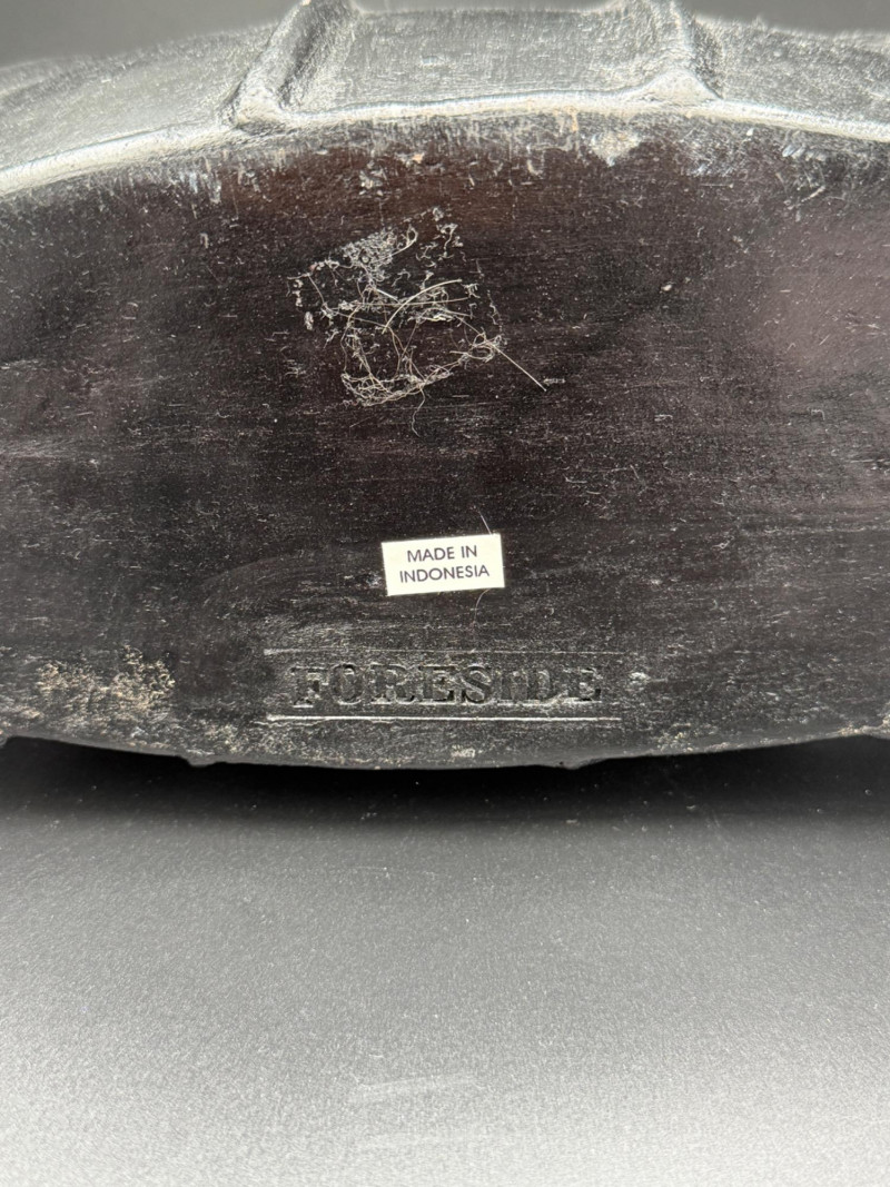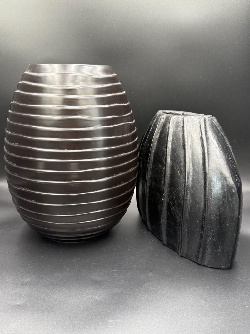 Portugal and Indonesia Decorative Vase Pair Pair of sculptural vessels with dark finishes and contrasting surface designs. One piece, marked “Made in Portugal,” has a rounded form with continuous horizontal bands. The other, marked “Made in Indonesia” and labeled “FORESIDE,” features a multi-faceted profile with vertical grooves and a flattened back. Both exhibit varied surface textures and signs of wear. Dimensions:
