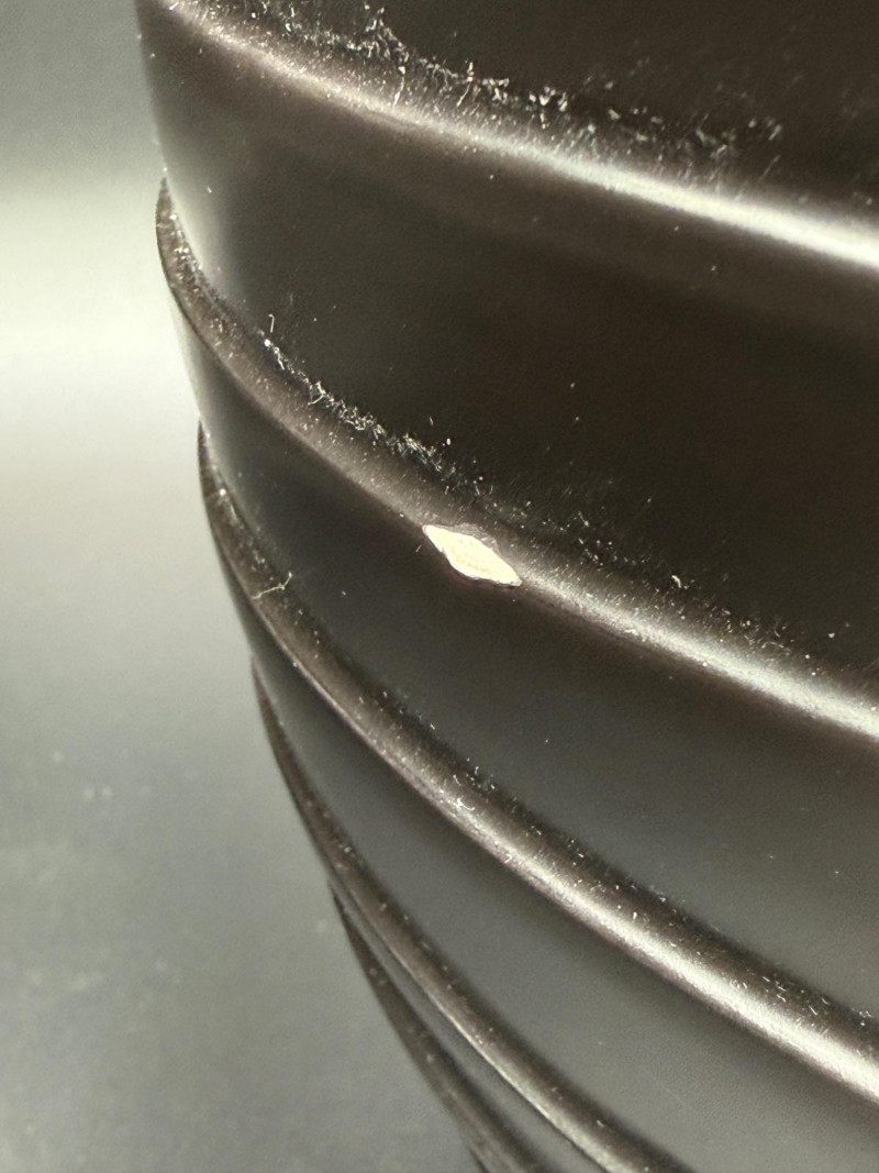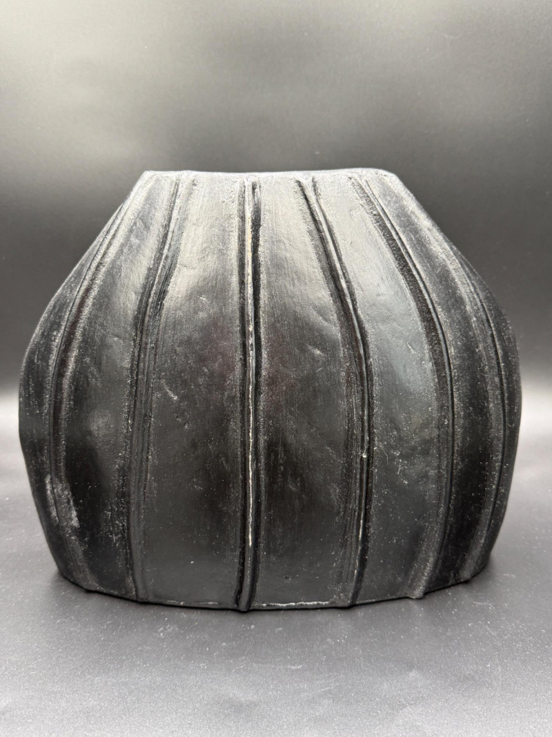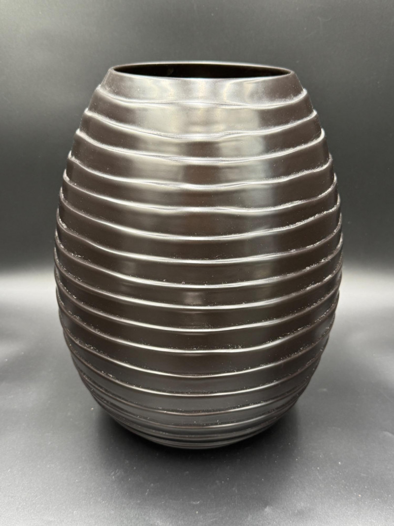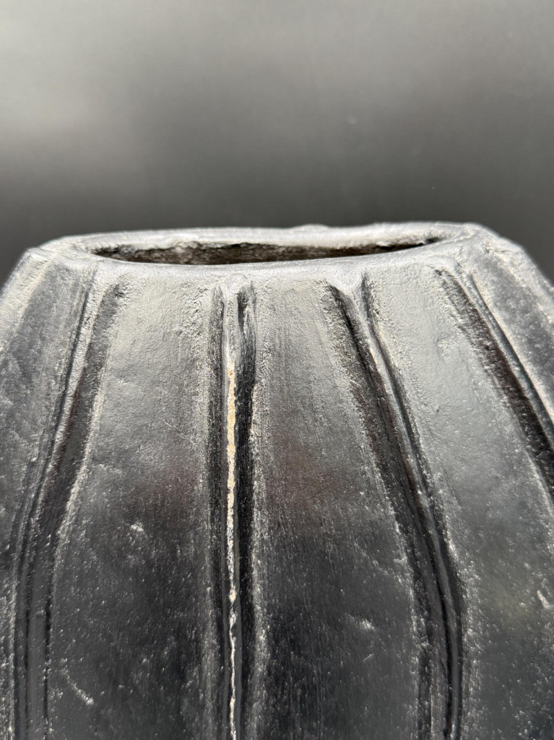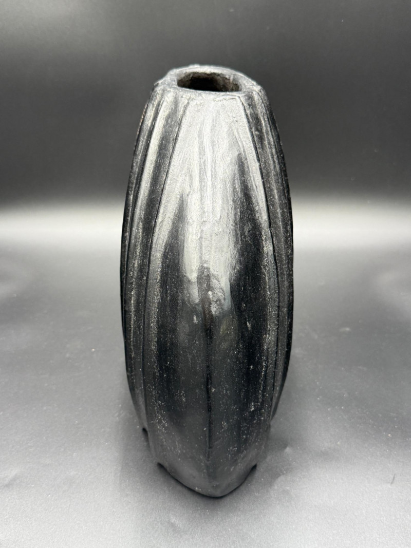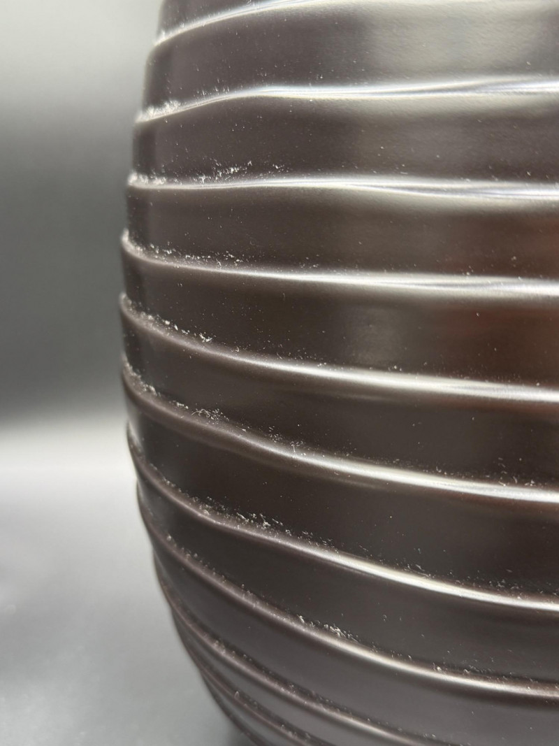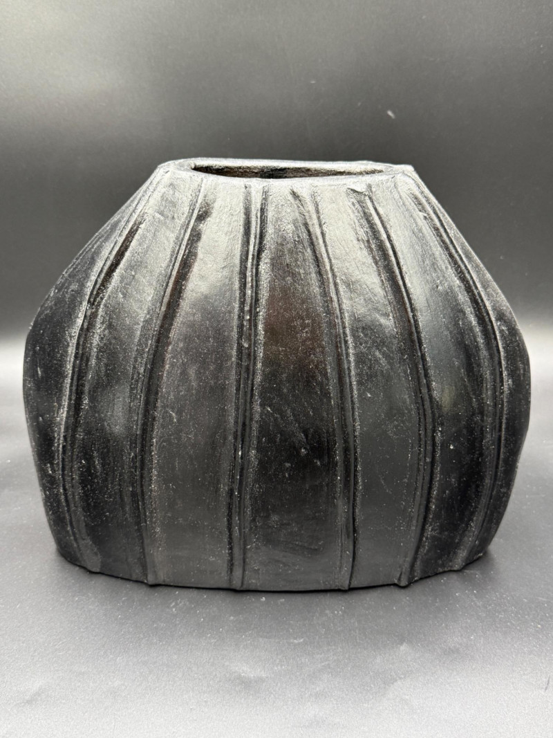 Portugal and Indonesia Decorative Vase Pair Pair of sculptural vessels with dark finishes and contrasting surface designs. One piece, marked “Made in Portugal,” has a rounded form with continuous horizontal bands. The other, marked “Made in Indonesia” and labeled “FORESIDE,” features a multi-faceted profile with vertical grooves and a flattened back. Both exhibit varied surface textures and signs of wear. Dimensions: