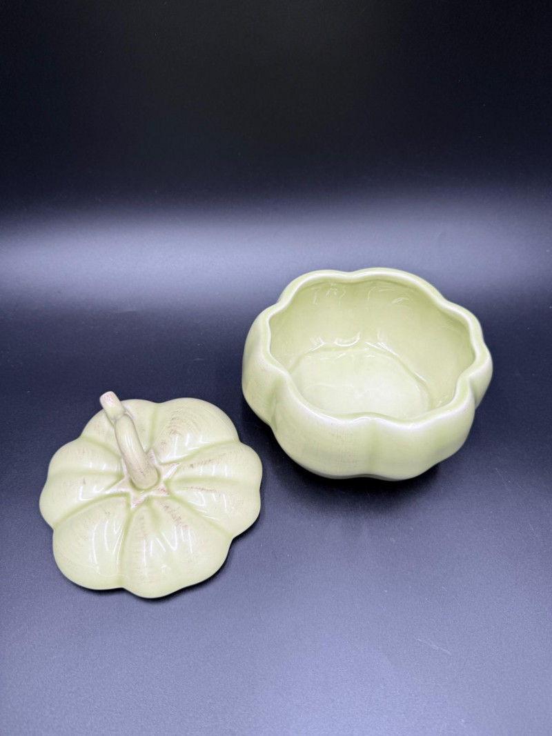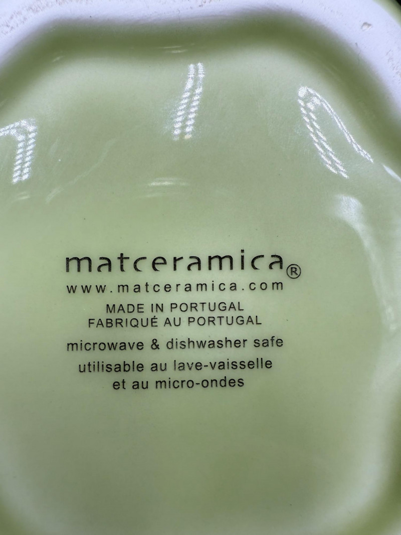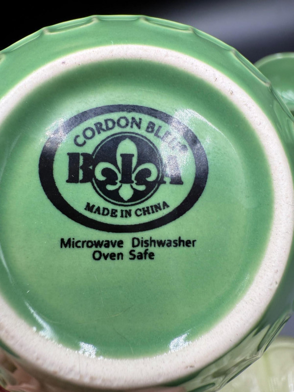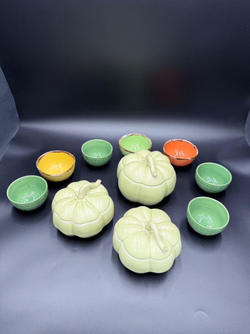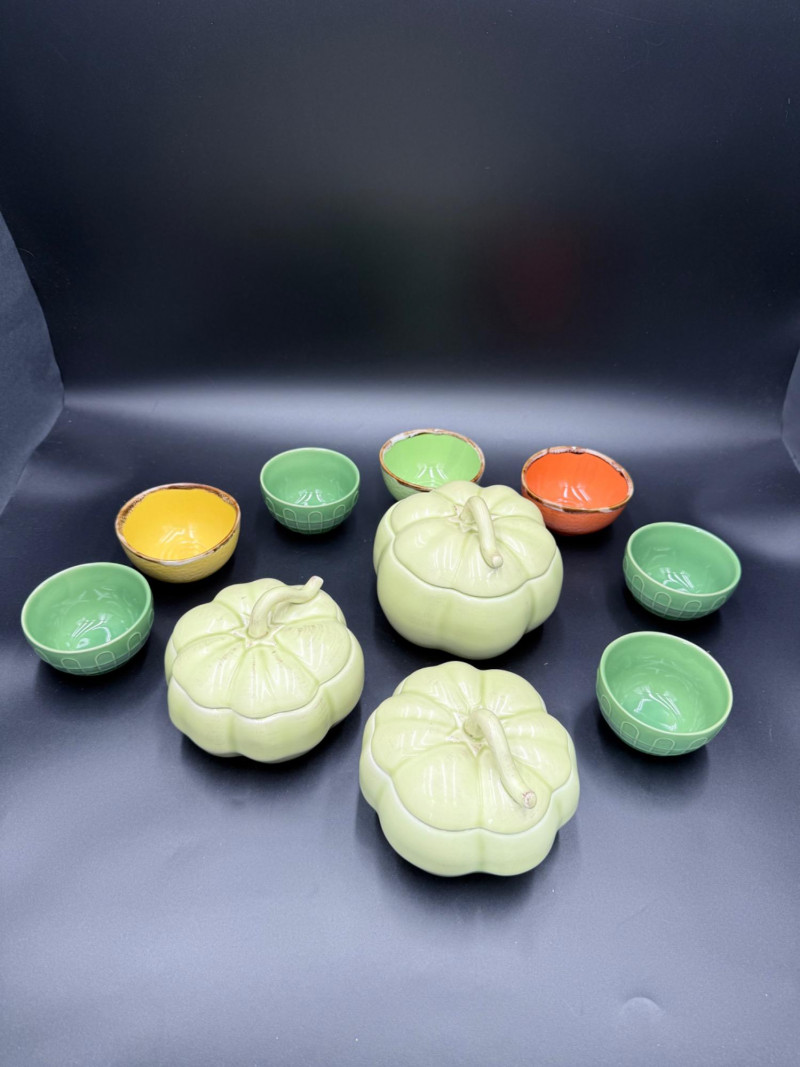 Matceramica, Cordon Bleu and Garden Terrace Ceramic Assortment Three pumpkin-shaped lidded bowls by Matceramica feature lobed bodies and stem-style handles. Four green bowls with vertical relief patterns are marked Cordon Bleu. Three smooth-glazed bowls in yellow, orange, and green are marked Garden Terrace Rice Bowl. All items are ceramic, labeled microwave and dishwasher safe, and originate from Portugal and China. Dimensions: Matceramica pumpkin bowls with lid: 6" diameter x 4.5" height Cordon Bleu green bowls: 3.5" diameter Garden Terrace bowls: 4" diameter Material: Glazed ceramic