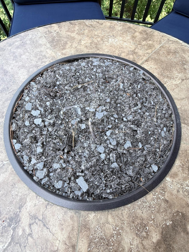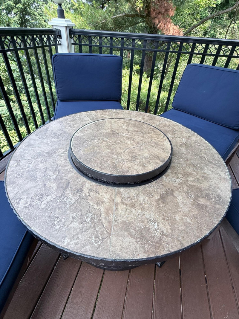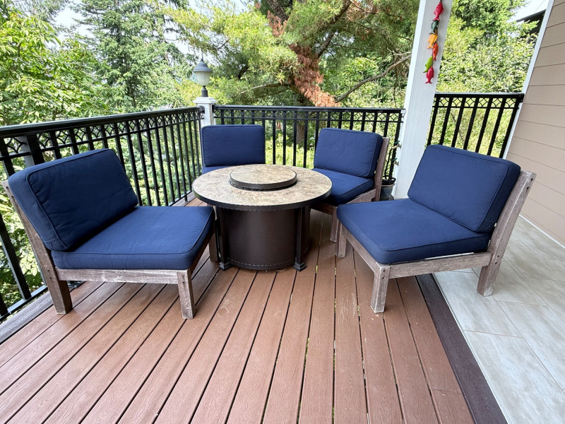 Outdoor Patio Seating and Fire Pit Set Five-piece outdoor set including four wood-frame chairs and a round propane fire pit table. The chairs feature slatted backs and bases with removable deep-seat cushions in a blue textile cover, finished with zippered closures. The fire table has a circular ceramic top with central basin lined with clear fire glass, operated by a propane tank stored beneath. Structural components show surface wear and aging across metal and wood elements. Dimensions (approx.):