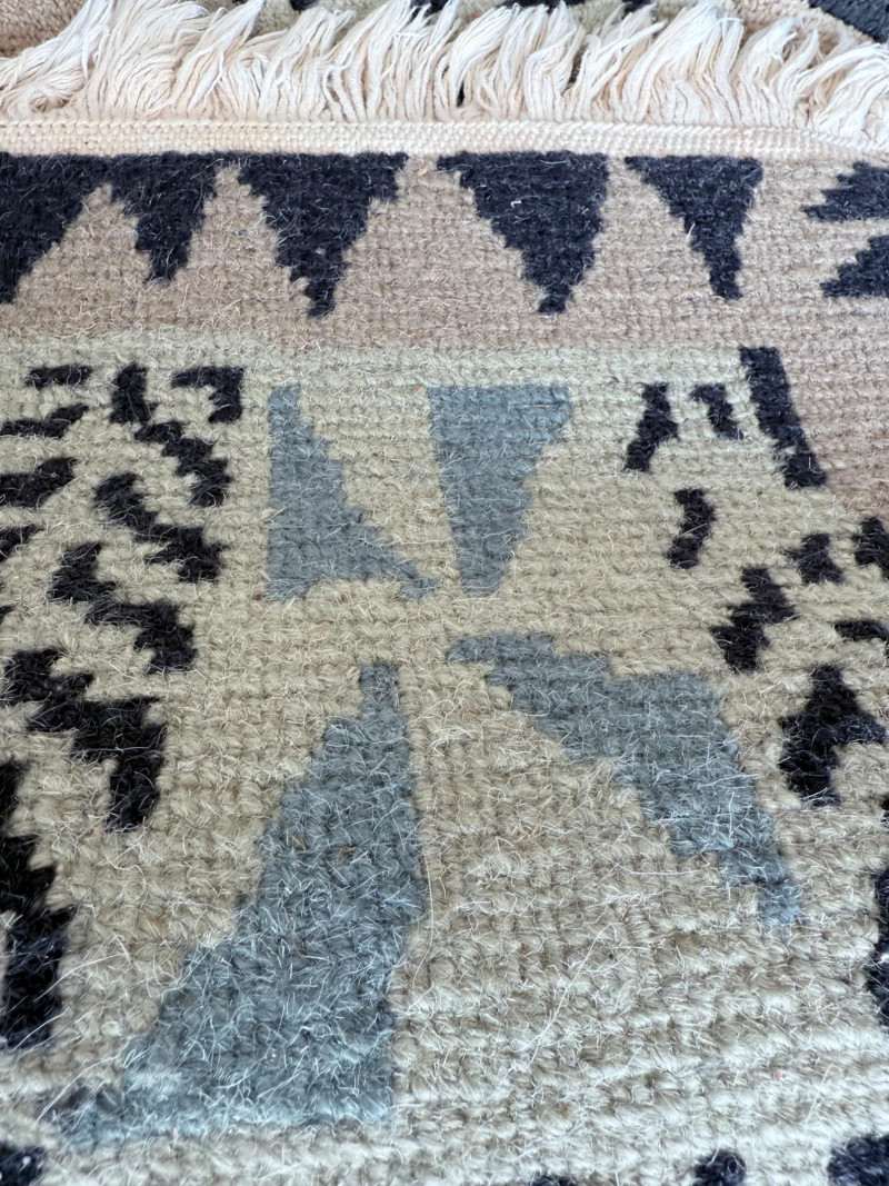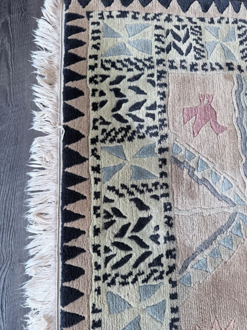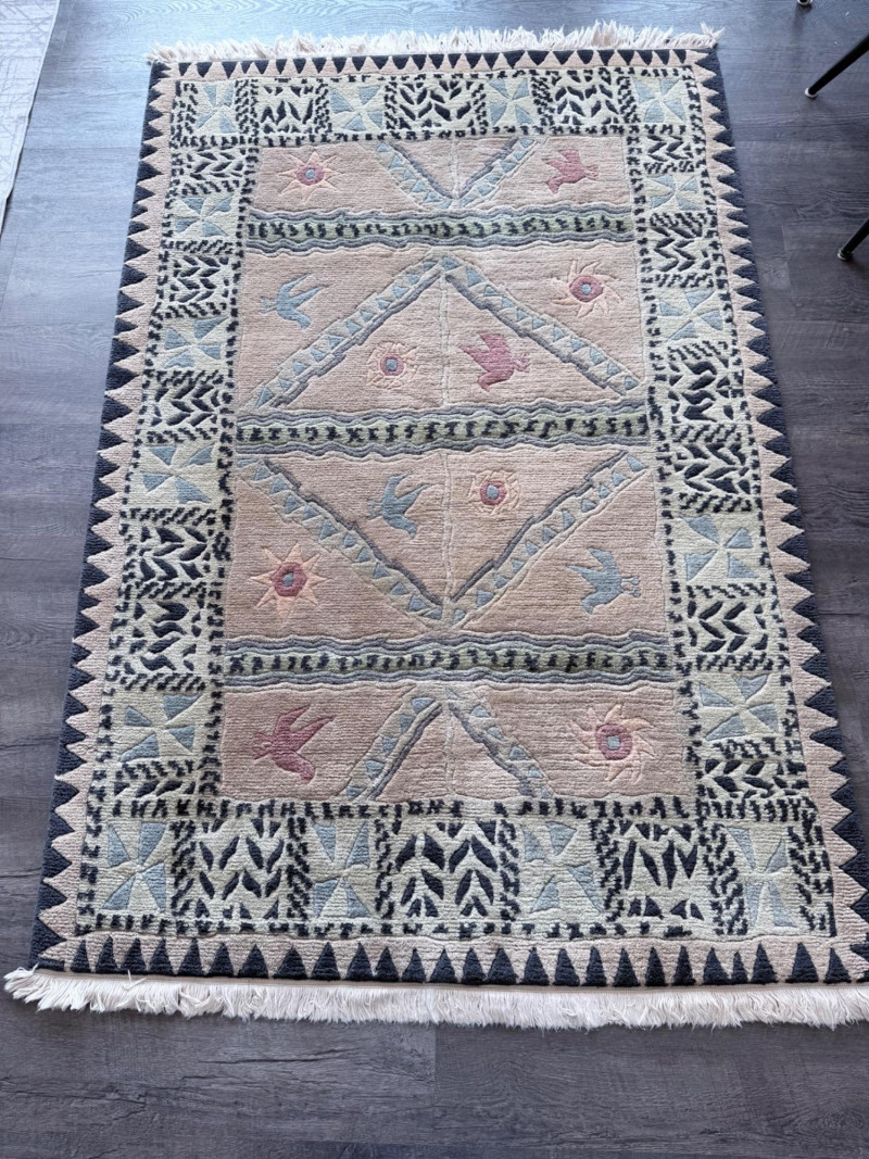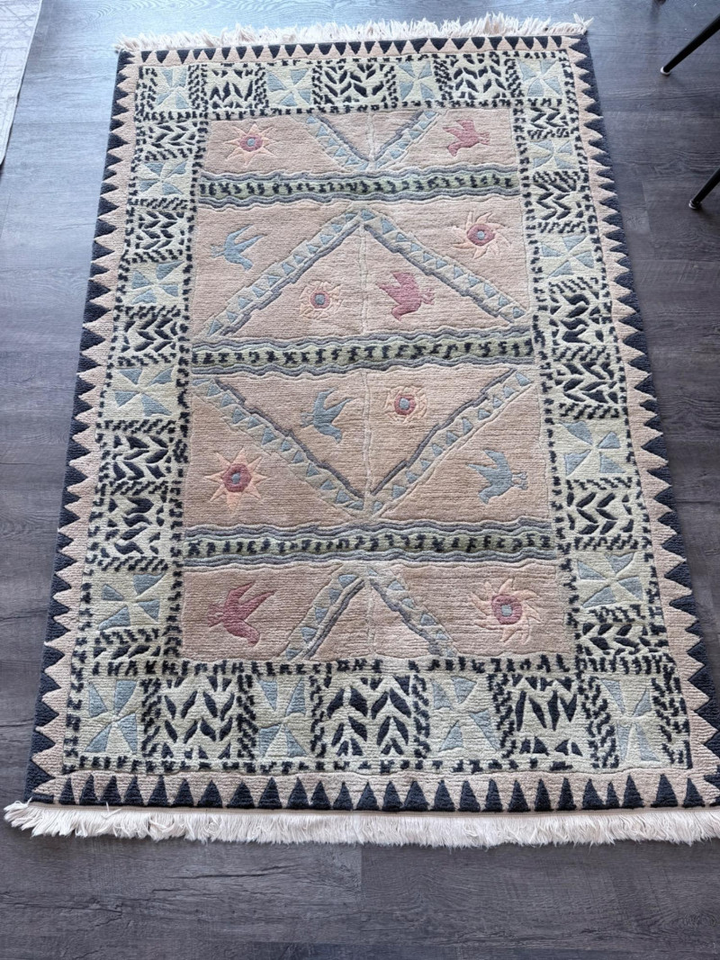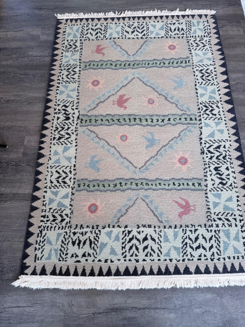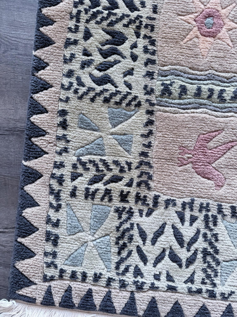 Handwoven Wool Rug with Geometric and Avian Motifs – 70" Long Rectangular rug featuring a central field divided by diagonal bands, each section containing stylized birds in flight and rosette-like forms. The perimeter is framed by alternating geometric blocks with angular pinwheel designs and abstract black patterns. Additional bands with small mark-like motifs border the central field. Fringes are present on both shorter ends. Possibly wool. Dimensions (approx.): 70" L x 48" W