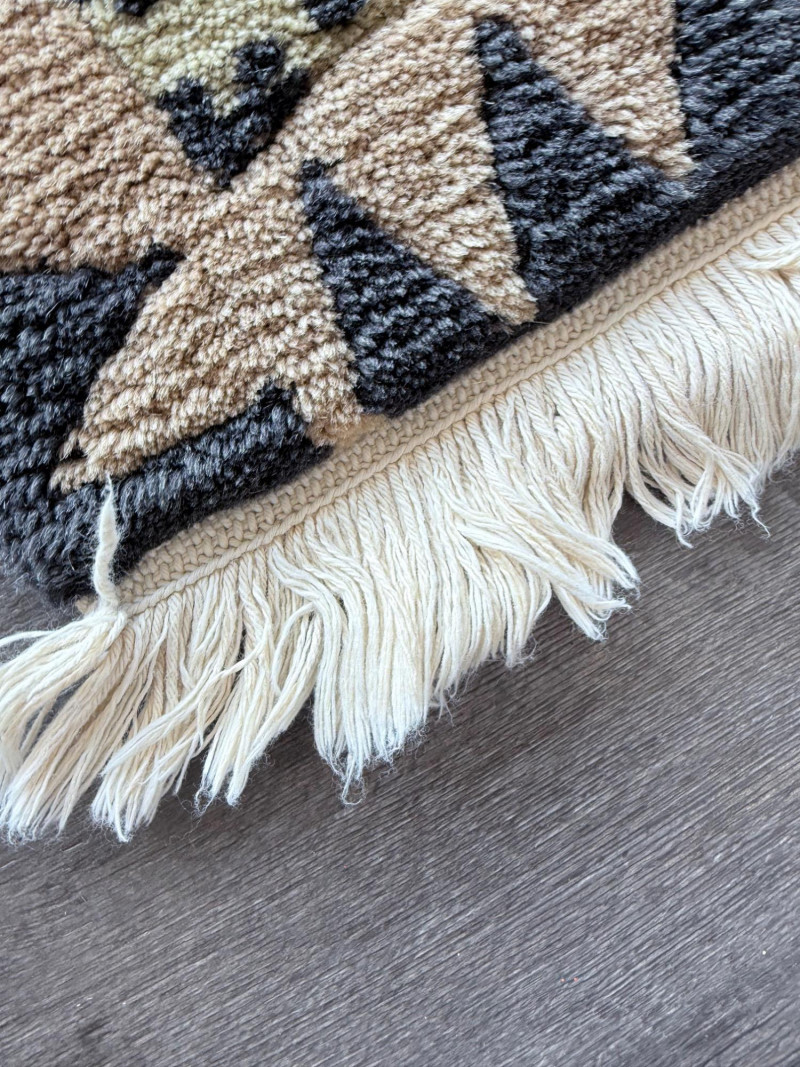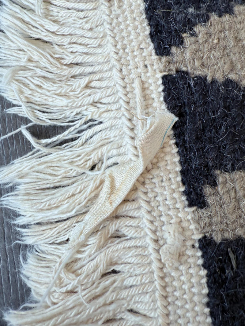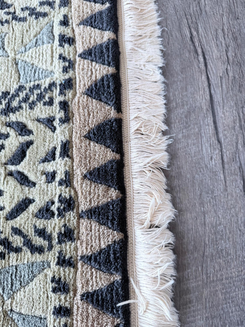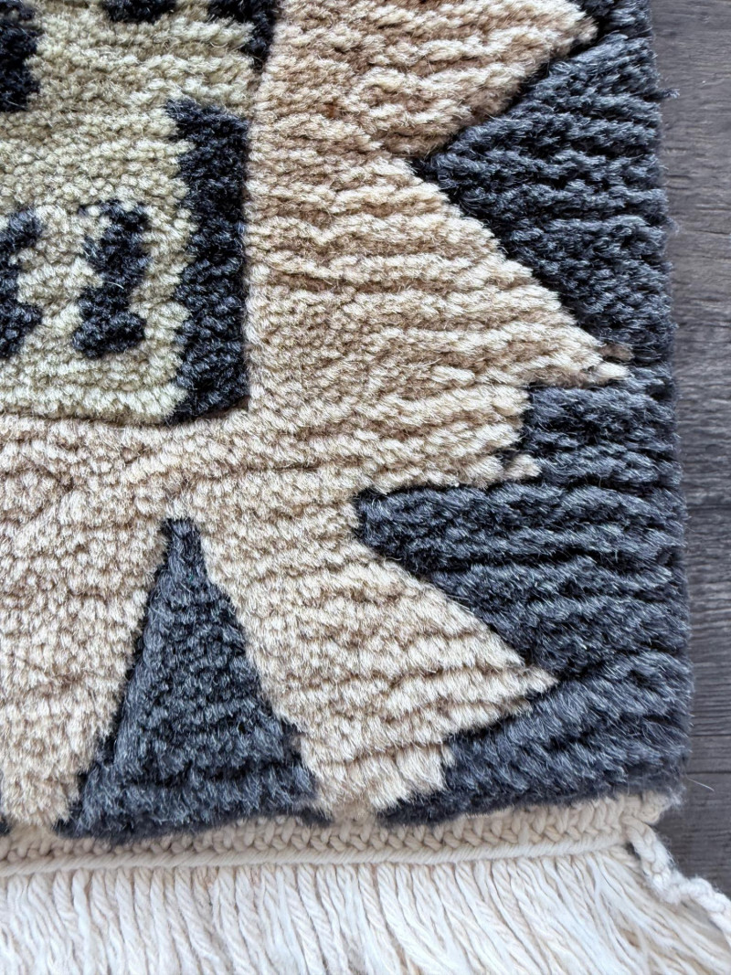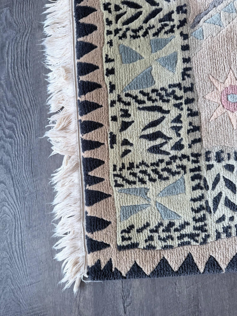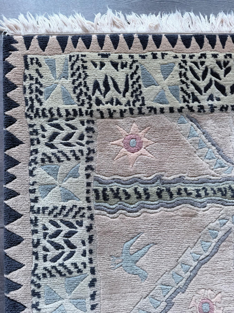 Handwoven Wool Rug with Geometric and Avian Motifs – 70" Long Rectangular rug featuring a central field divided by diagonal bands, each section containing stylized birds in flight and rosette-like forms. The perimeter is framed by alternating geometric blocks with angular pinwheel designs and abstract black patterns. Additional bands with small mark-like motifs border the central field. Fringes are present on both shorter ends. Possibly wool. Dimensions (approx.): 70" L x 48" W