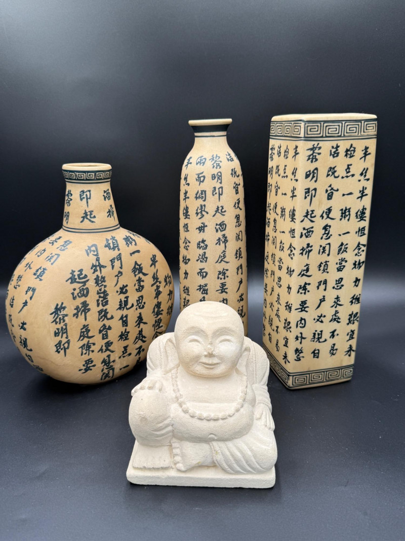 Chinese Calligraphy Ceramic Vase Trio with Seated Buddha Figurine Set of three ceramic vases in distinct forms: a tall cylindrical vessel with flared rim, a square-bodied vase with flat lip, and a flattened round vessel with short neck. Each surface is covered in Chinese calligraphy arranged in vertical columns, bordered with repeating geometric patterns near the rim. Also included is a seated Buddha figure holding prayer beads and a round object, modeled in unglazed ceramic with simplified robe detailing and a flat base. Dimensions: Buddha: 5" H x 5" W x 5" D Vases: 10.5" to 12.5" H