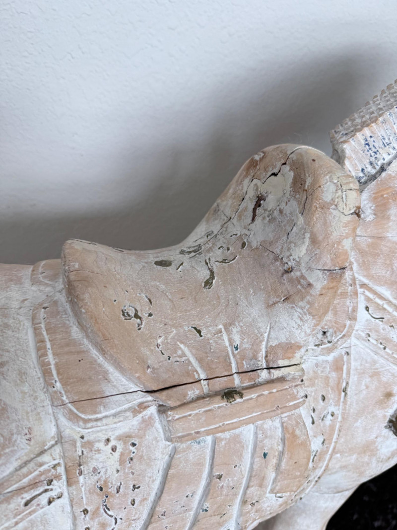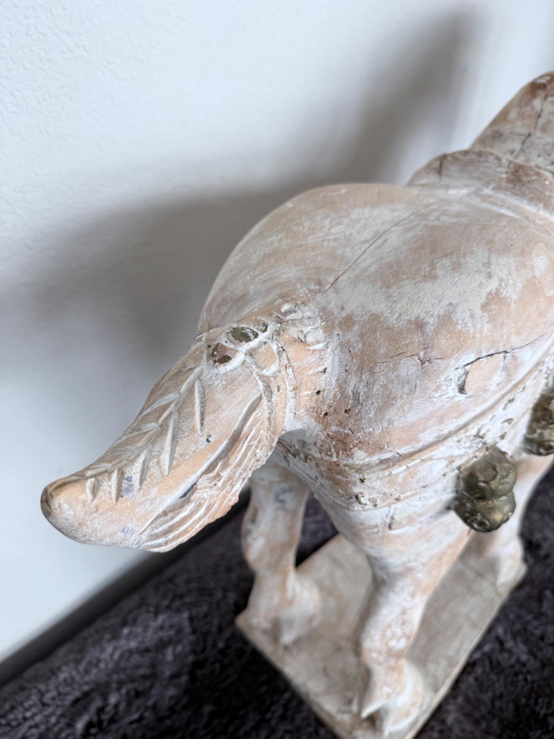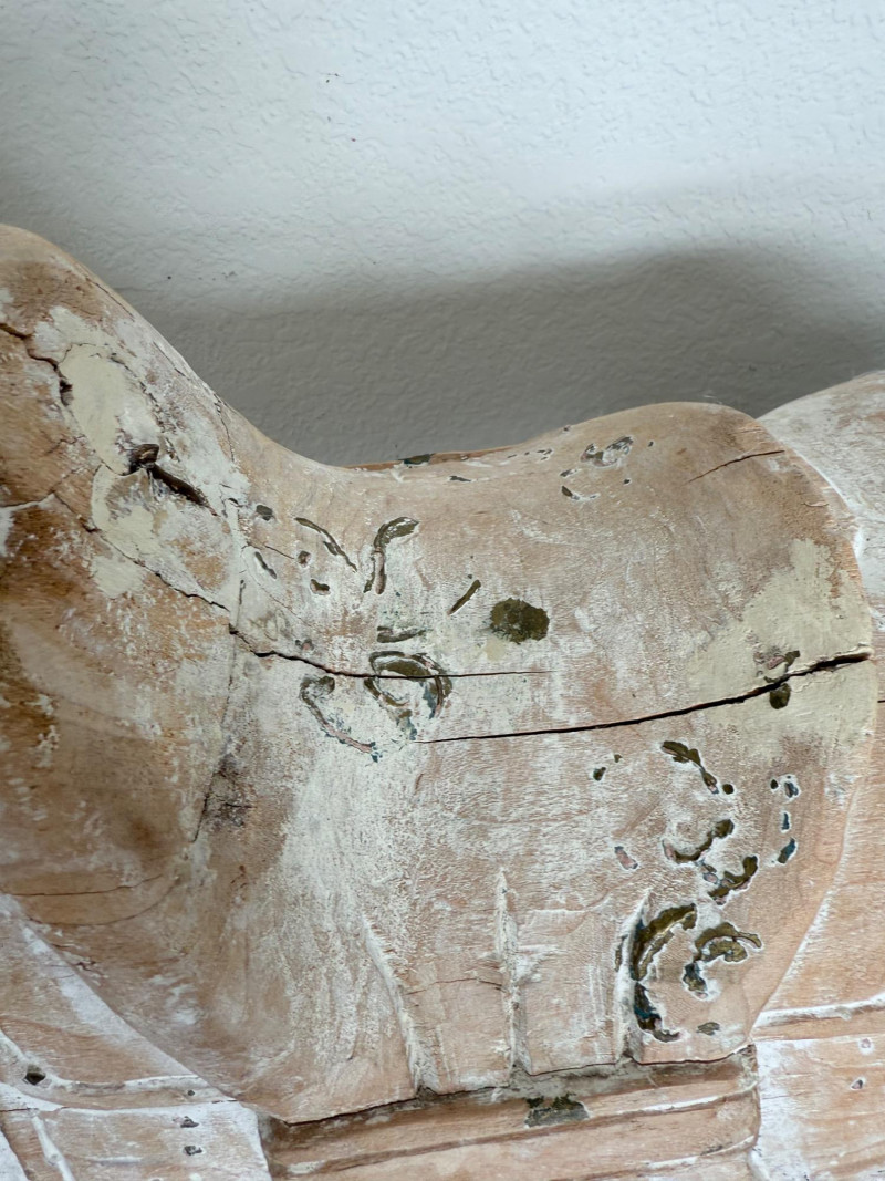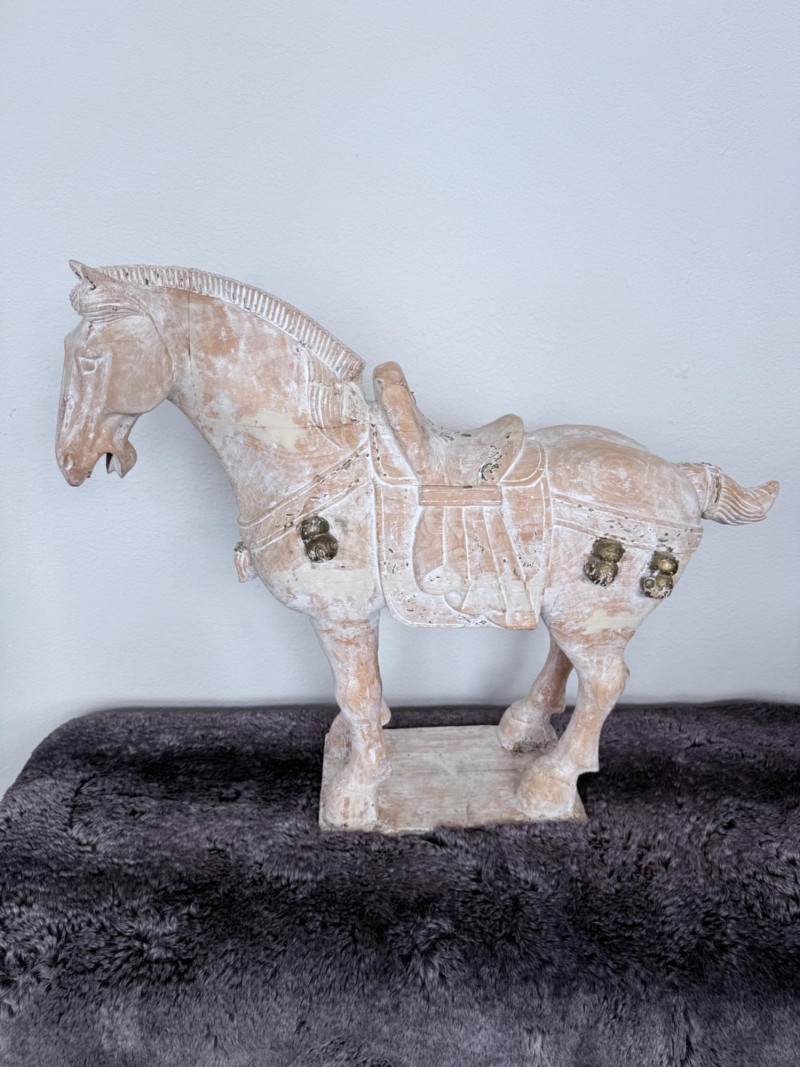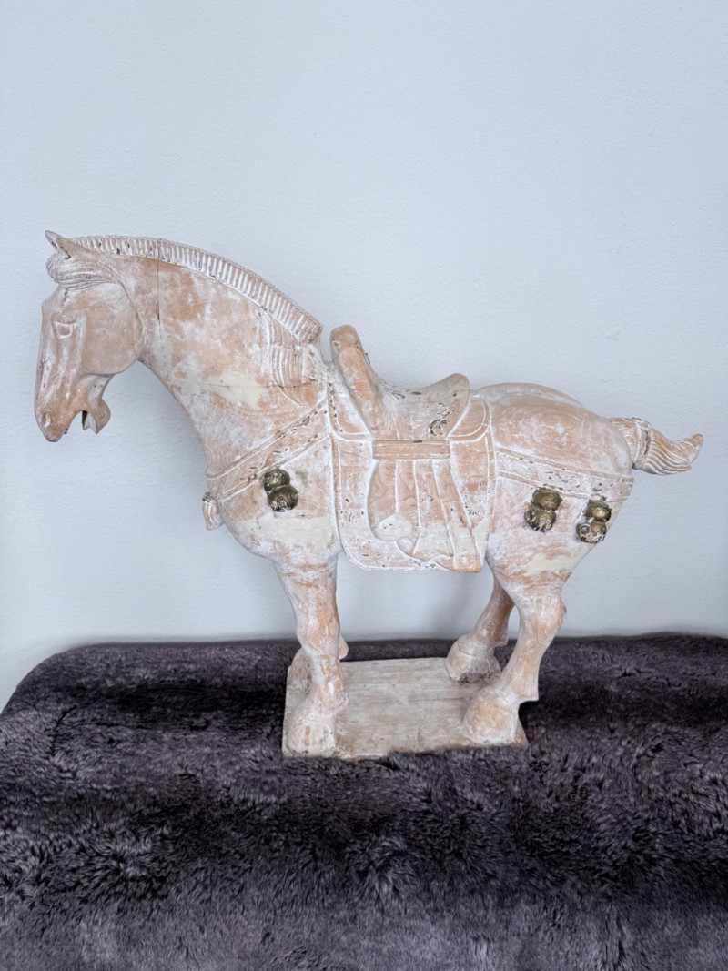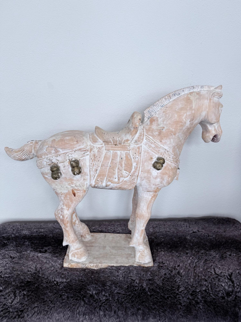 Wooden Horse Sculpture in the Style of a Tang Dynasty Horse – 28" Tall Carved wooden sculpture of a horse with raised head, upright mane, and a full saddle fitted with detailed tack. The surface shows remnants of white pigment over exposed wood grain. Brass ornaments are mounted along the saddle on both flanks. The horse stands with one foreleg slightly lifted on an integrated rectangular base, referencing the posture and decorative elements typical of Tang dynasty representations. Dimensions: 28" H x 33" L x 9" W