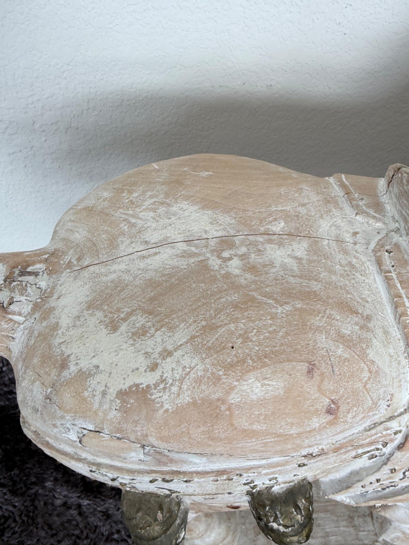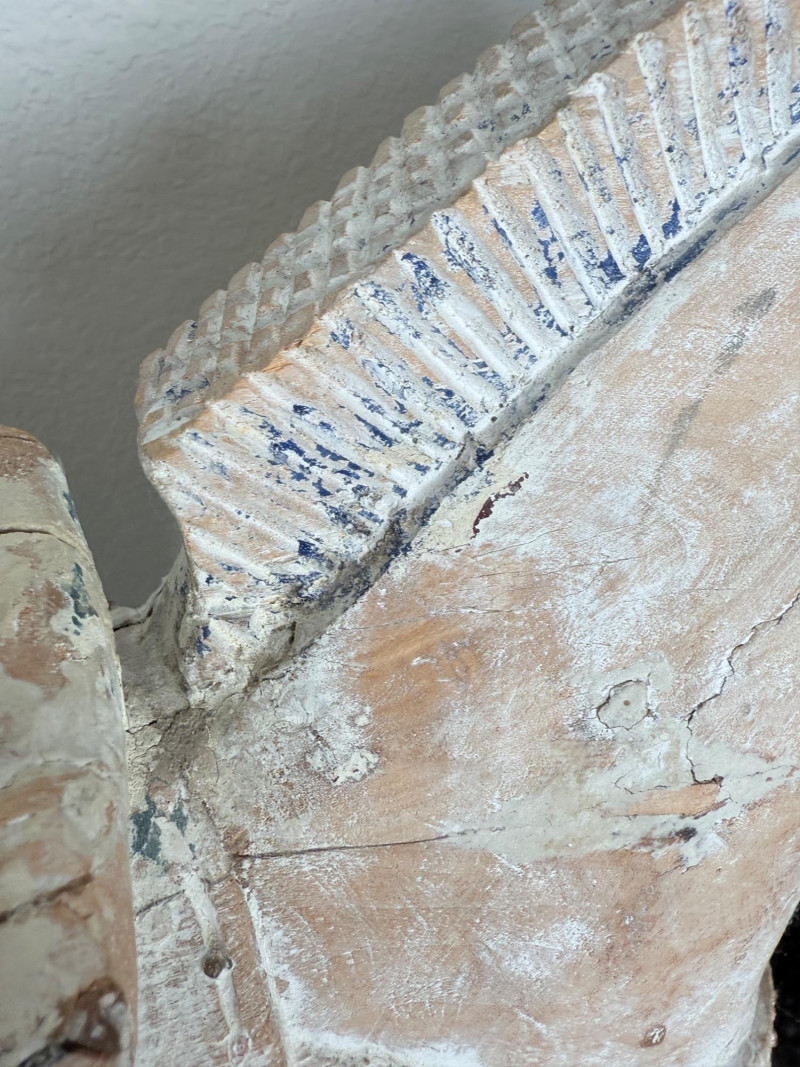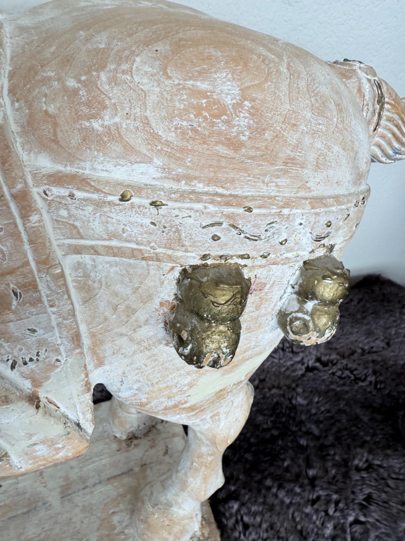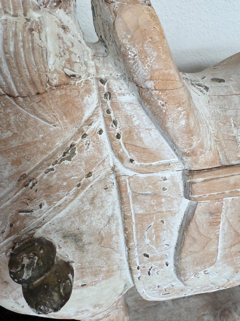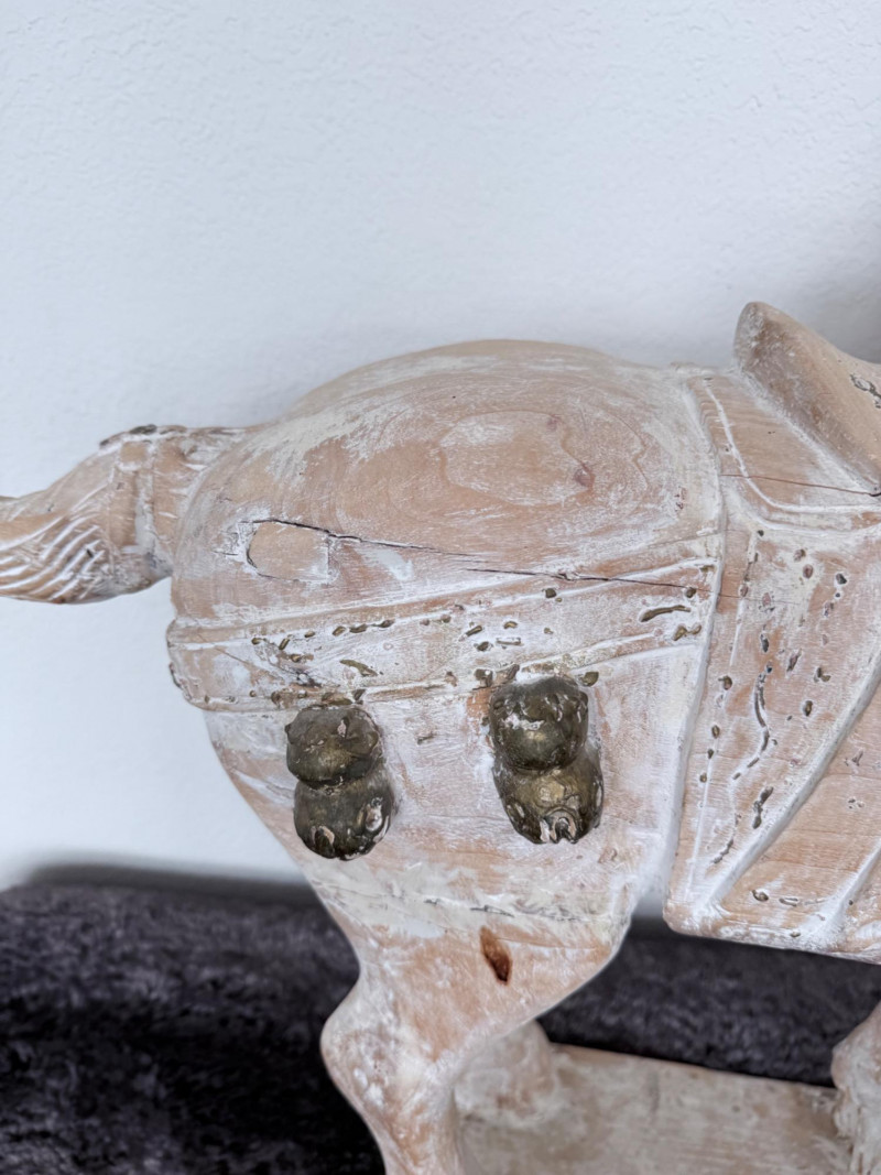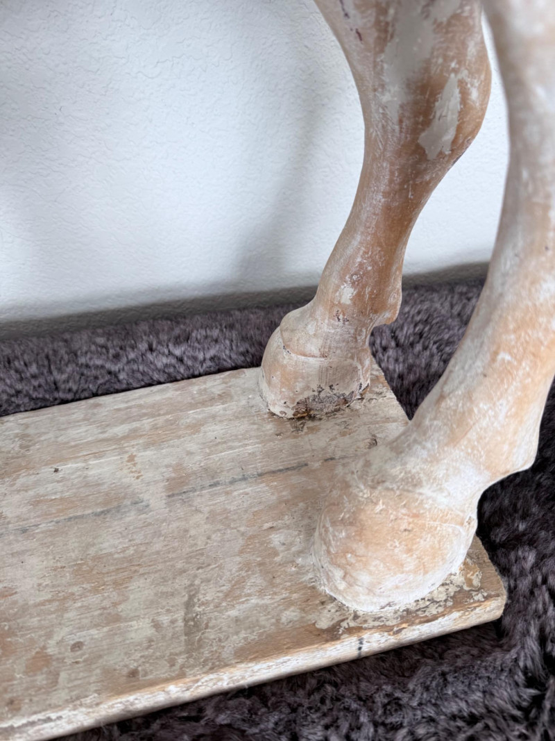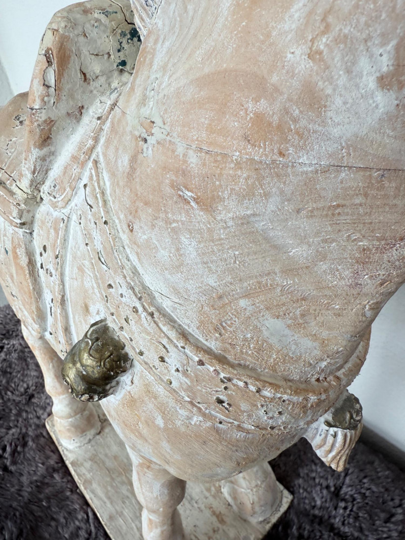 Wooden Horse Sculpture in the Style of a Tang Dynasty Horse – 28" Tall Carved wooden sculpture of a horse with raised head, upright mane, and a full saddle fitted with detailed tack. The surface shows remnants of white pigment over exposed wood grain. Brass ornaments are mounted along the saddle on both flanks. The horse stands with one foreleg slightly lifted on an integrated rectangular base, referencing the posture and decorative elements typical of Tang dynasty representations. Dimensions: 28" H x 33" L x 9" W