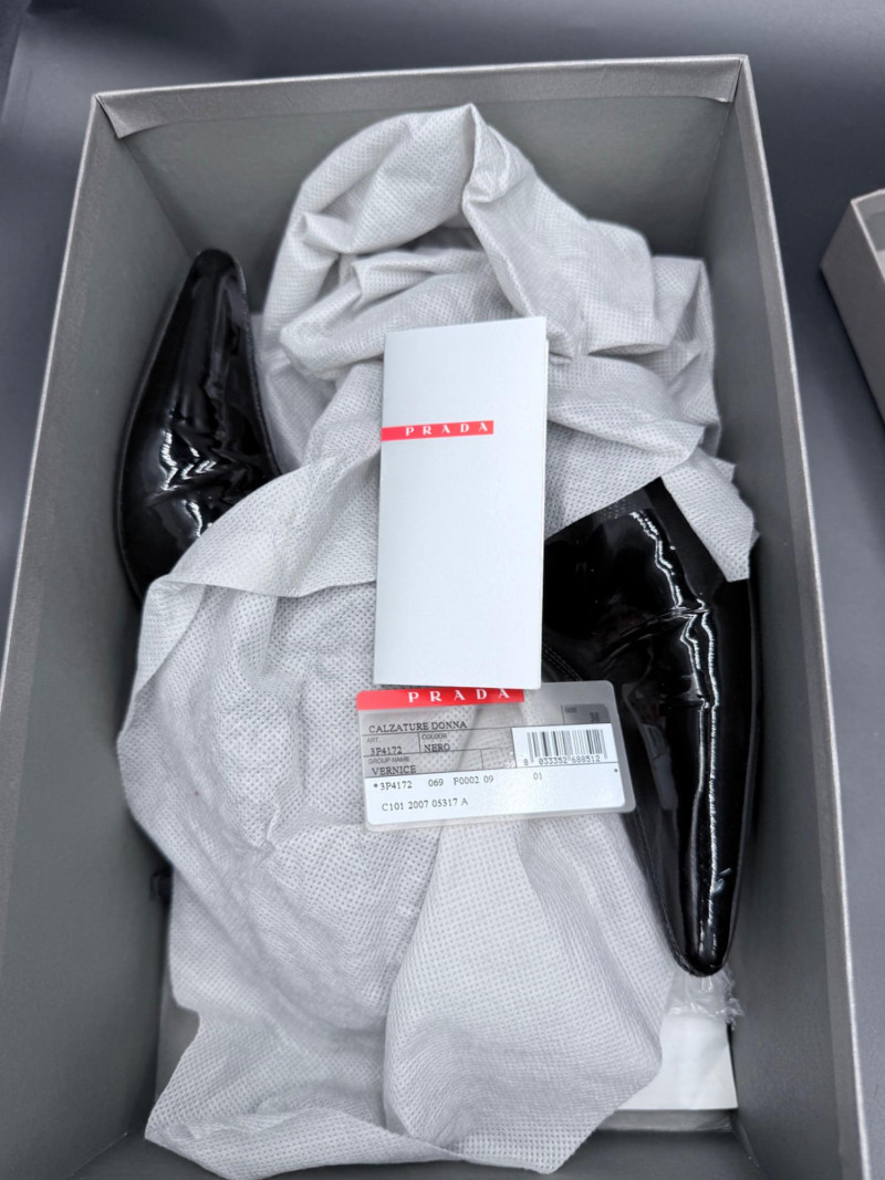 Prada Vernice Nero Kitten Heel Zip Booties – Size 38 Pair of women's pointed-toe zip booties in black patent leather, identified under article number 3P4172 from the Vernice group. Features include front center zippers with branded pull tabs, low kitten heels, and textured rubber outsoles marked “PRADA Made in Italy.” The interior is lined with leather and bears the red Prada label. Includes original box, dust covers, care booklet, and spare heel tips. Size: 38