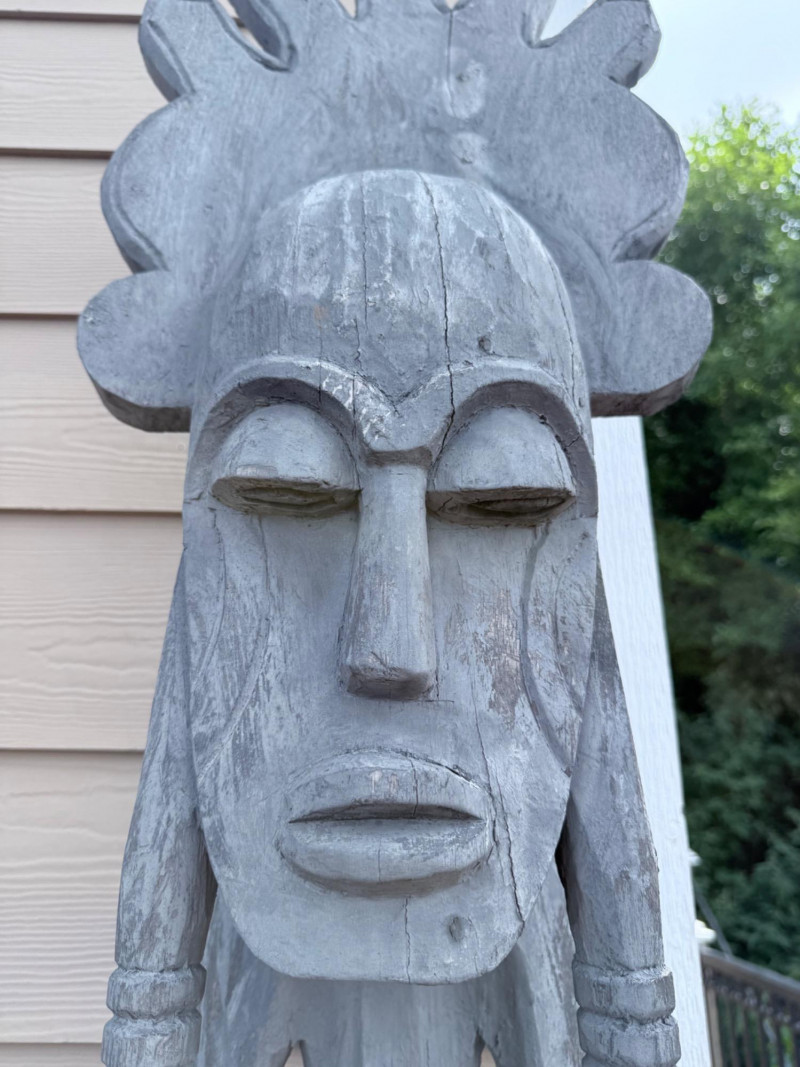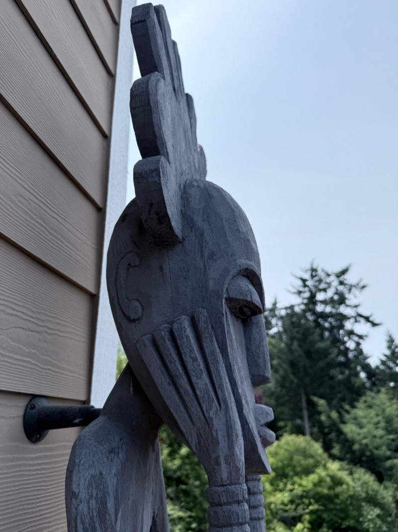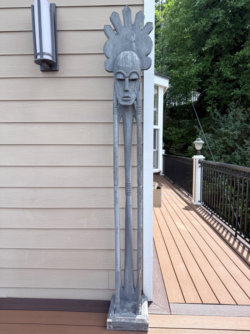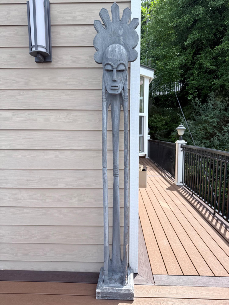 Tall African Tribal Style Carved Wood Statue – 91" H Carved wood statue in African tribal style, depicting an elongated figure with vertical limbs, stylized facial features, and a crest-like headdress. The figure is mounted to an exterior wall using two metal brackets attached at the back and shoulder. It stands on a square wood base. Dimensions: