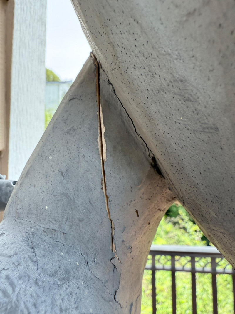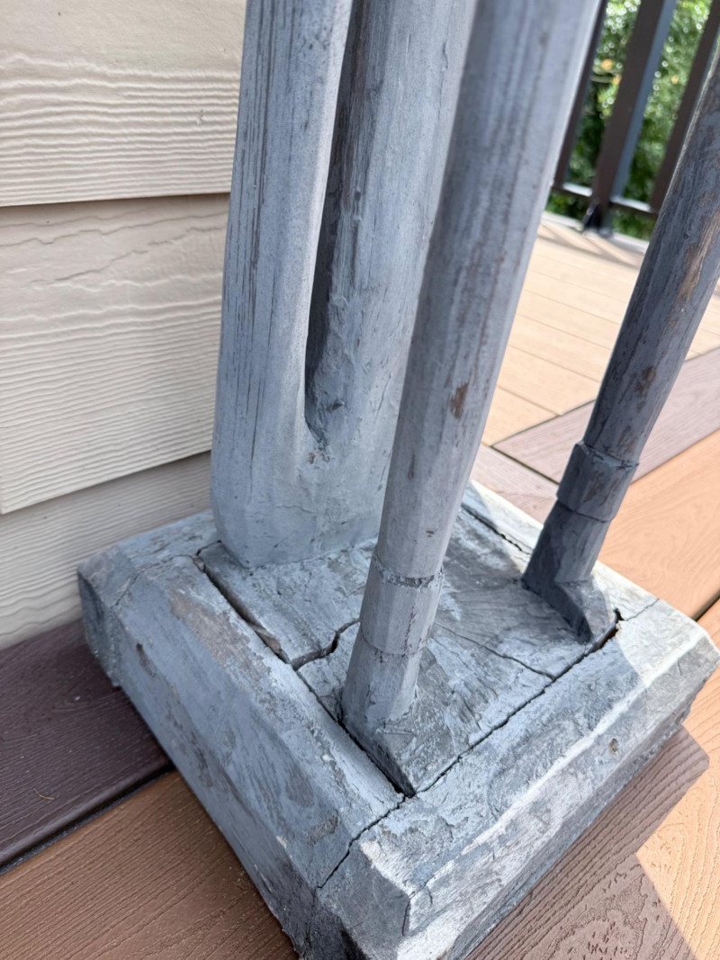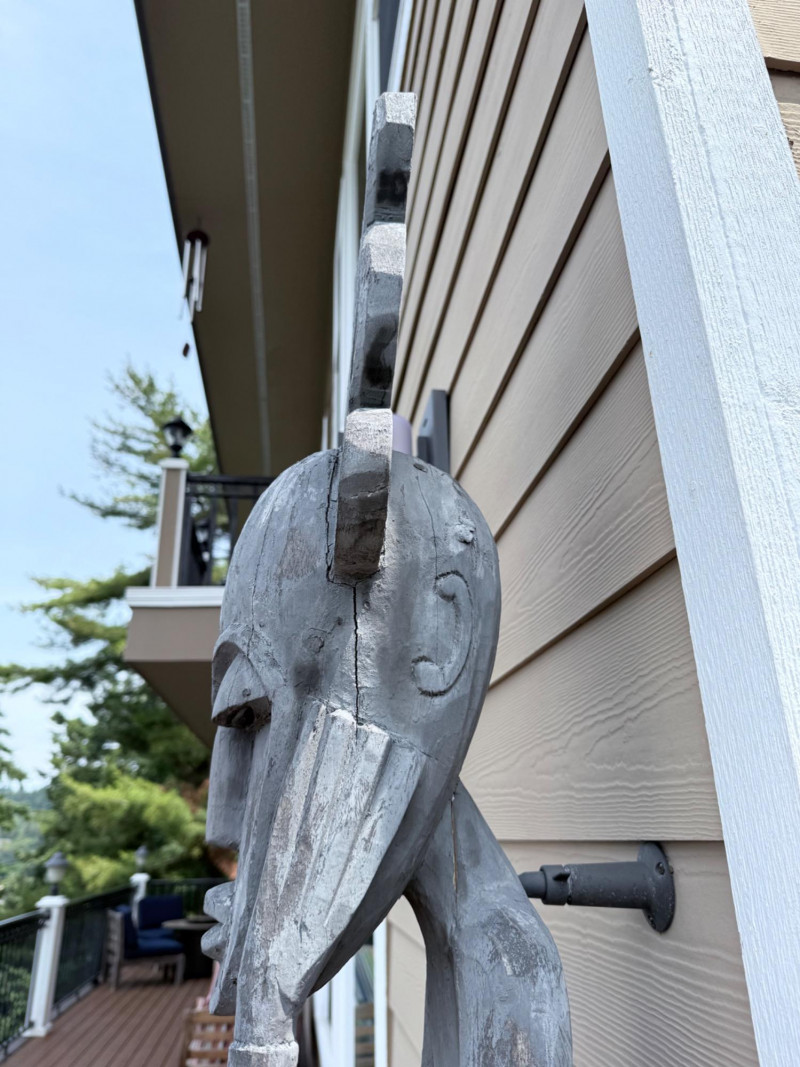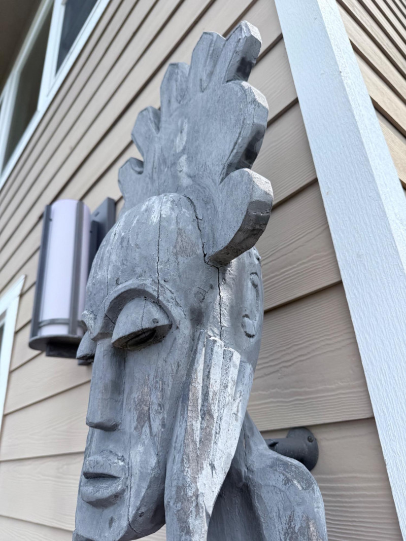 Tall African Tribal Style Carved Wood Statue – 91" H Carved wood statue in African tribal style, depicting an elongated figure with vertical limbs, stylized facial features, and a crest-like headdress. The figure is mounted to an exterior wall using two metal brackets attached at the back and shoulder. It stands on a square wood base. Dimensions:
