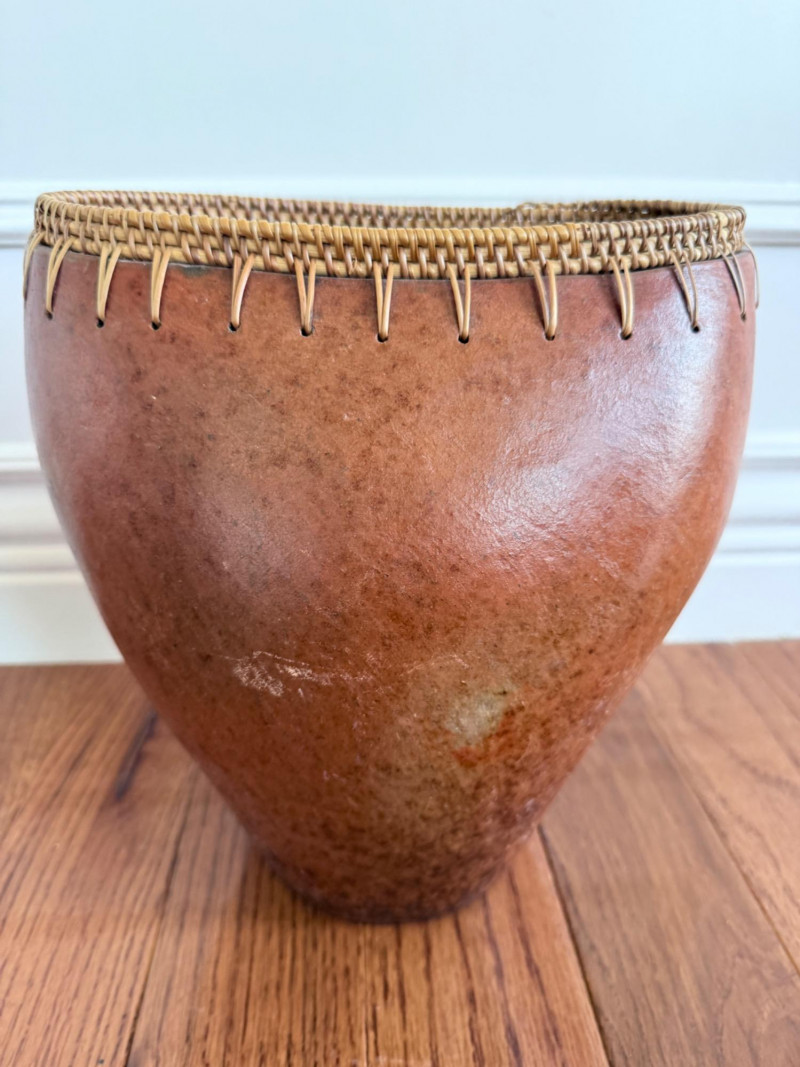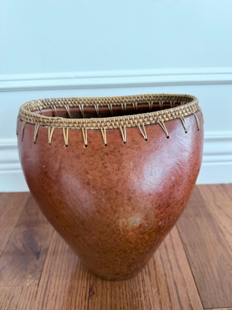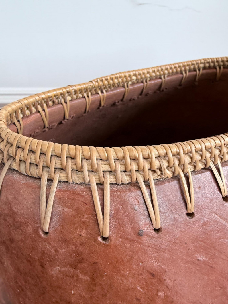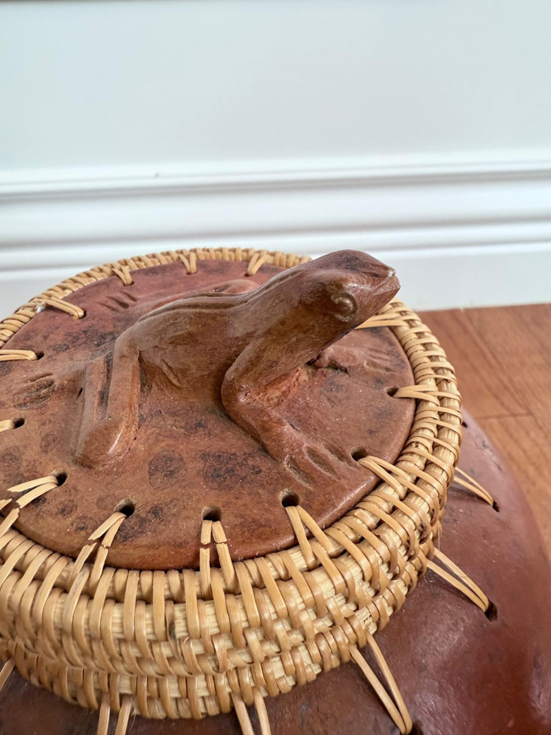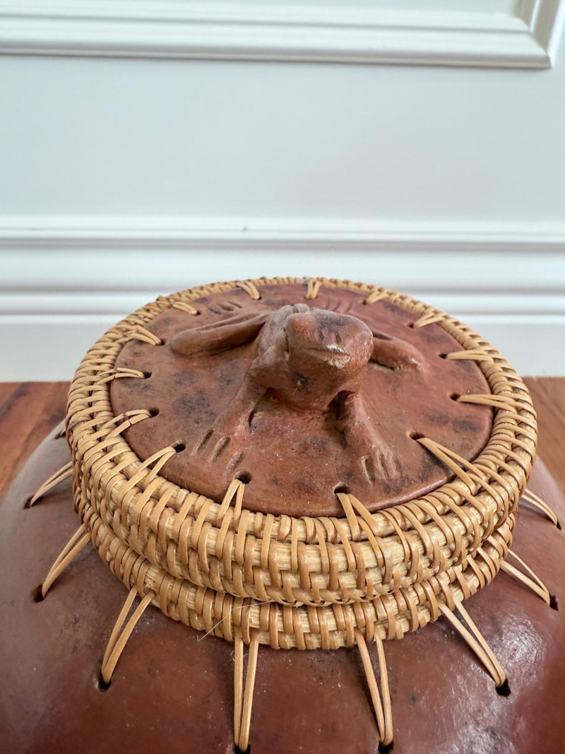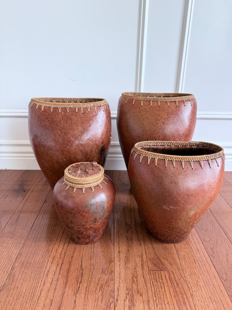 Terracotta Art Pottery Vessel Set with Woven Rims Set of four hand-formed terracotta art pottery vessels, each featuring a rounded body and a rim threaded with natural fiber lacing through pierced openings. Three vessels are open at the top; one includes a fitted lid topped with a sculpted animal figure and finished with a coiled woven edge. The surfaces show varied tones and irregularities from the firing process. The design and detailing are reminiscent of traditional Lombok pottery, though the pieces are unmarked. Estimated Dimensions: Vessel 1: 15" H x 11" W Vessel 2: 14" H x 11" W Vessel 3: 11" H x 9" W Lidded Vessel: 10" H x 6" W