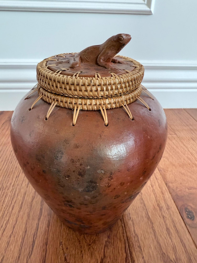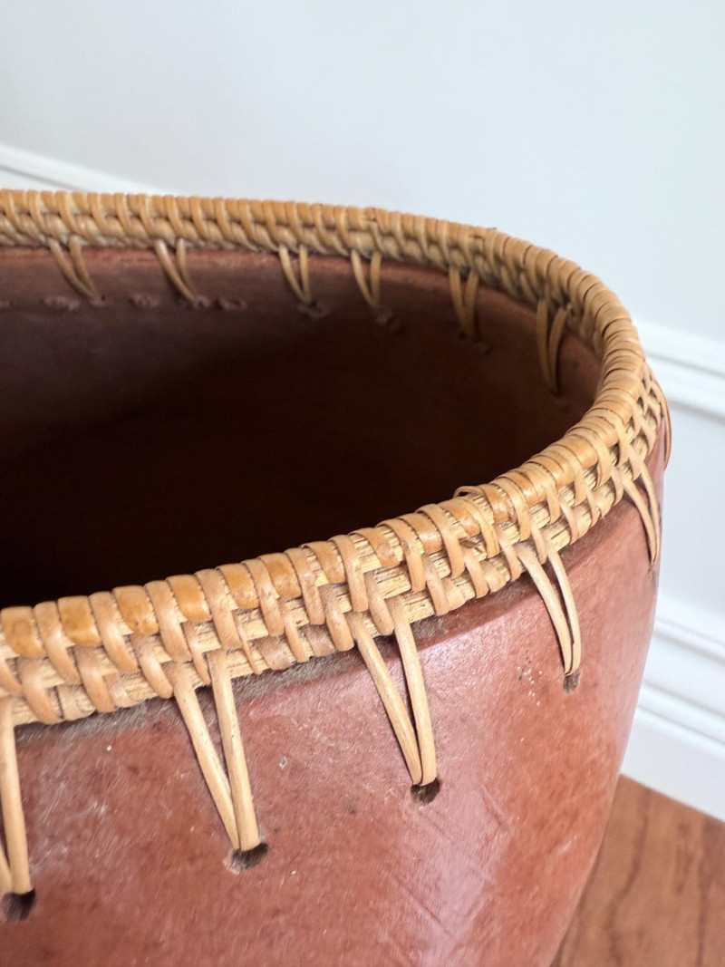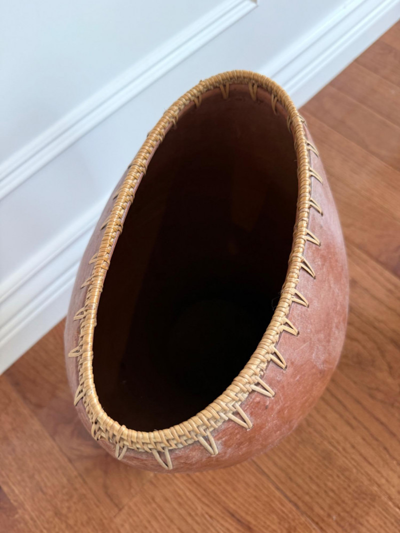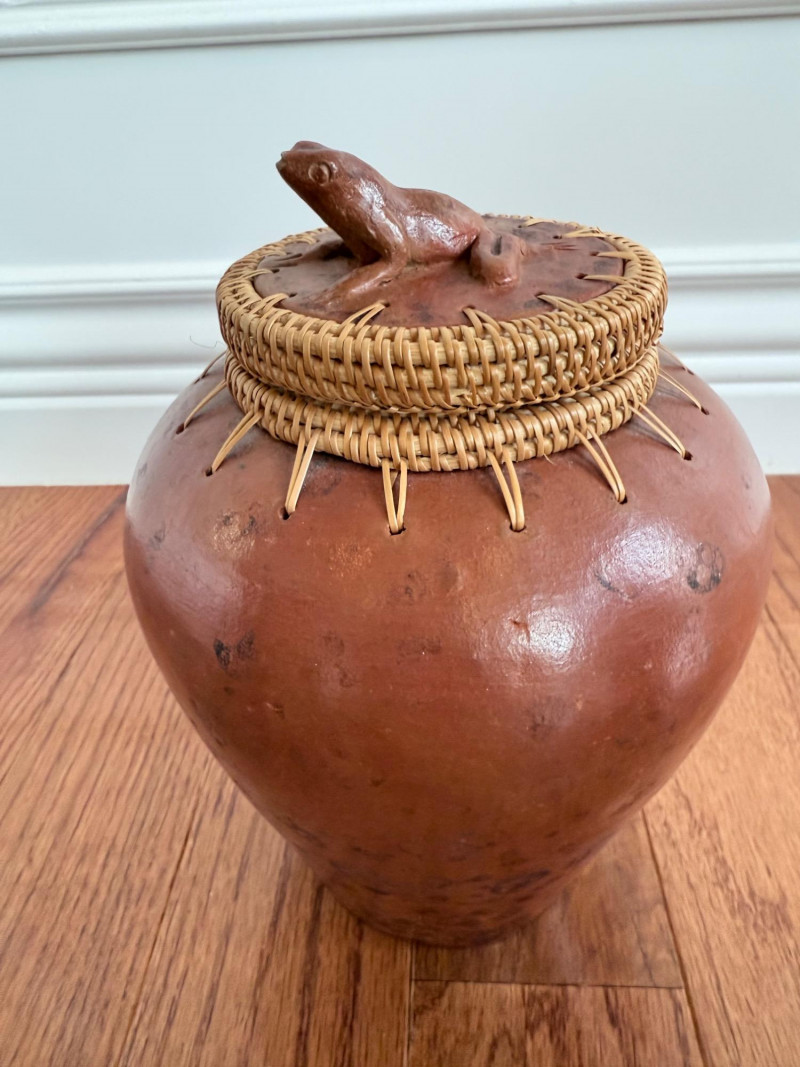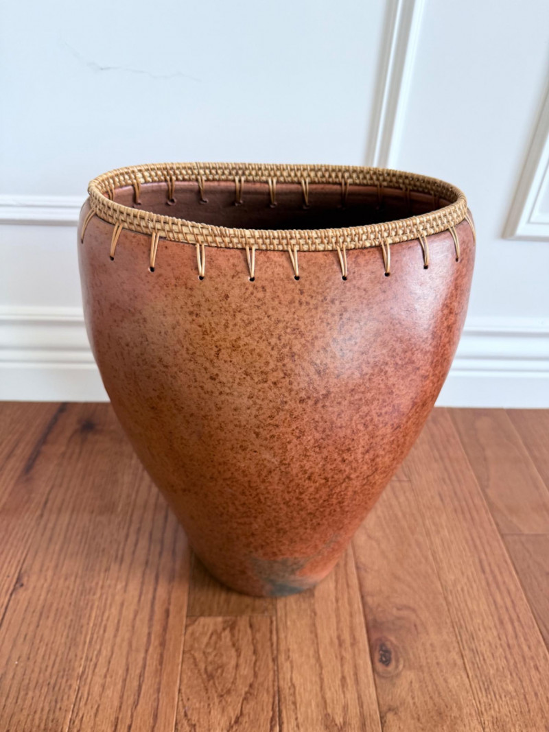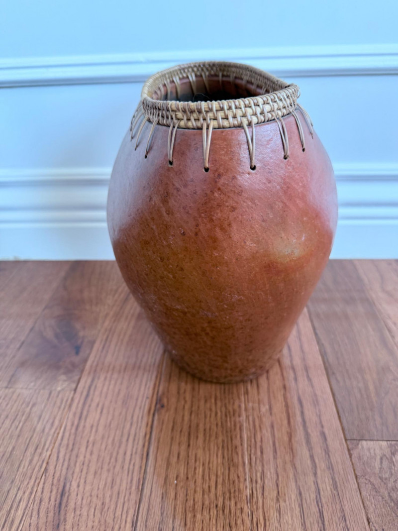 Terracotta Art Pottery Vessel Set with Woven Rims Set of four hand-formed terracotta art pottery vessels, each featuring a rounded body and a rim threaded with natural fiber lacing through pierced openings. Three vessels are open at the top; one includes a fitted lid topped with a sculpted animal figure and finished with a coiled woven edge. The surfaces show varied tones and irregularities from the firing process. The design and detailing are reminiscent of traditional Lombok pottery, though the pieces are unmarked. Estimated Dimensions: Vessel 1: 15" H x 11" W Vessel 2: 14" H x 11" W Vessel 3: 11" H x 9" W Lidded Vessel: 10" H x 6" W