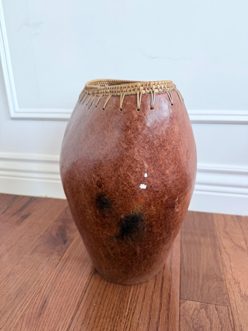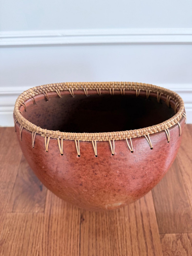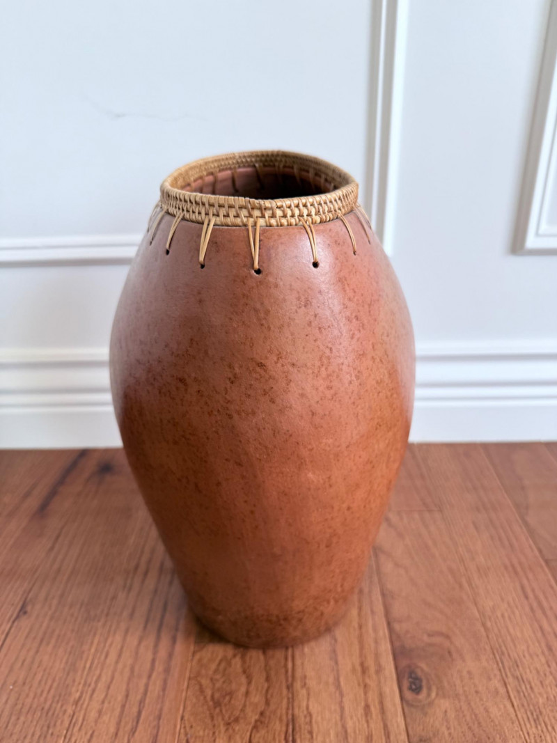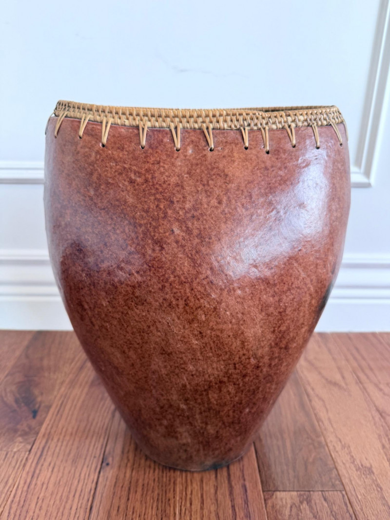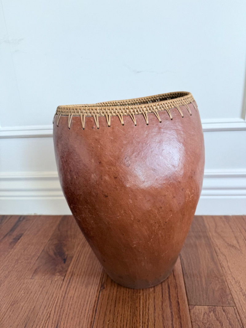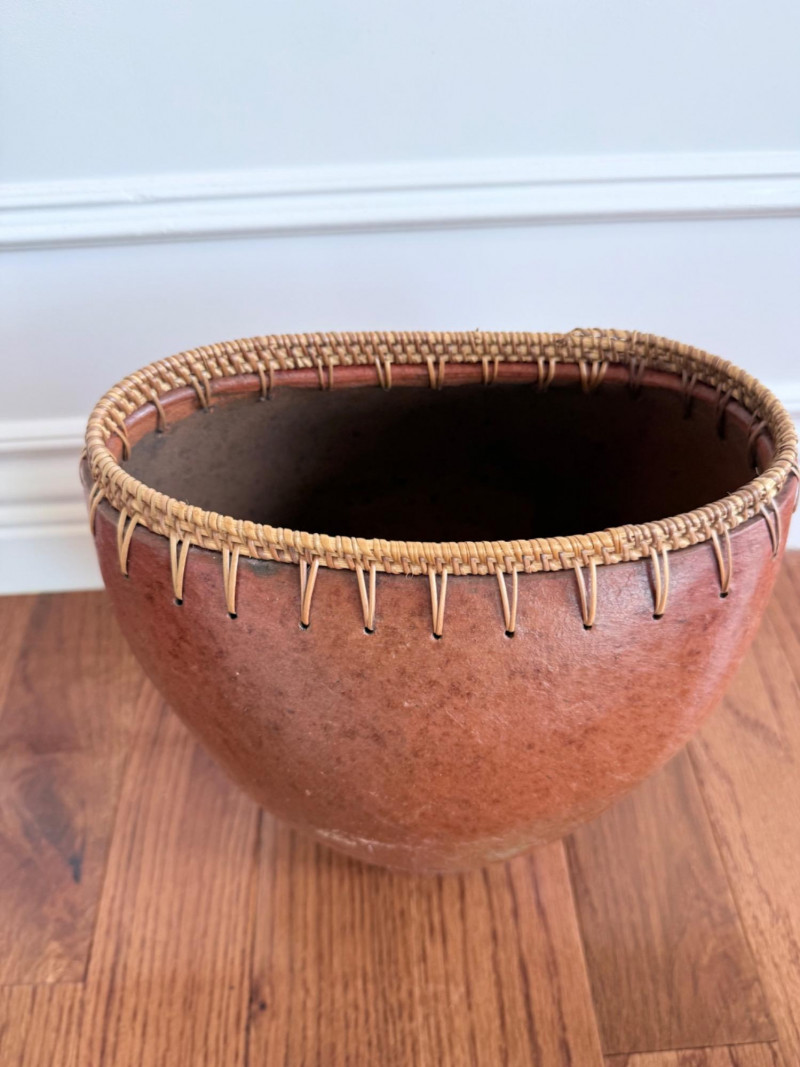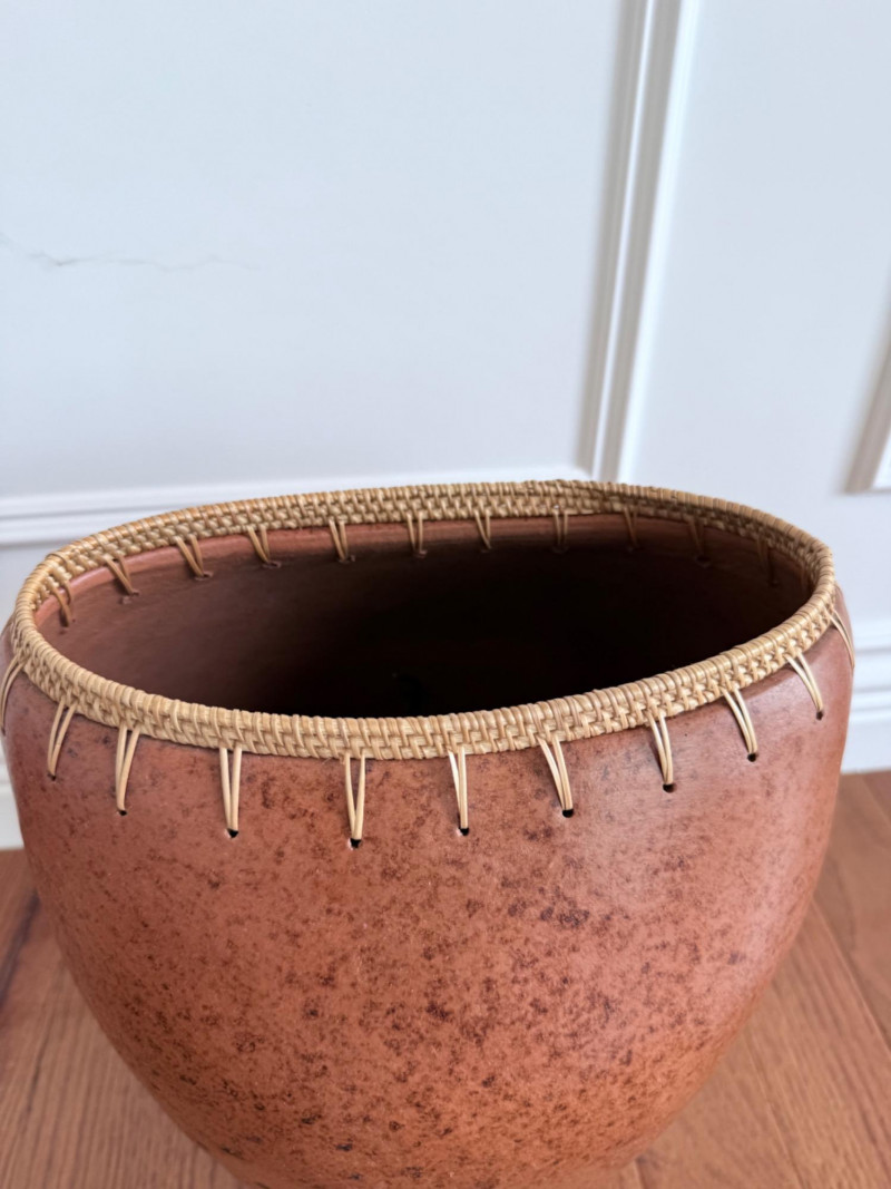 Terracotta Art Pottery Vessel Set with Woven Rims Set of four hand-formed terracotta art pottery vessels, each featuring a rounded body and a rim threaded with natural fiber lacing through pierced openings. Three vessels are open at the top; one includes a fitted lid topped with a sculpted animal figure and finished with a coiled woven edge. The surfaces show varied tones and irregularities from the firing process. The design and detailing are reminiscent of traditional Lombok pottery, though the pieces are unmarked. Estimated Dimensions: Vessel 1: 15" H x 11" W Vessel 2: 14" H x 11" W Vessel 3: 11" H x 9" W Lidded Vessel: 10" H x 6" W