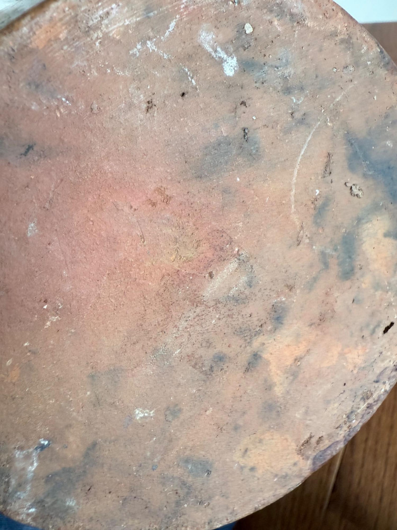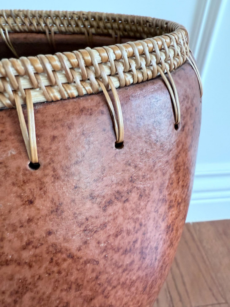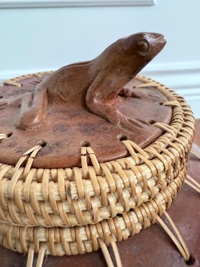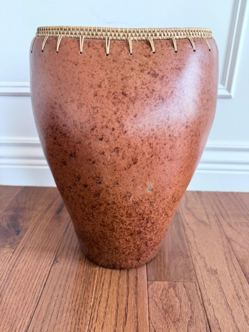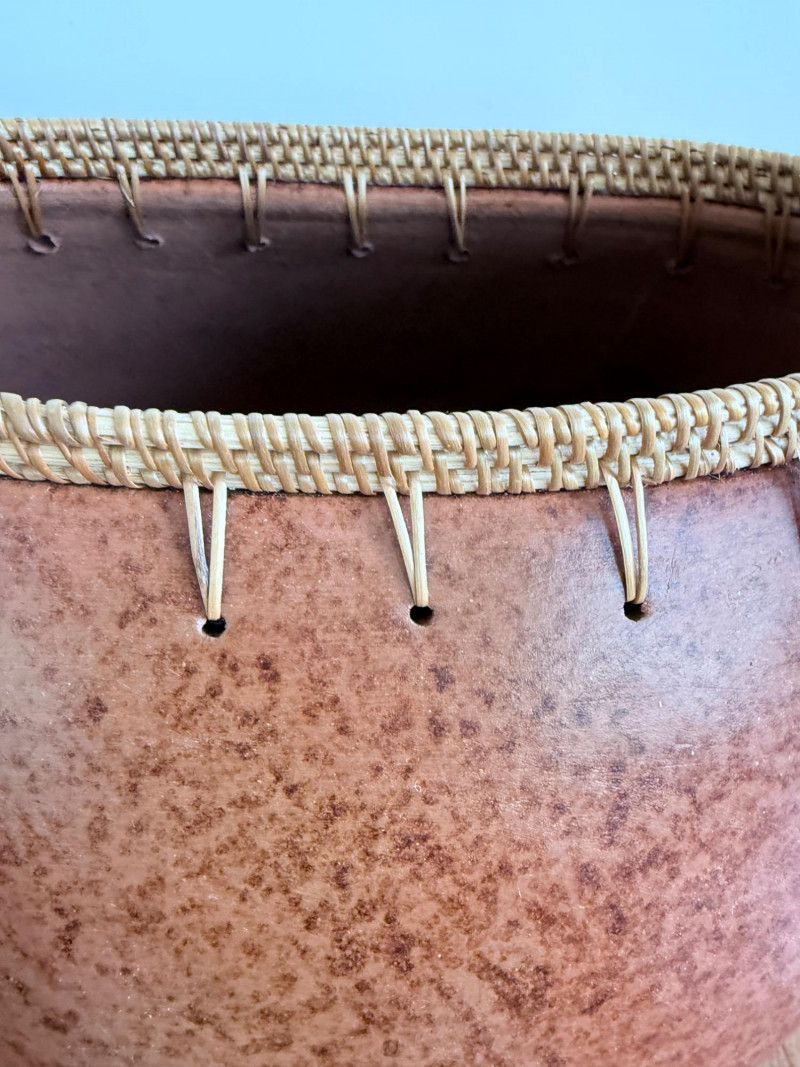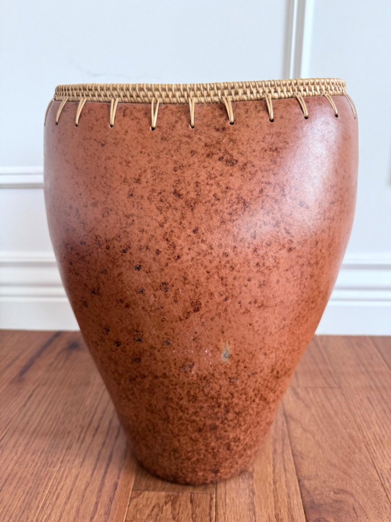 Terracotta Art Pottery Vessel Set with Woven Rims Set of four hand-formed terracotta art pottery vessels, each featuring a rounded body and a rim threaded with natural fiber lacing through pierced openings. Three vessels are open at the top; one includes a fitted lid topped with a sculpted animal figure and finished with a coiled woven edge. The surfaces show varied tones and irregularities from the firing process. The design and detailing are reminiscent of traditional Lombok pottery, though the pieces are unmarked. Estimated Dimensions: Vessel 1: 15" H x 11" W Vessel 2: 14" H x 11" W Vessel 3: 11" H x 9" W Lidded Vessel: 10" H x 6" W