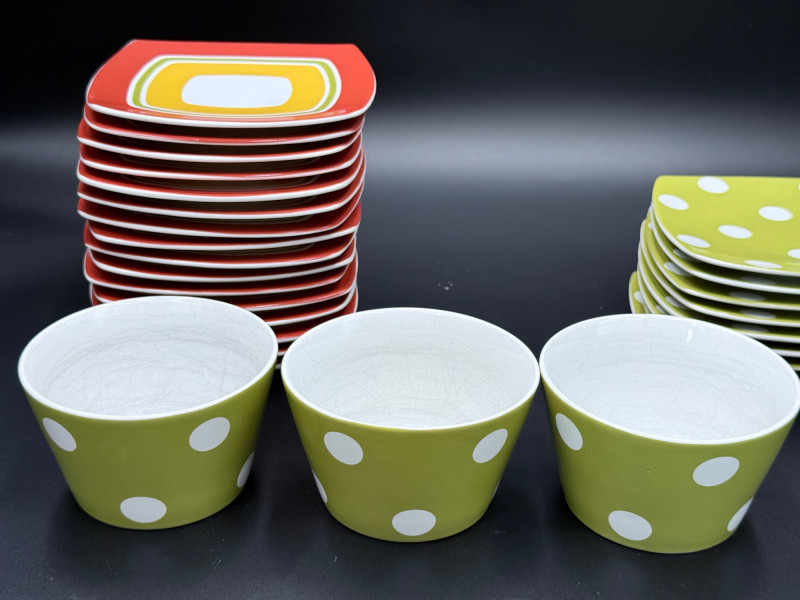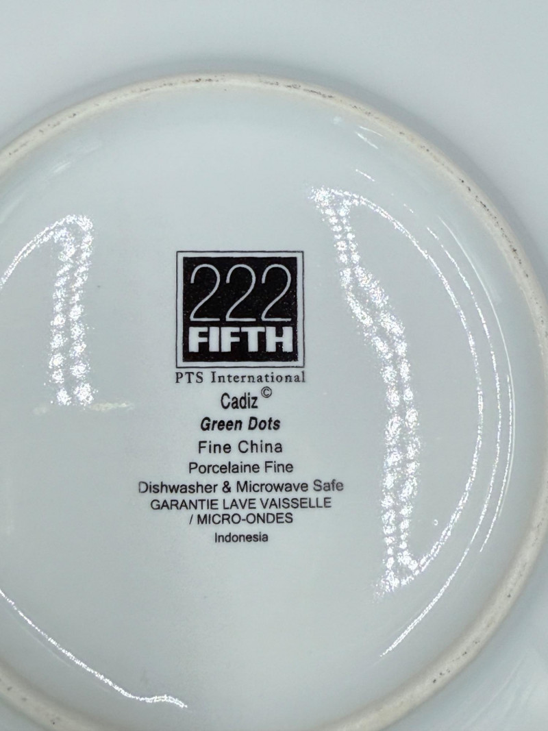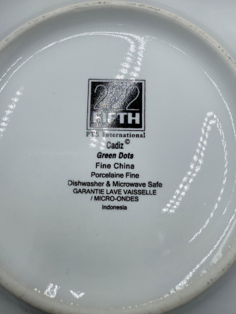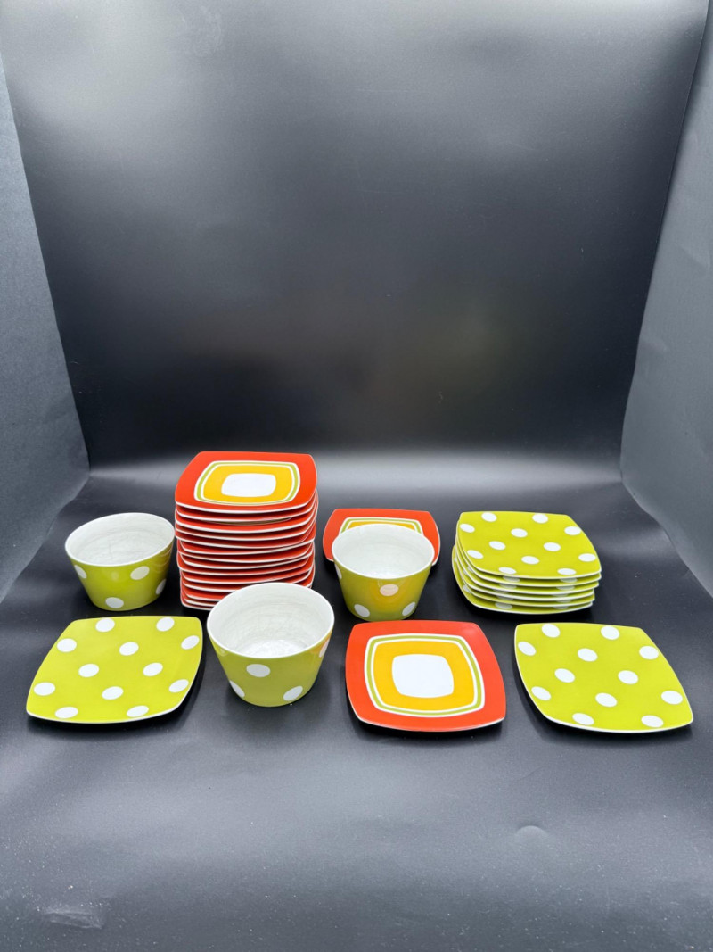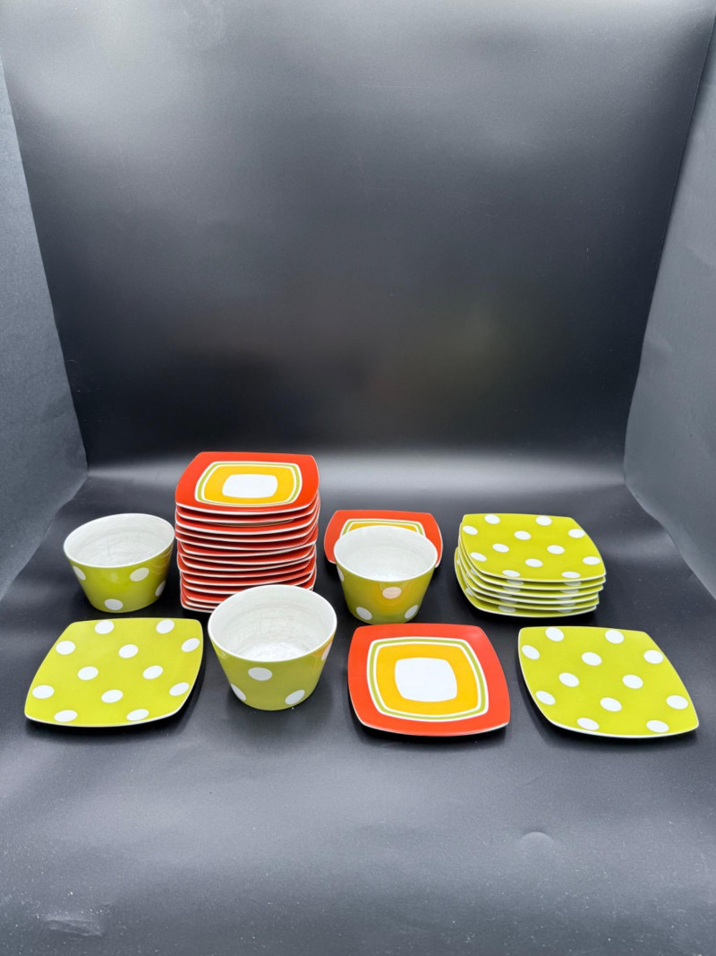 222 Fifth Fine China Plate and Bowl Set – 27 Pieces A coordinated set of fine china tableware from the “Cadiz Green Dots” and geometric square plate series by 222 Fifth, PTS International. The collection includes: 8 square plates with a green background and white polka dots 16 square plates in red-orange with layered central blocks of white, orange, and yellow 3 bowls with tapered sides, green exterior, and white polka dots All pieces are porcelain, dishwasher- and microwave-safe, and marked on the base. Category: Tableware / Serveware Plates: 6" Bowls: 4.5" diameter