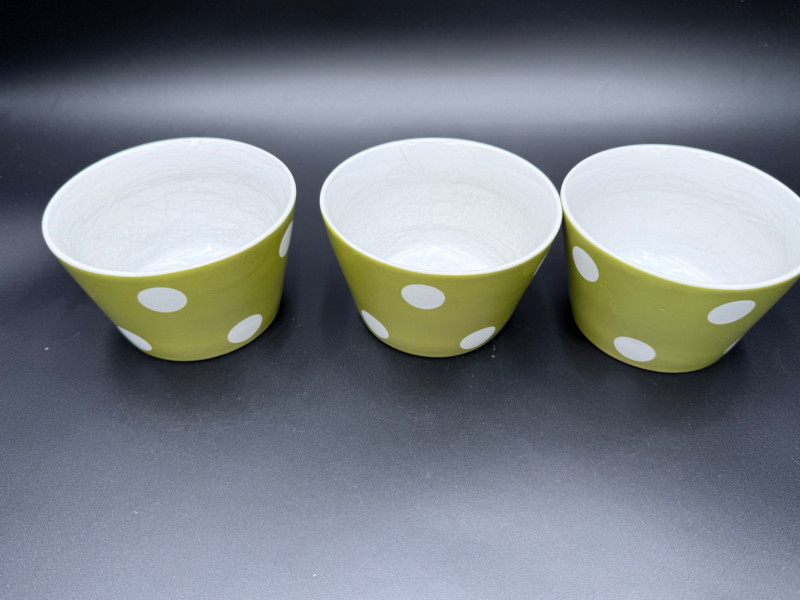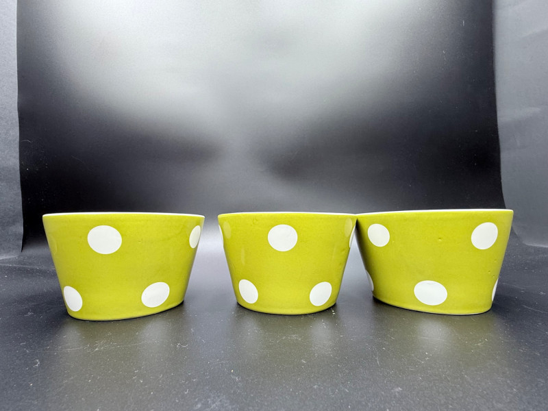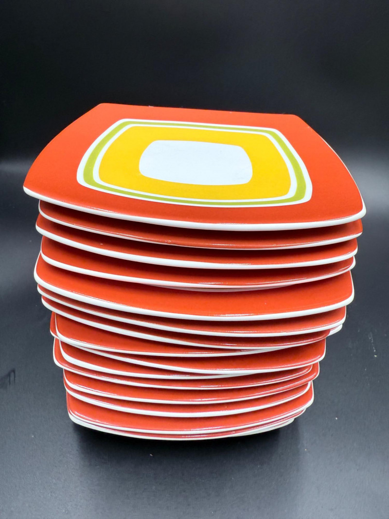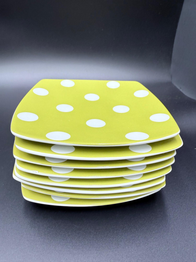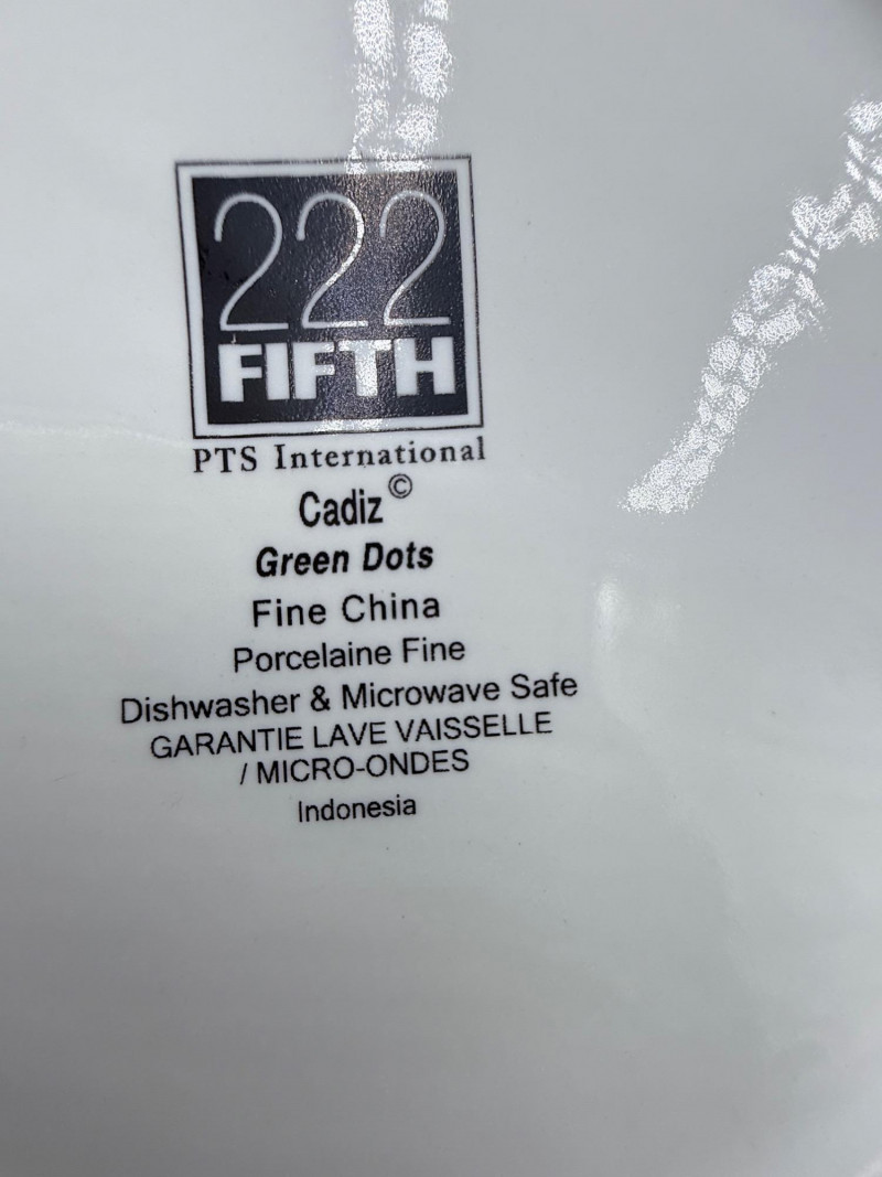 222 Fifth Fine China Plate and Bowl Set – 27 Pieces A coordinated set of fine china tableware from the “Cadiz Green Dots” and geometric square plate series by 222 Fifth, PTS International. The collection includes: 8 square plates with a green background and white polka dots 16 square plates in red-orange with layered central blocks of white, orange, and yellow 3 bowls with tapered sides, green exterior, and white polka dots All pieces are porcelain, dishwasher- and microwave-safe, and marked on the base. Category: Tableware / Serveware Plates: 6" Bowls: 4.5" diameter