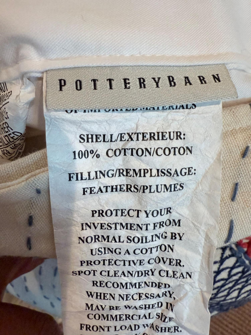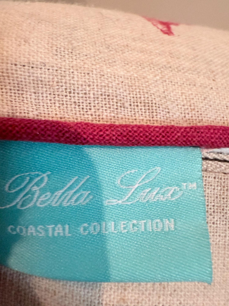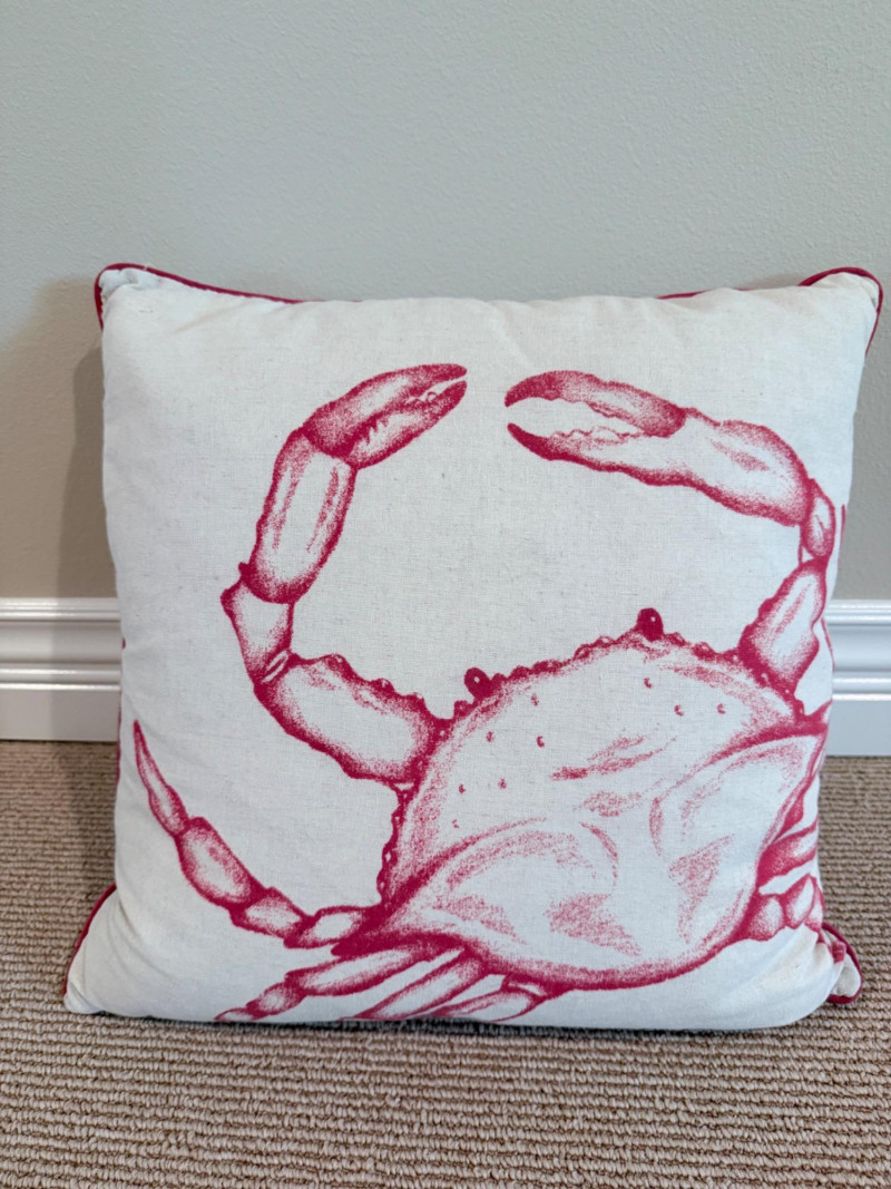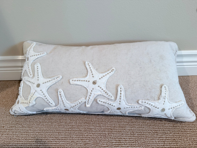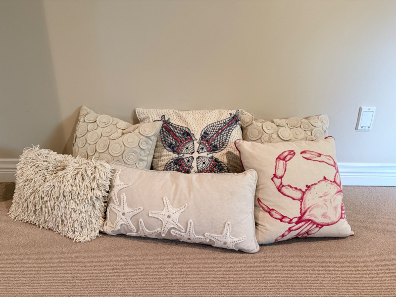 Coastal-Inspired Pillow Collection – Set of 6 Set of six decorative pillows featuring a range of coastal themes, patterns, and textures. One square pillow shows four embroidered fish in mirrored alignment, with a tag identifying it as a Pottery Barn piece filled with 95% waterfowl feathers and 5% down. Two square pillows are constructed with concentric circle appliqués across the front surface. One lumbar pillow is covered in overlapping starfish forms stitched to a plain ground. Another lumbar pillow has looped yarns creating a textured pile surface. The sixth pillow is a square form printed with a large red crab graphic. One pillow bears a Bella Lux Coastal Collection label. Fish embroidered pillow: 24" Two circle motif pillows: 20" Textured pillow: 12" x 19" Starfish pillow: 26" x 12" Crab pillow: 19"