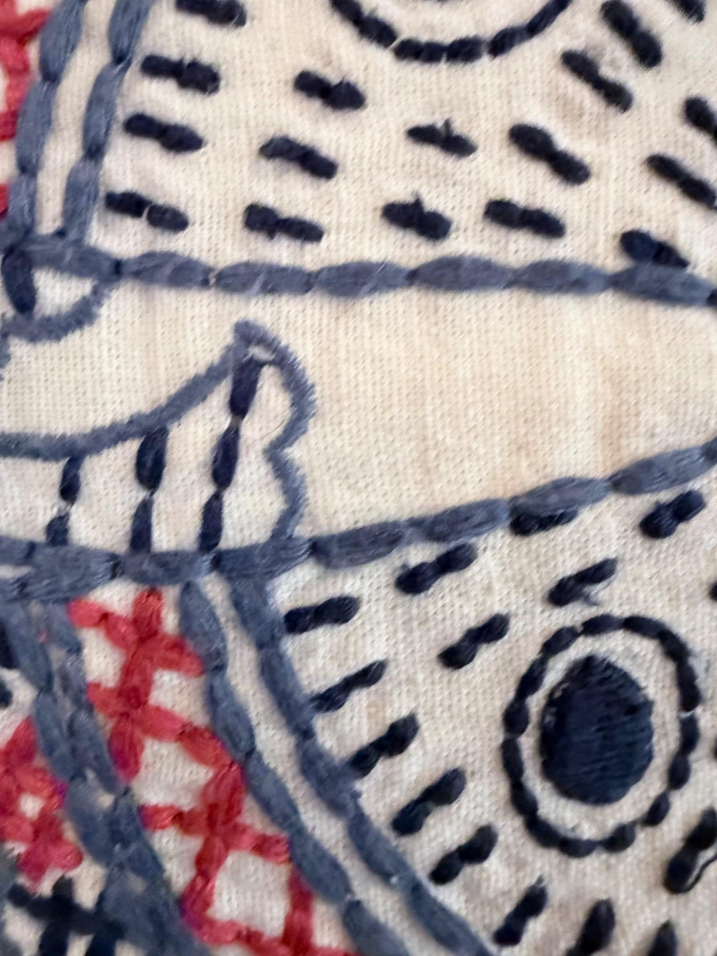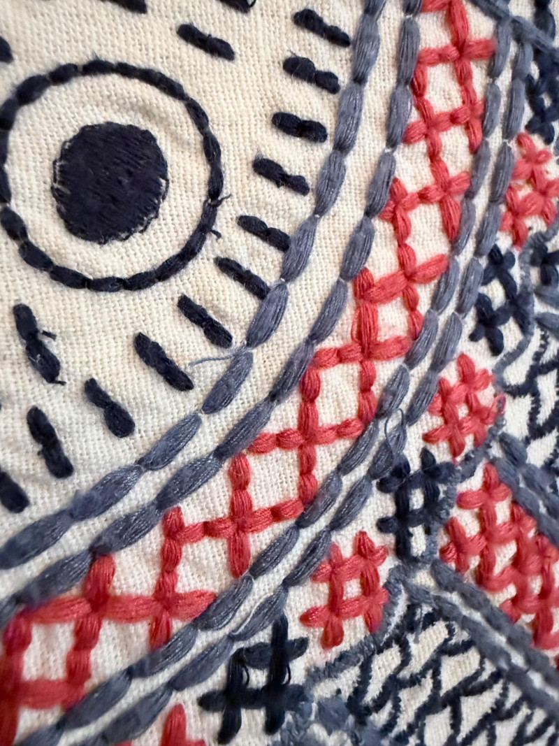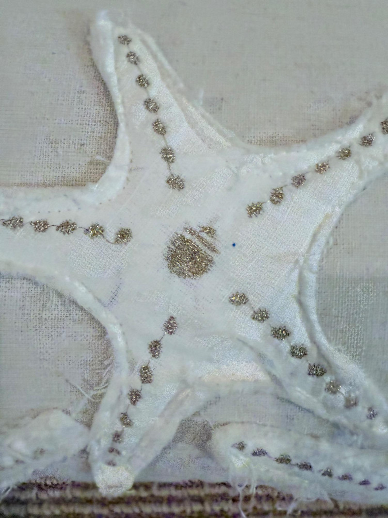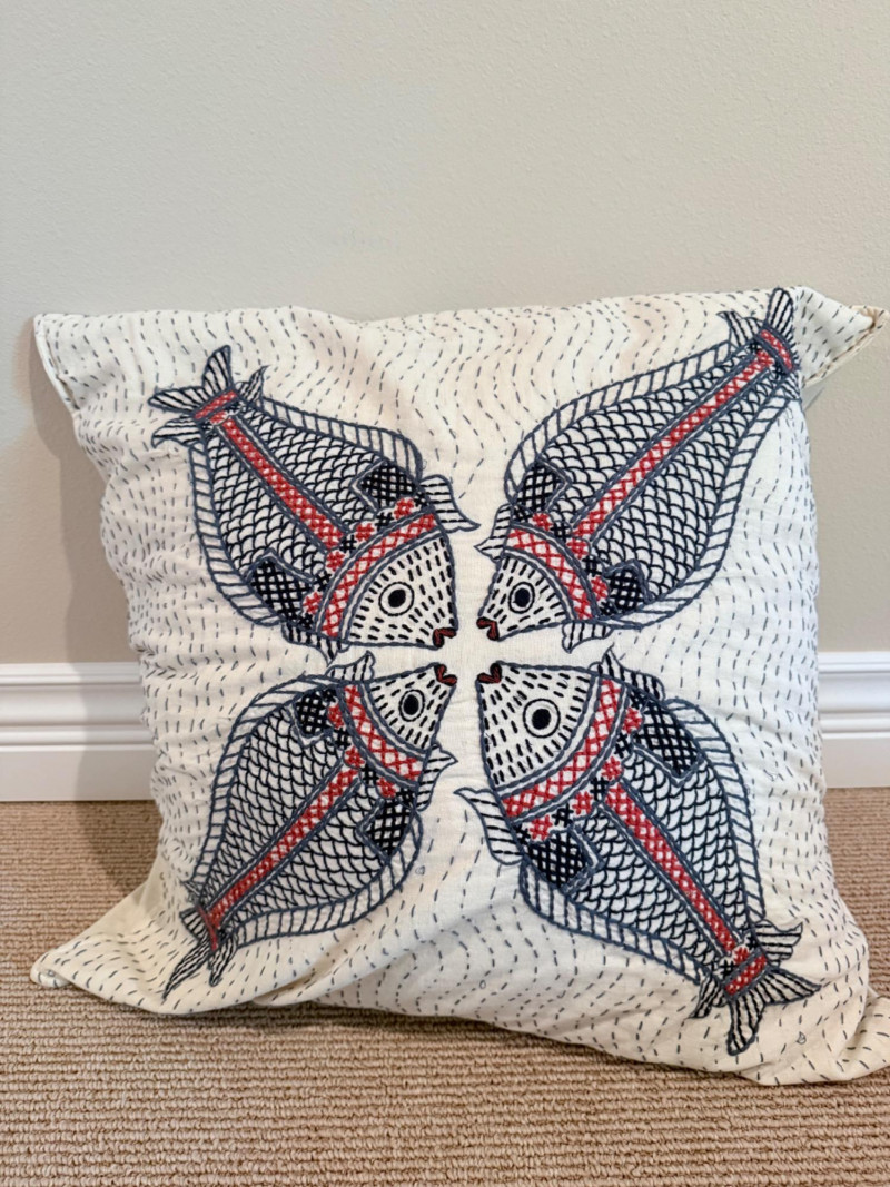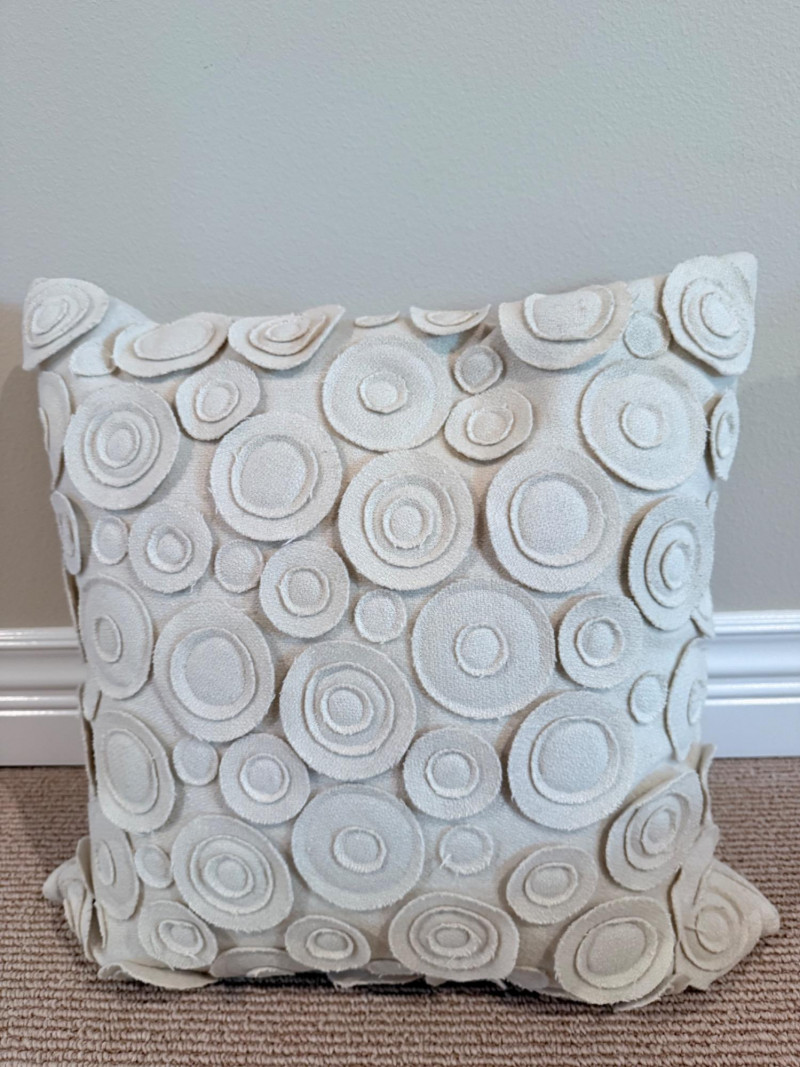 Coastal-Inspired Pillow Collection – Set of 6 Set of six decorative pillows featuring a range of coastal themes, patterns, and textures. One square pillow shows four embroidered fish in mirrored alignment, with a tag identifying it as a Pottery Barn piece filled with 95% waterfowl feathers and 5% down. Two square pillows are constructed with concentric circle appliqués across the front surface. One lumbar pillow is covered in overlapping starfish forms stitched to a plain ground. Another lumbar pillow has looped yarns creating a textured pile surface. The sixth pillow is a square form printed with a large red crab graphic. One pillow bears a Bella Lux Coastal Collection label. Fish embroidered pillow: 24" Two circle motif pillows: 20" Textured pillow: 12" x 19" Starfish pillow: 26" x 12" Crab pillow: 19"