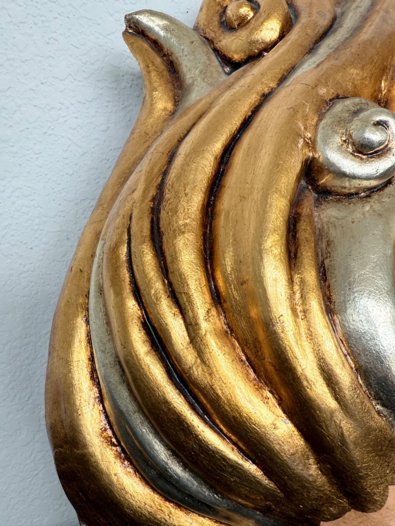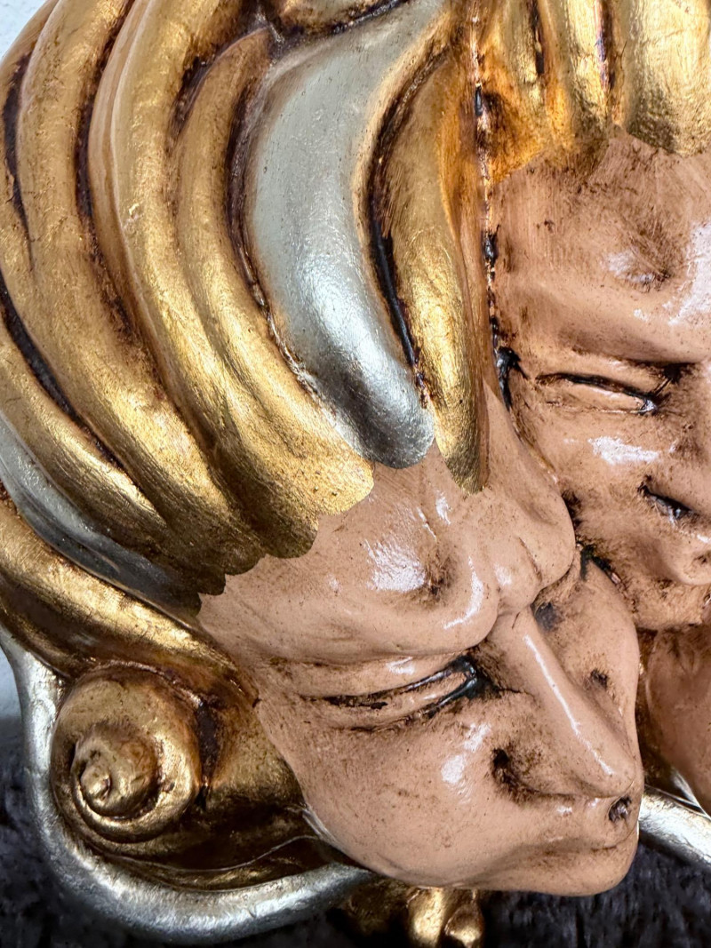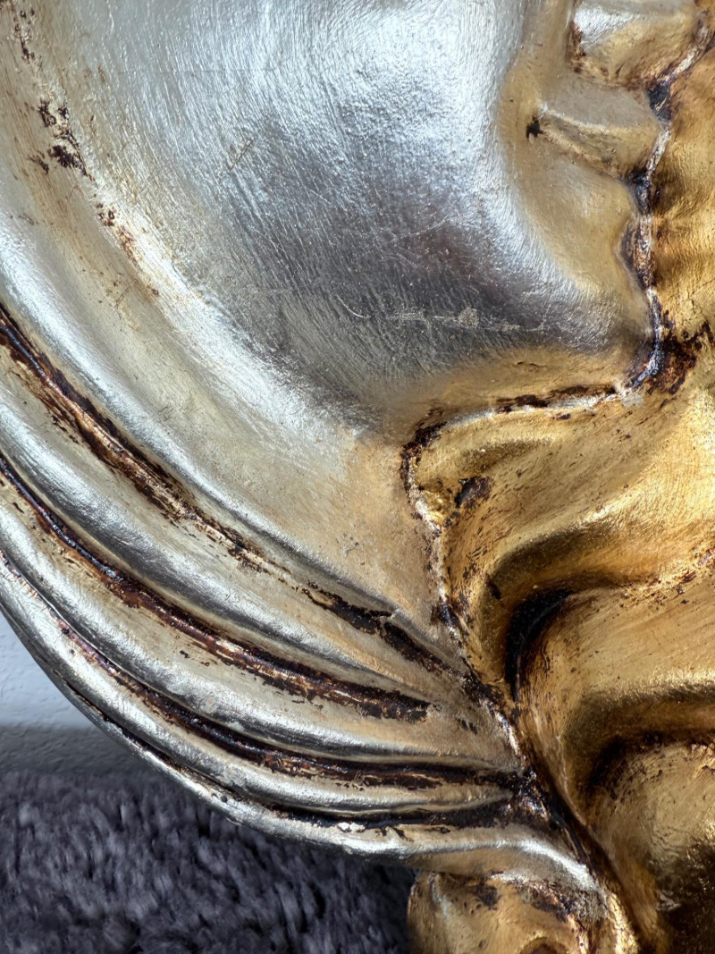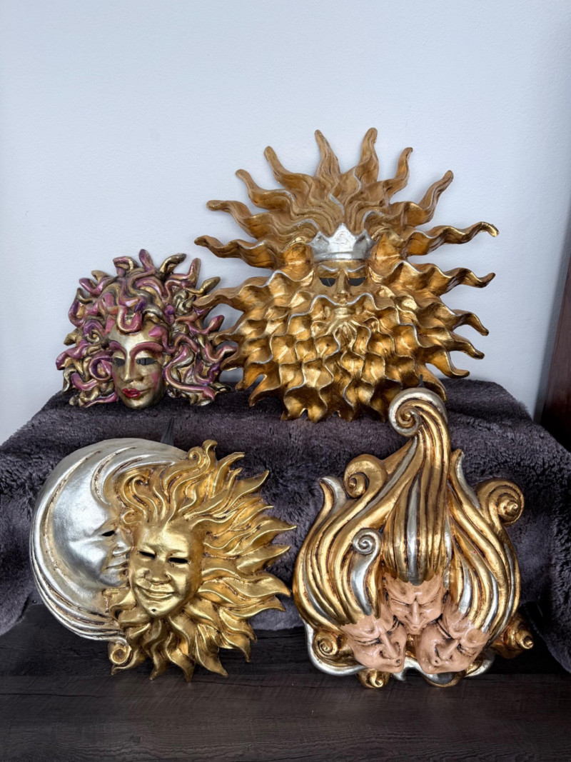 Four Wall Masks – Resin Painted with Mythological & Celestial Figures Wall-mounted sculptural masks made of resin and painted in metallic and polychrome finishes. Each mask depicts a mythological or celestial figure, molded in relief with stylized facial features. All are prepared for wall display. Set Includes: