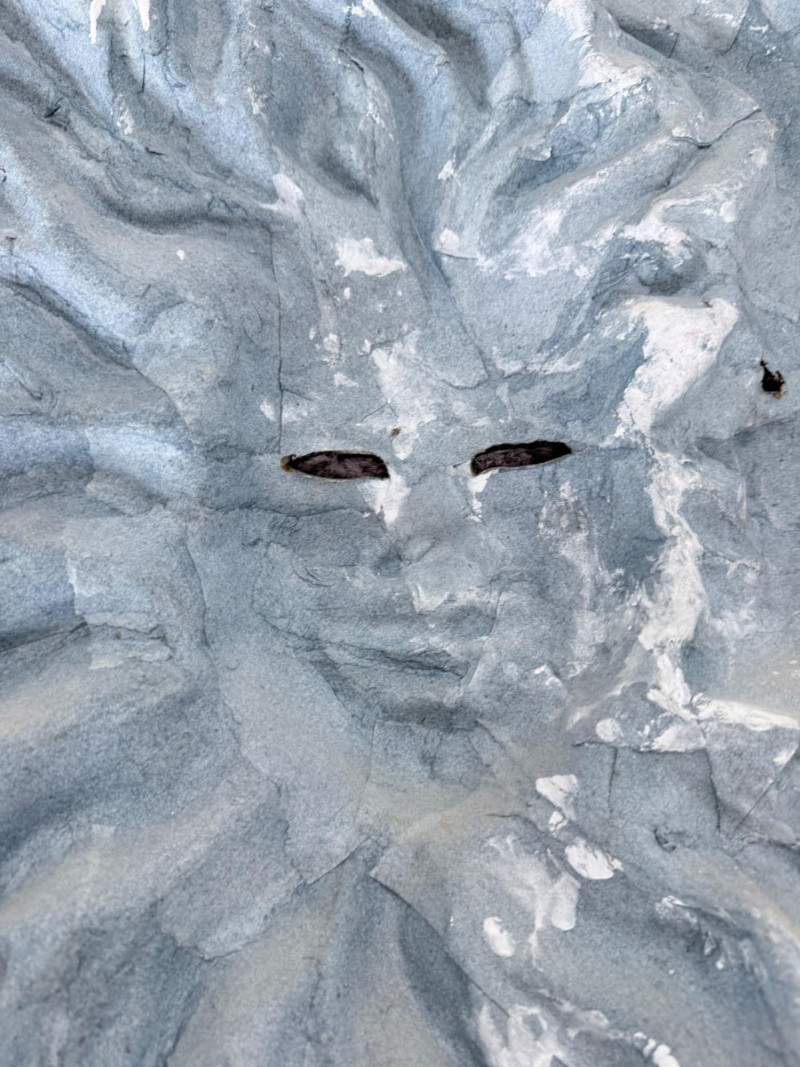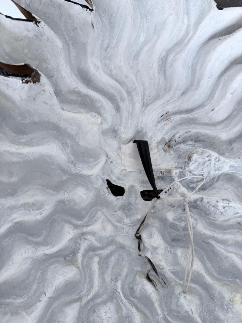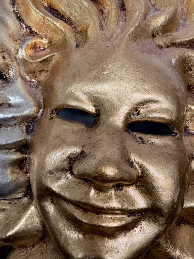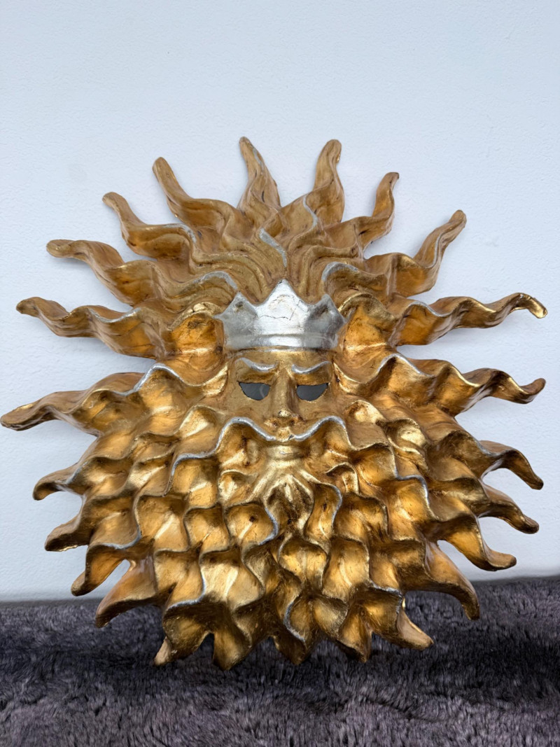 Circular wall-mounted mask representing a crowned sun face with radiating, flame-like strands.