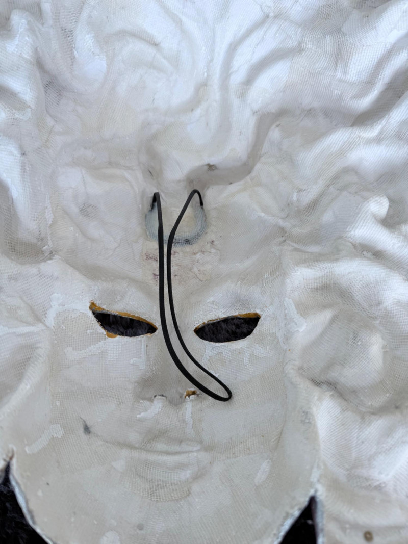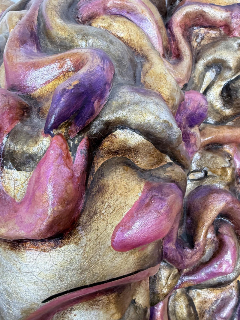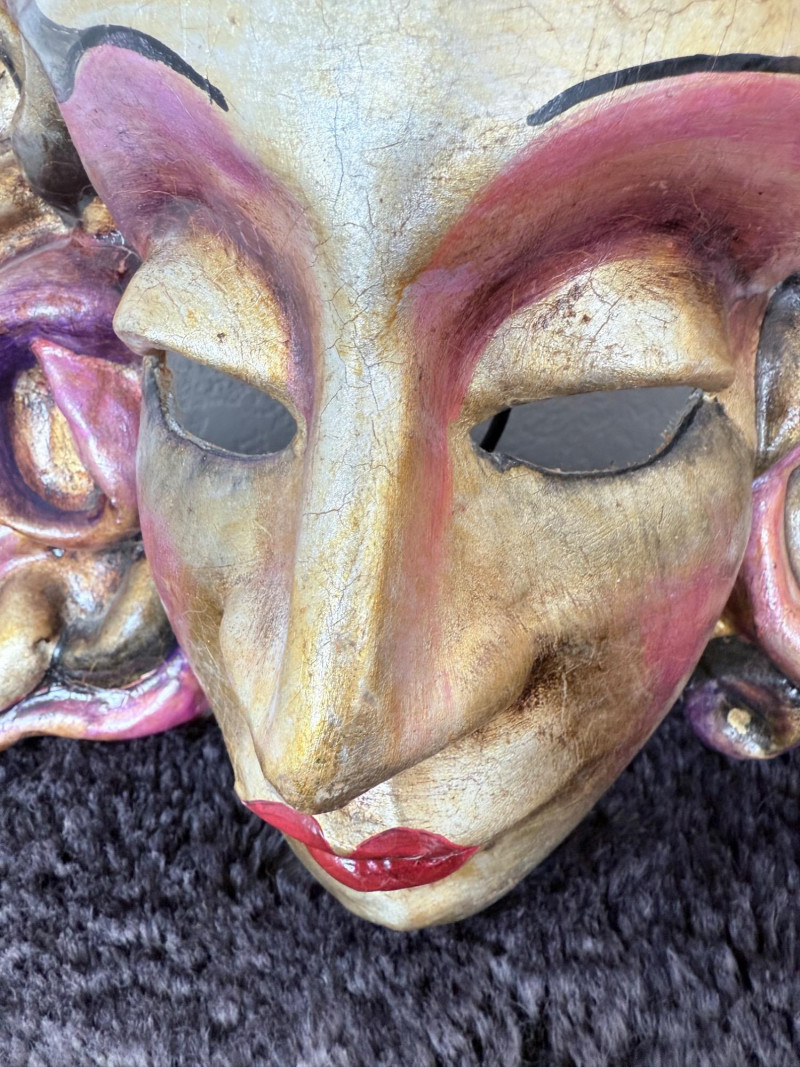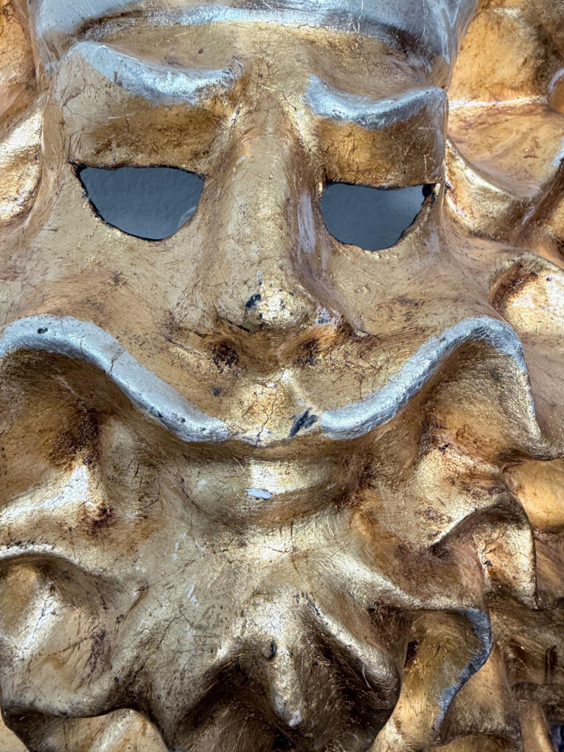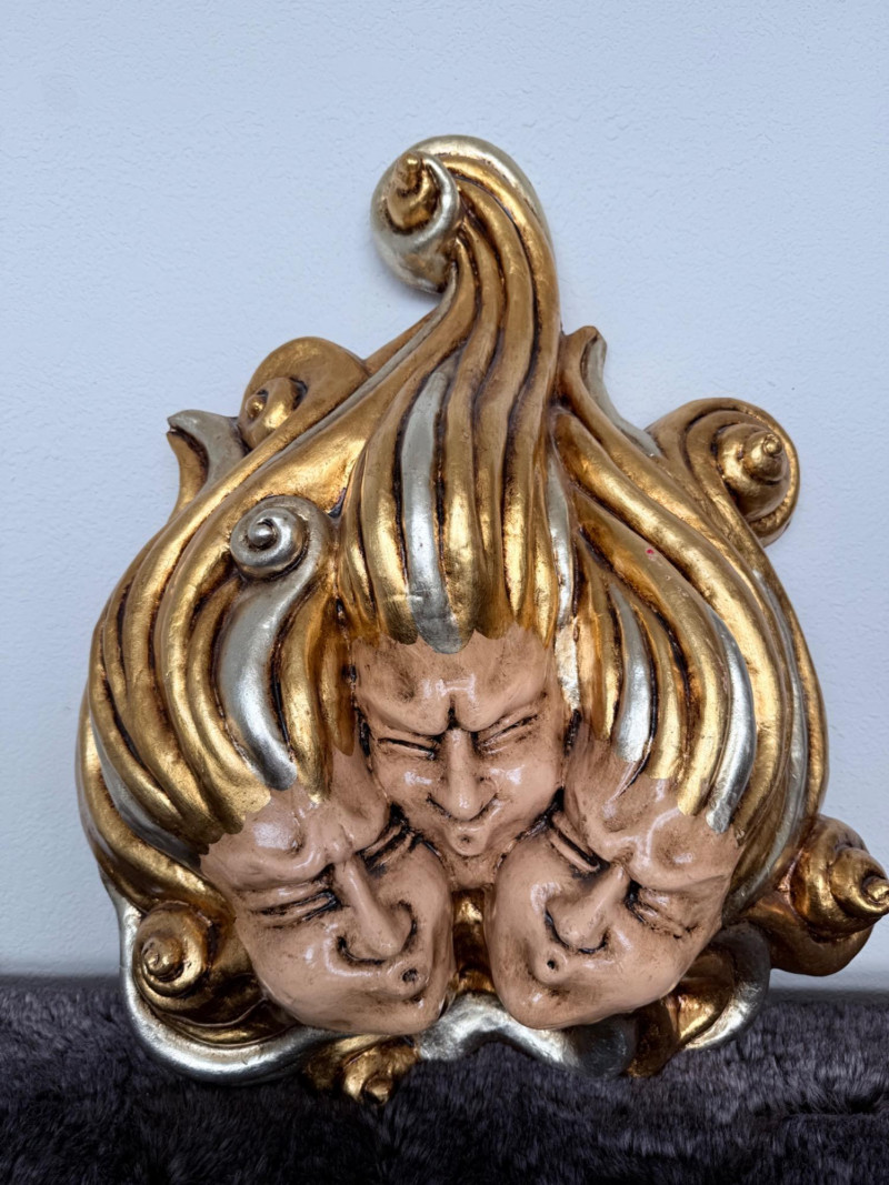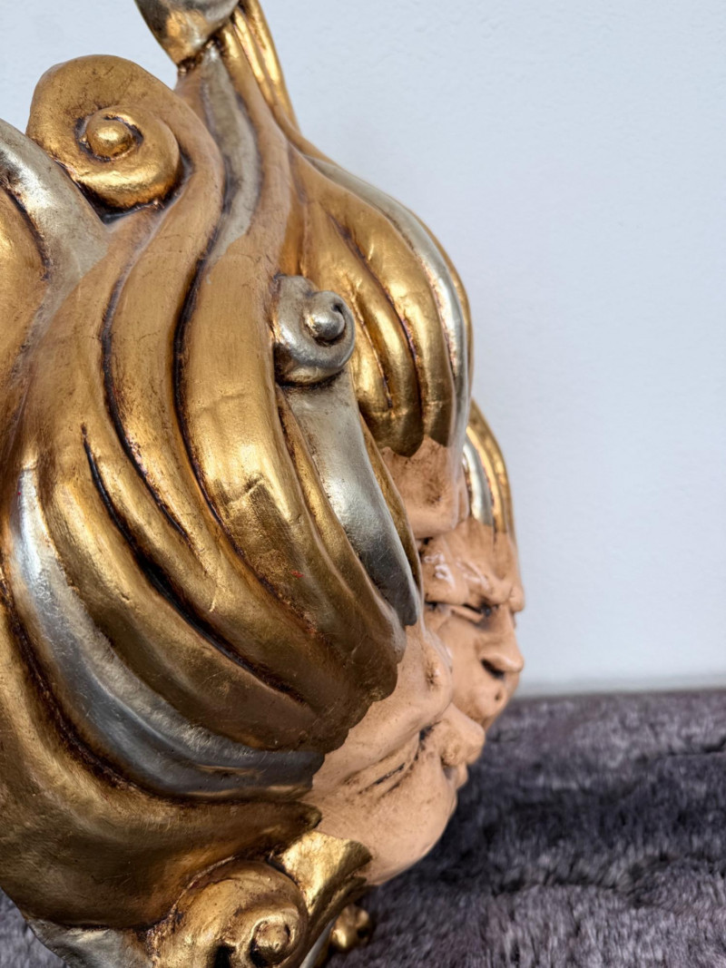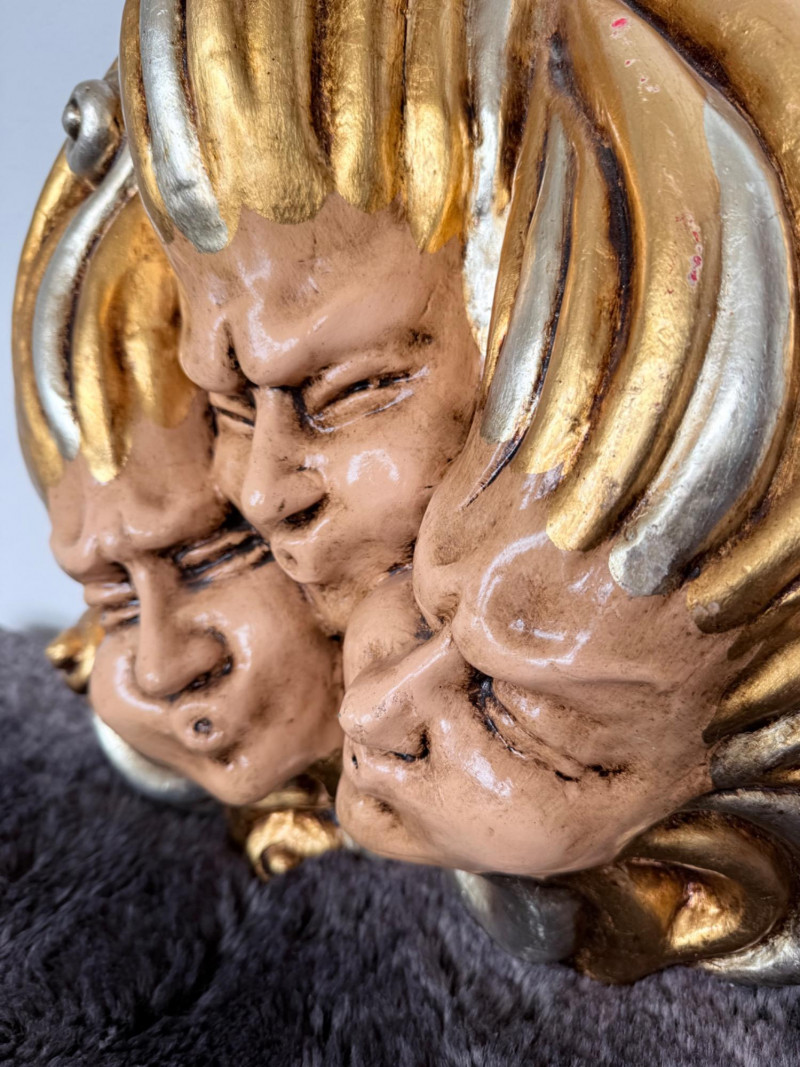 Wall-mounted mask in Venetian-style design depicting three conjoined male faces arranged vertically. Each face is framed by upward sweeping, flame-like hair with spiral accents.