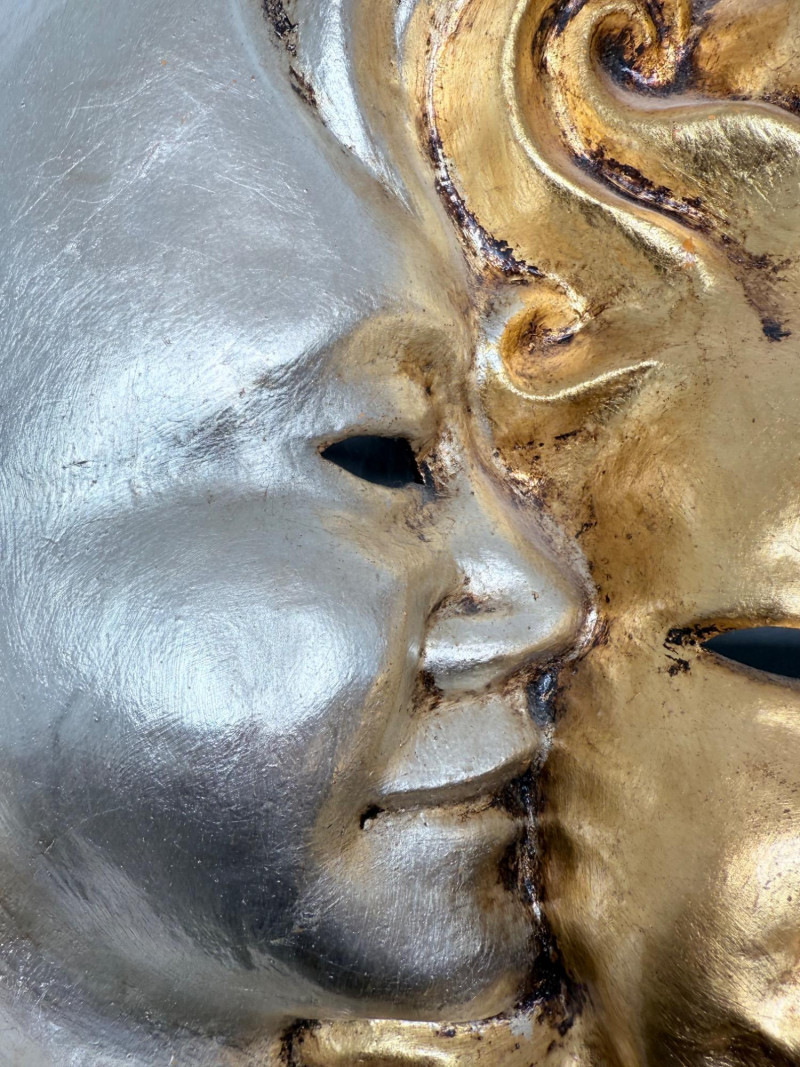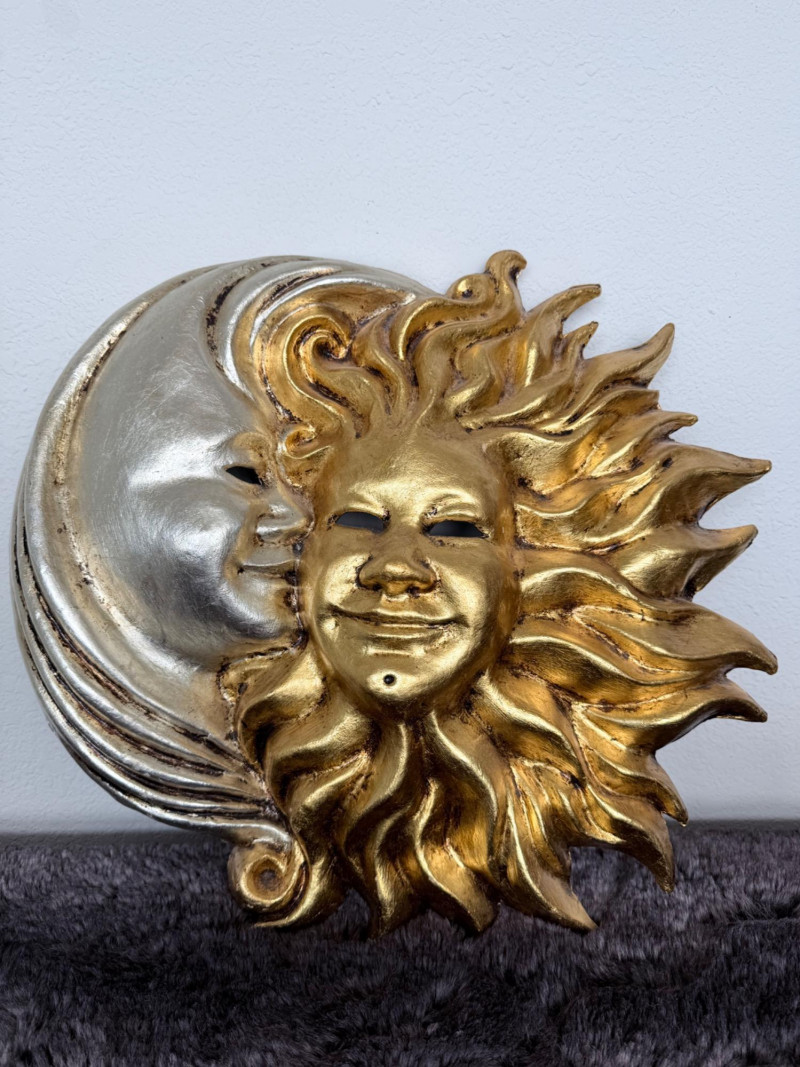Wall-mounted mask in Venetian-style design combining a crescent moon and a sun face in profile. The moon is rendered in silver tones, while the sun features gold-toned rays and a calm expression.