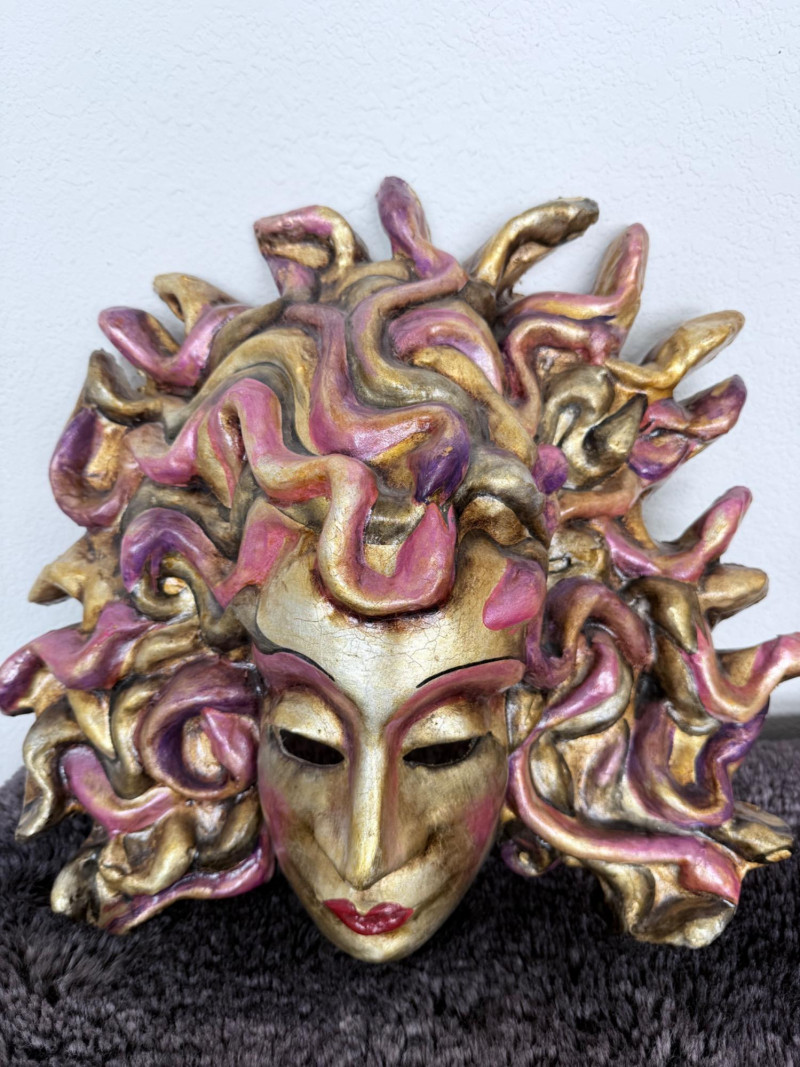 Wall-mounted mask portraying a stylized Medusa with a downward gaze and layered serpentine locks extending from the crown.